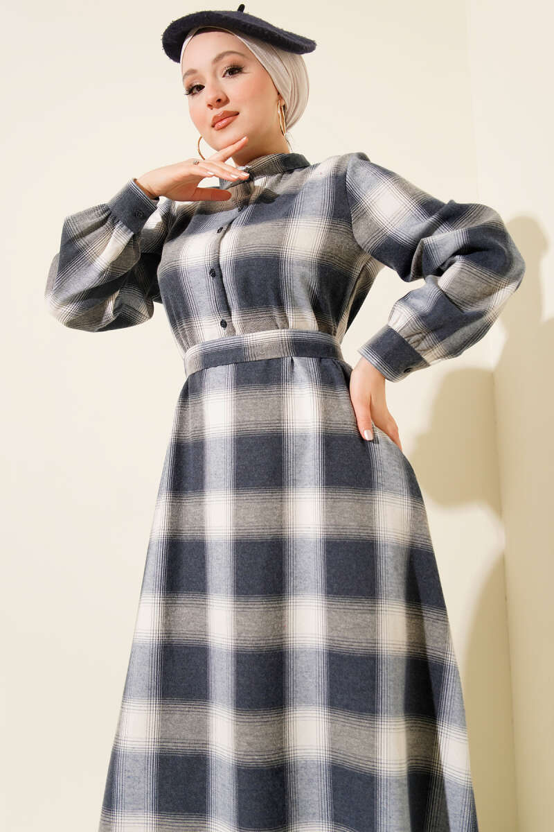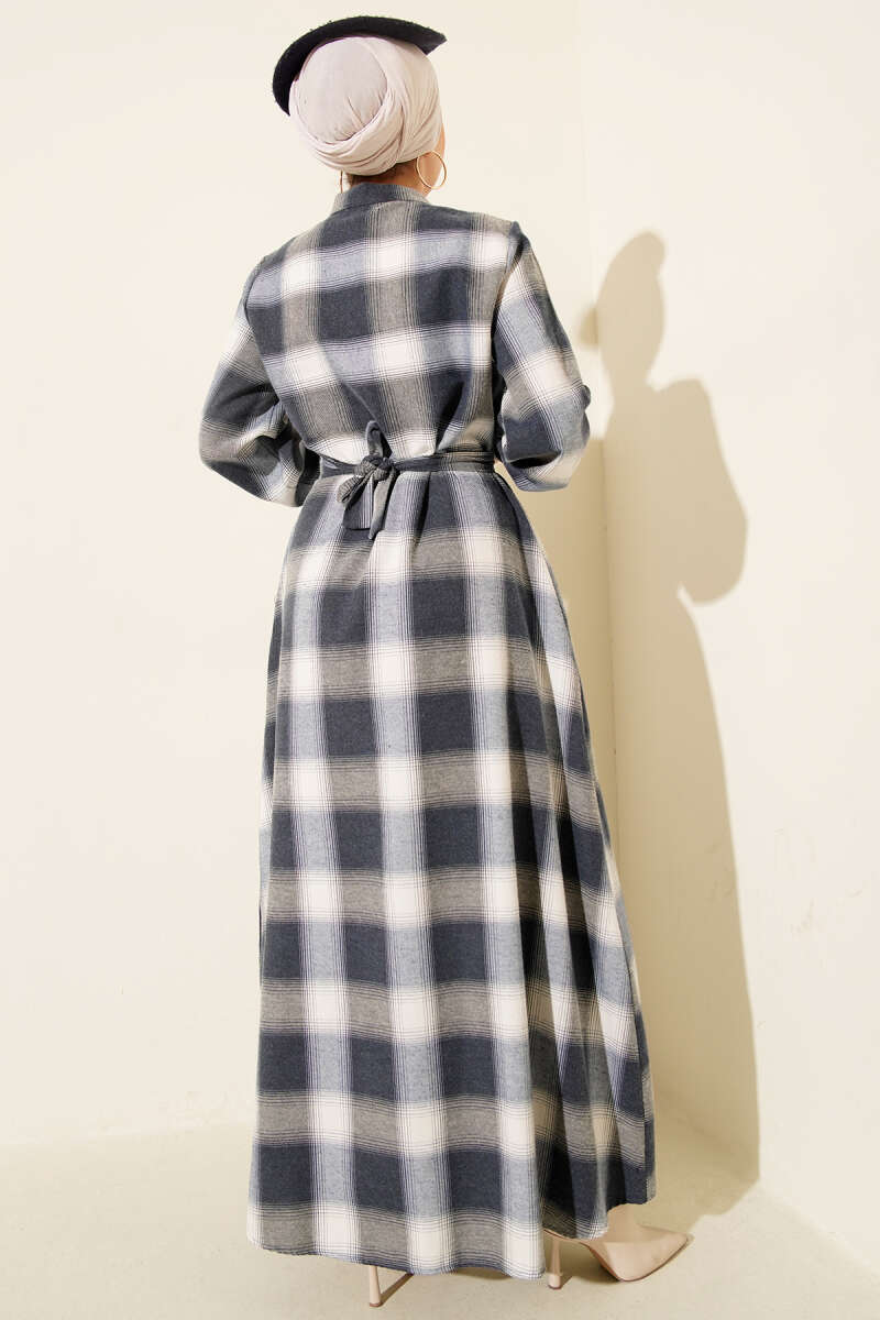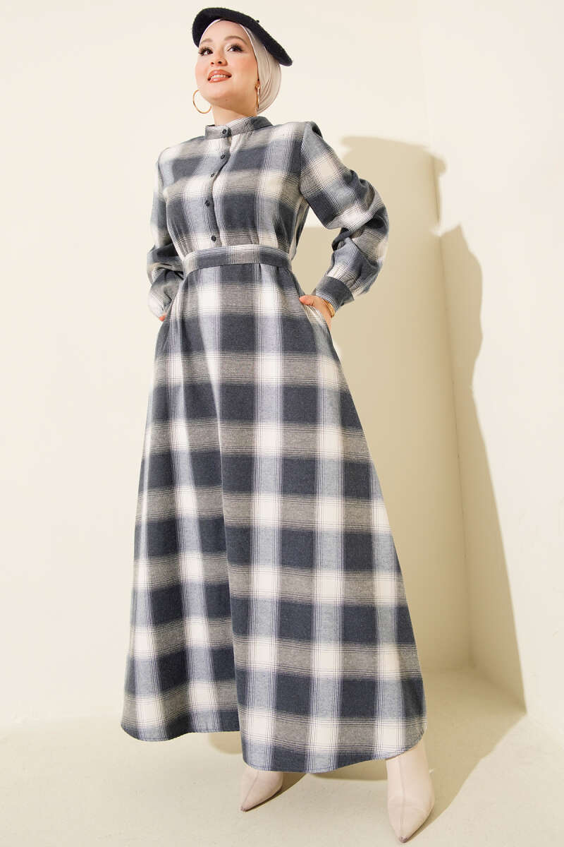 Önü Düğmeli Ekose Desen Elbise Siyah