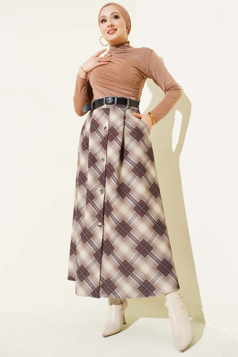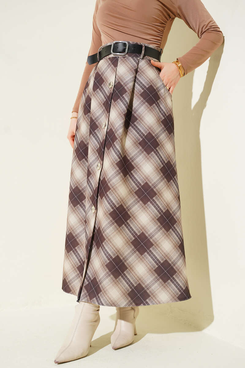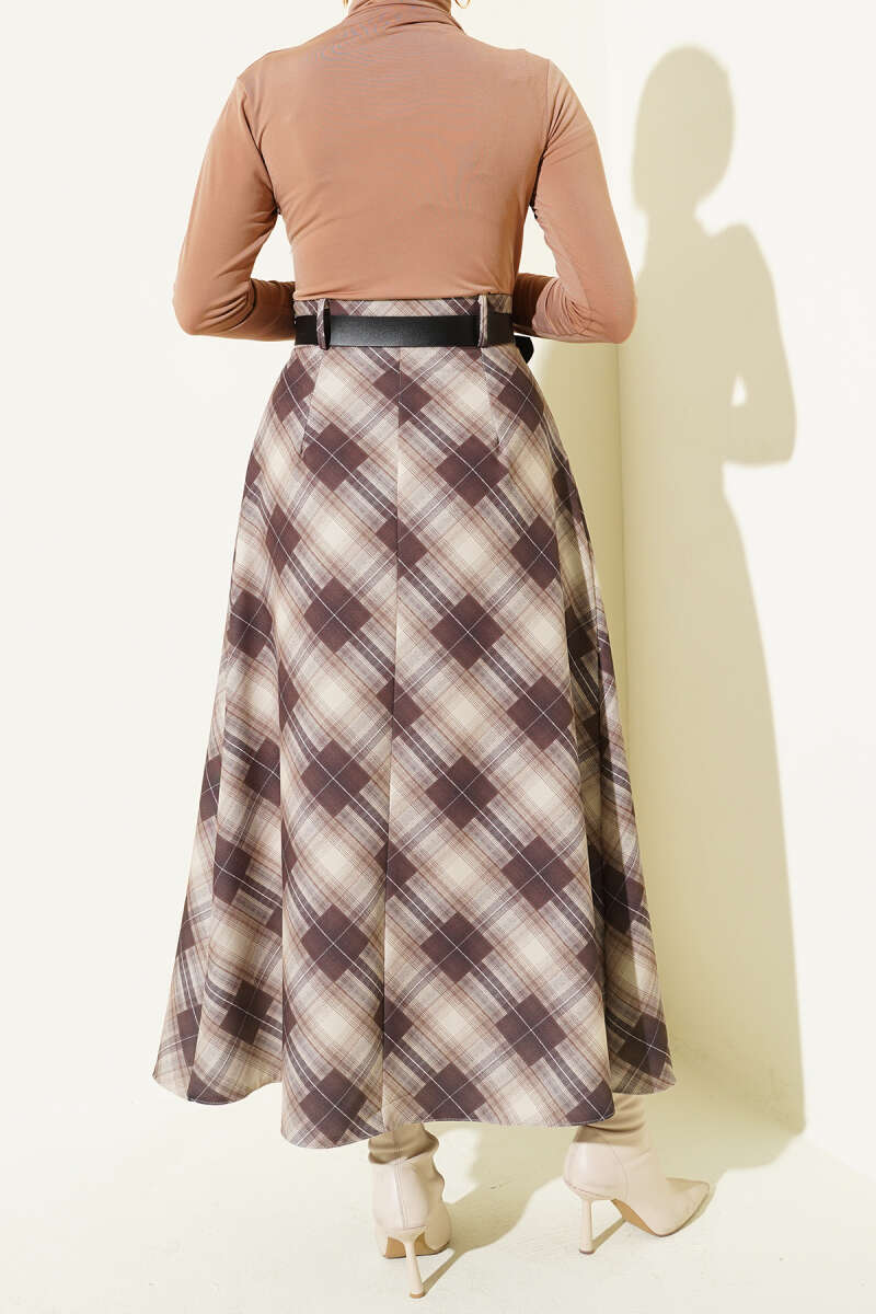 Ekose Desenli Fermuarlı Kaşe Etek Camel