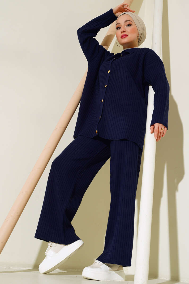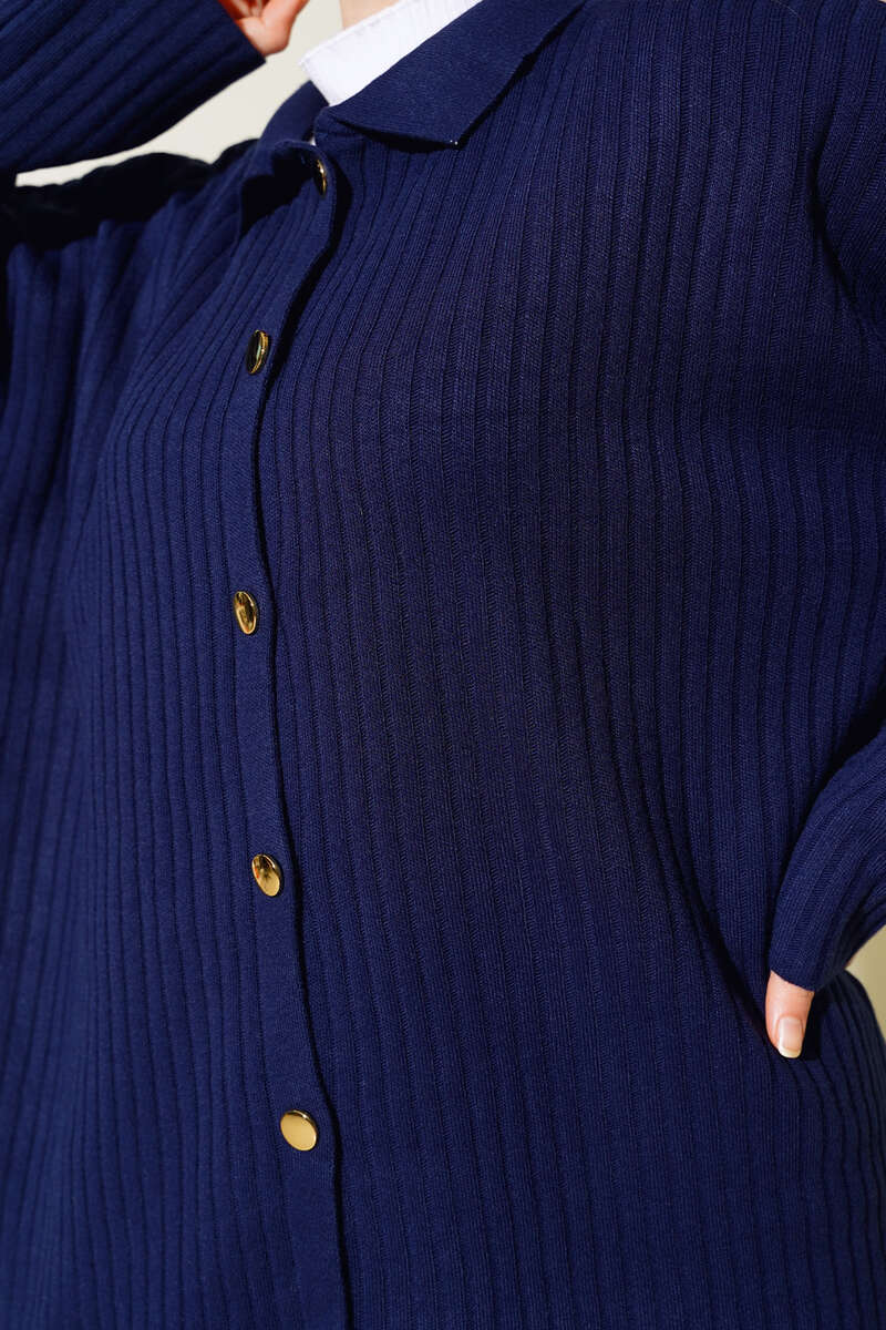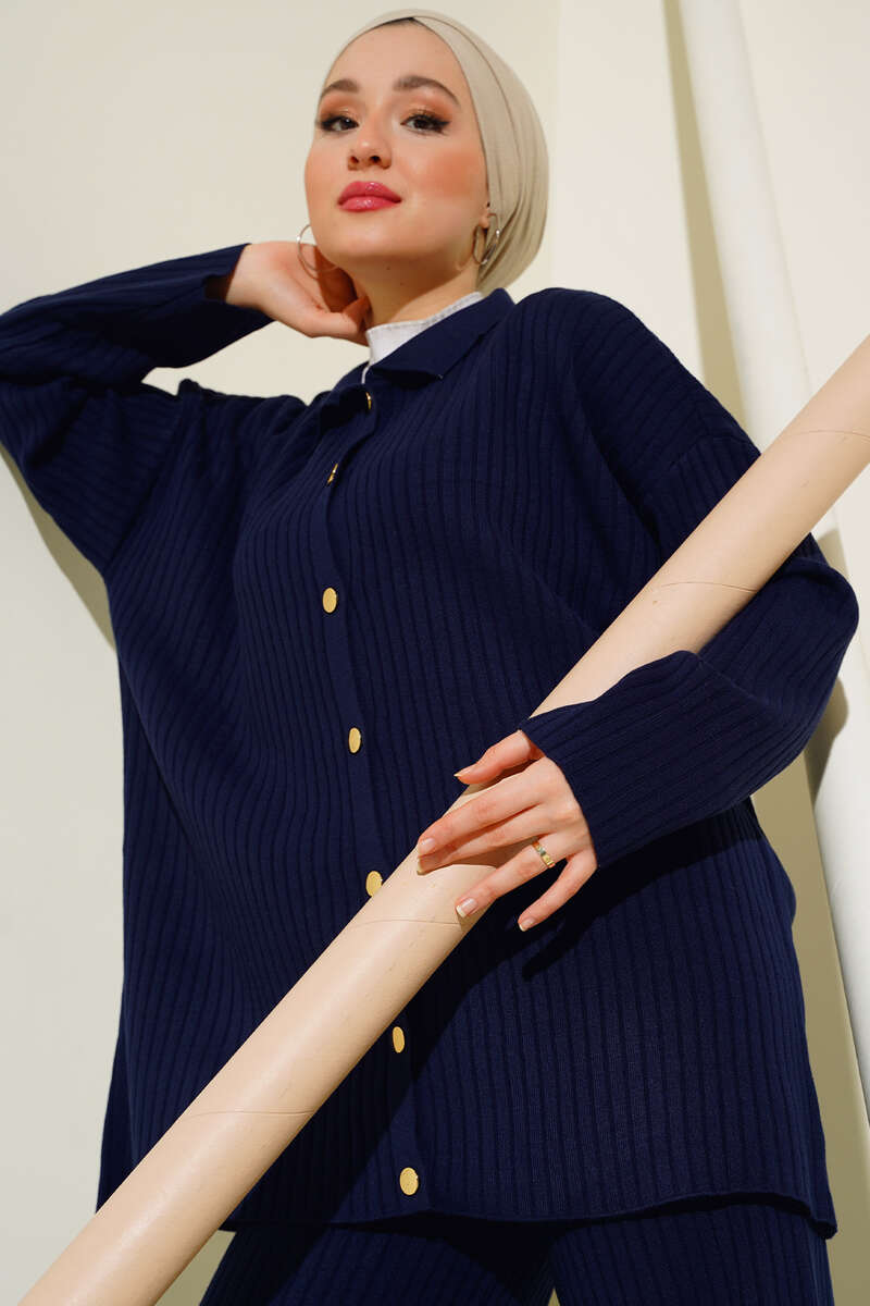 Önü Düğmeli Fitilli Triko İkili Takım Lacivert