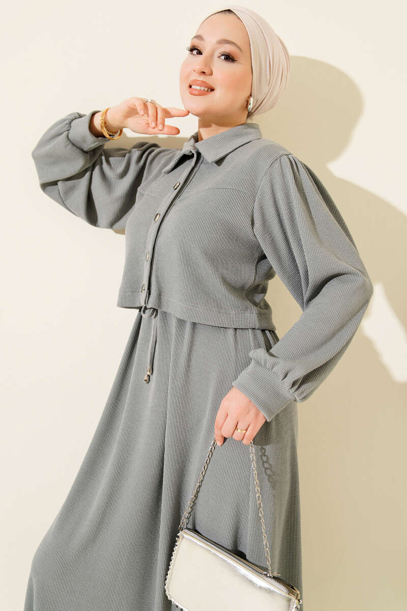 Düğmeli Pelerinli Triko Elbise Takım Vizon