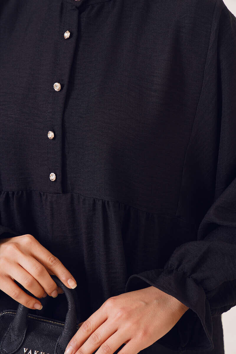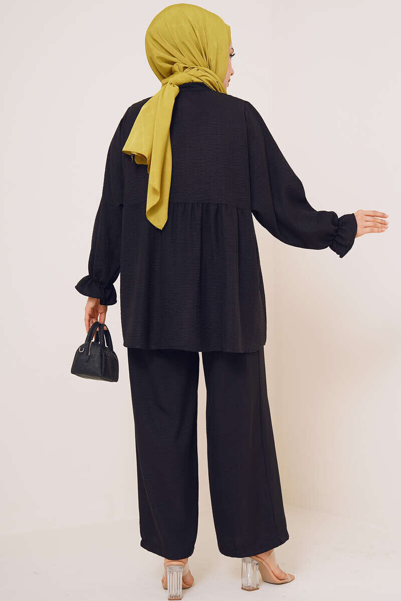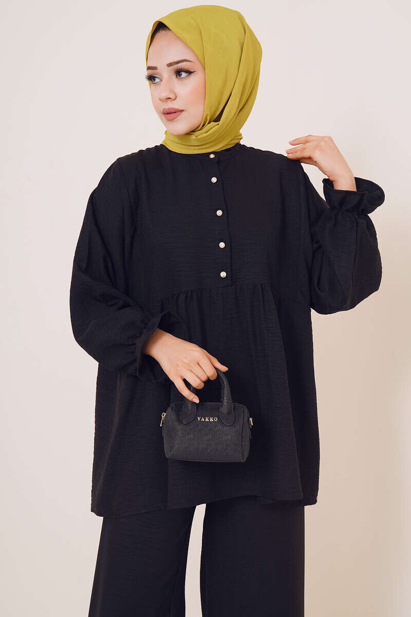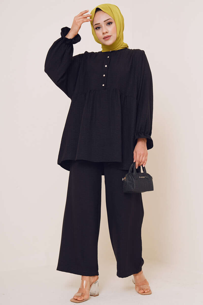 Yeni sezon ikili takımımız pantolon ve tunikten oluşmaktadır. İkili takımımızın tuniği hakim yakadır. Yakasına eşlik eden beş adet düğme parlak taşlıdır. Beli büzgü detaylı olan tuniğimizin bilekleri lastiklidir. İkili takımımızın pantolonu yüksek bel ve beli lastiklidir. Bol paça olan pantolonumuzun pens detaylar vardır.