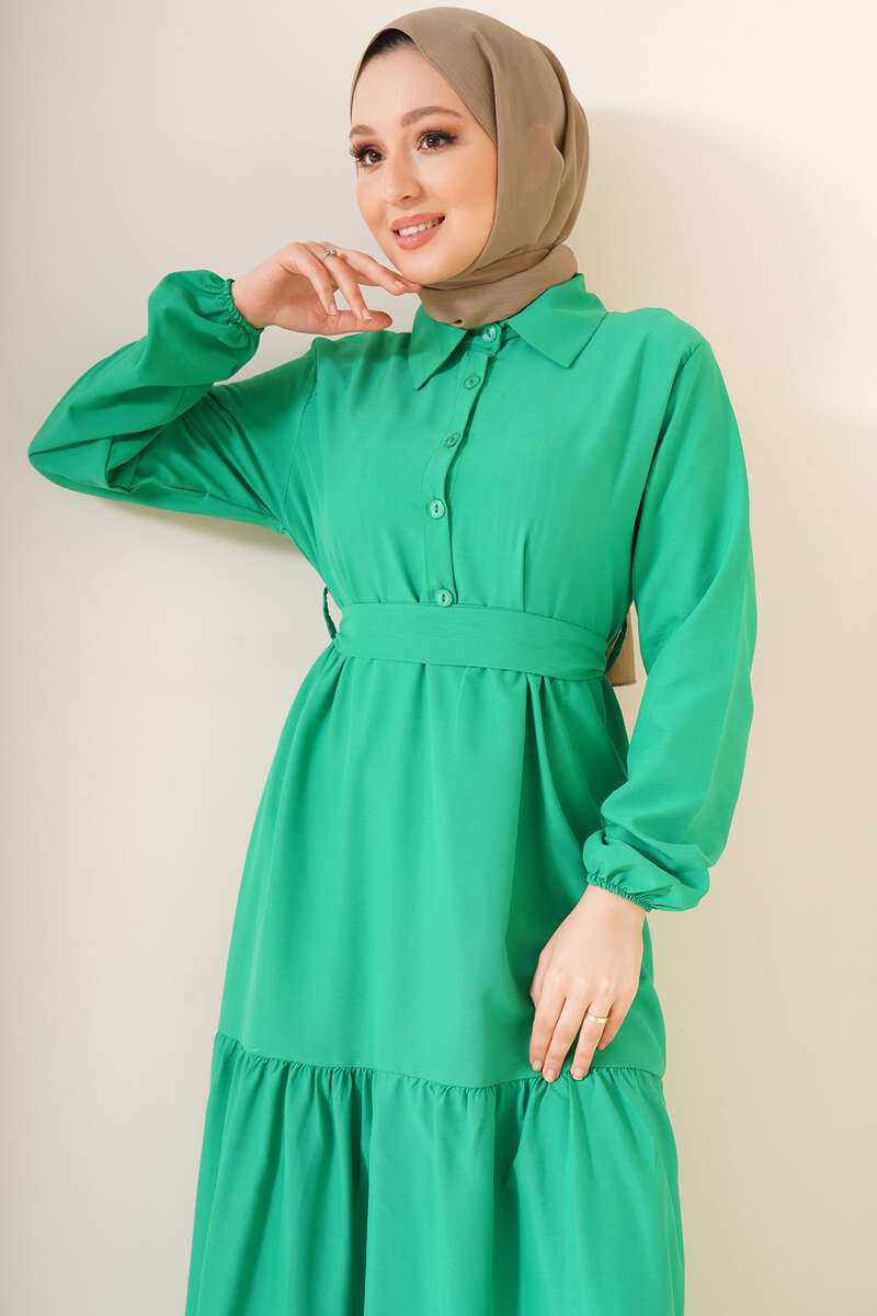 Yeni sezon elbisemiz şık ve sade görünümüyle sizler için geldi. Elbisemiz kat modeldir. Önü düğmelidir. Gömlek yakalıdır. Bilekleri lastiklidğir. Kuşağı ve iki adet kemer köprüsü bulunmaktadır. Elbisemizi her ortamda rahatlıkla giyebilirsiniz. Farklı renk seçenekleri mevcuttur.