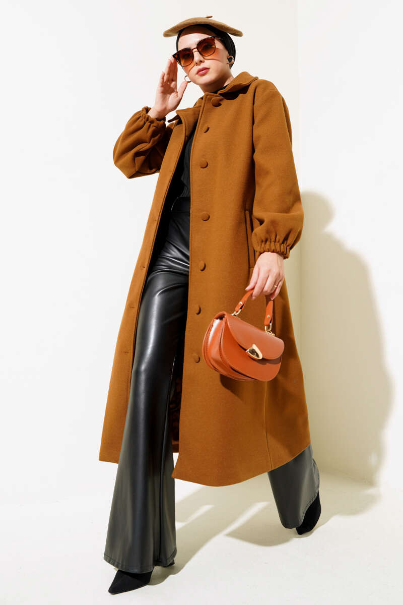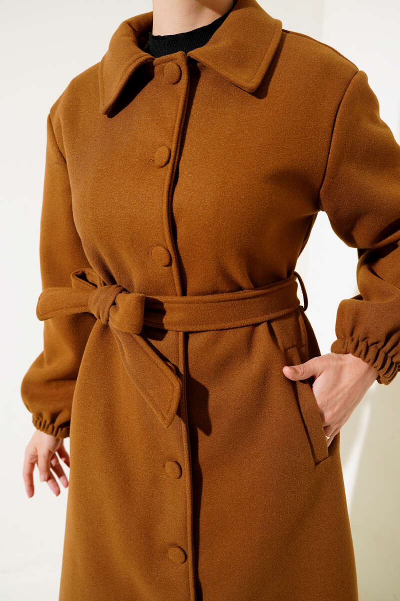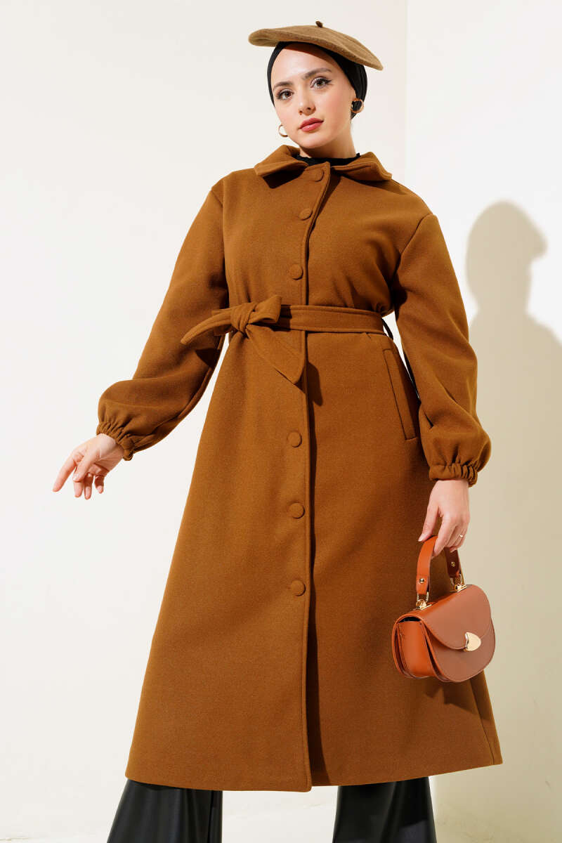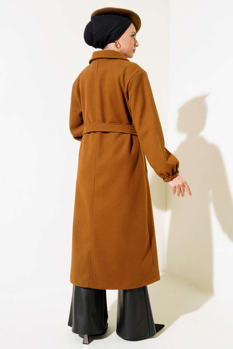 Önü Düğmeli Kuşaklı Kaşe Kaban Taba