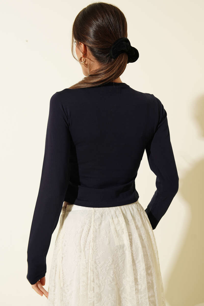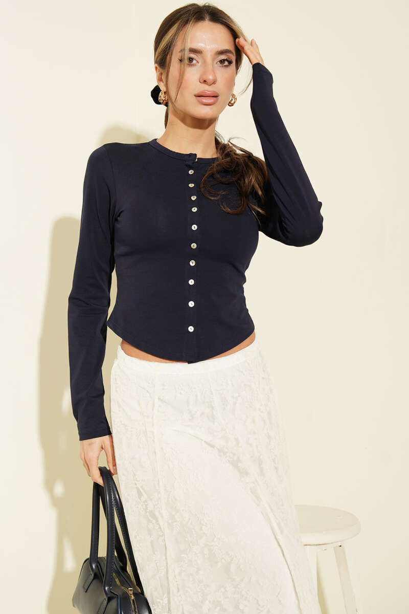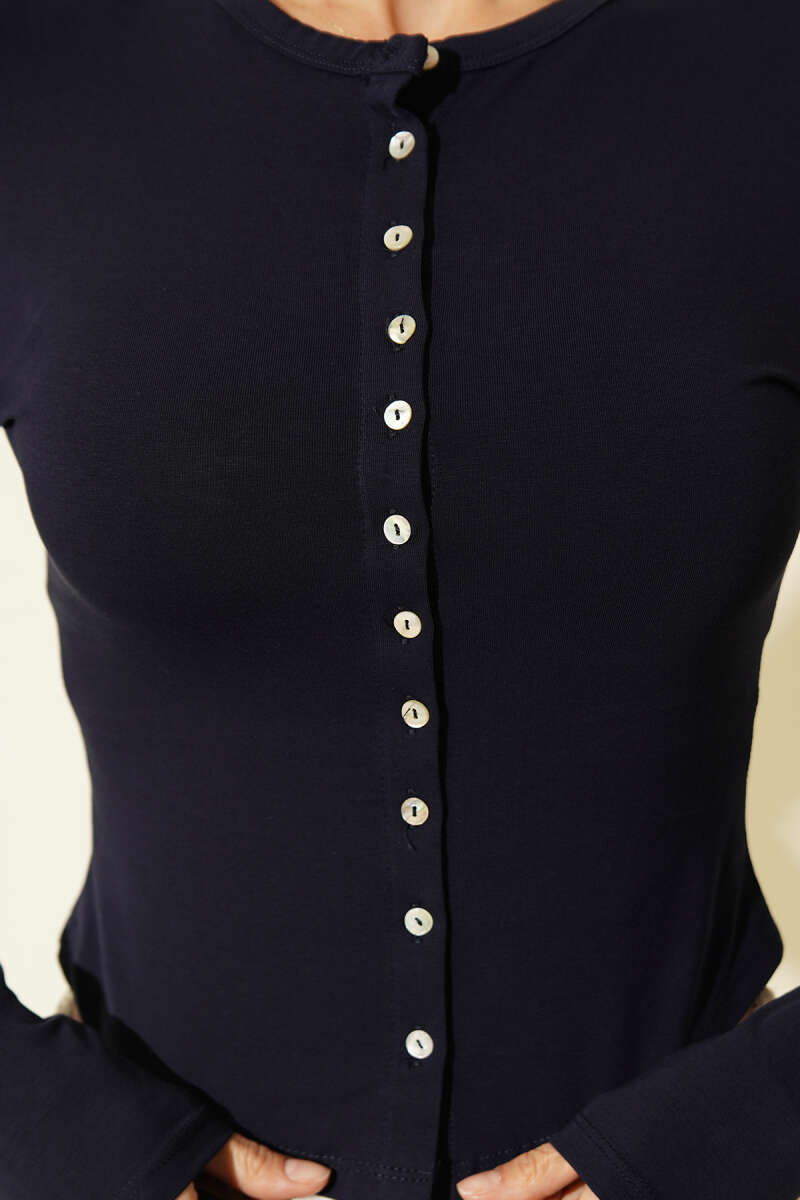 Önü Düğmeli Uzun Kol Bluz Lacivert
