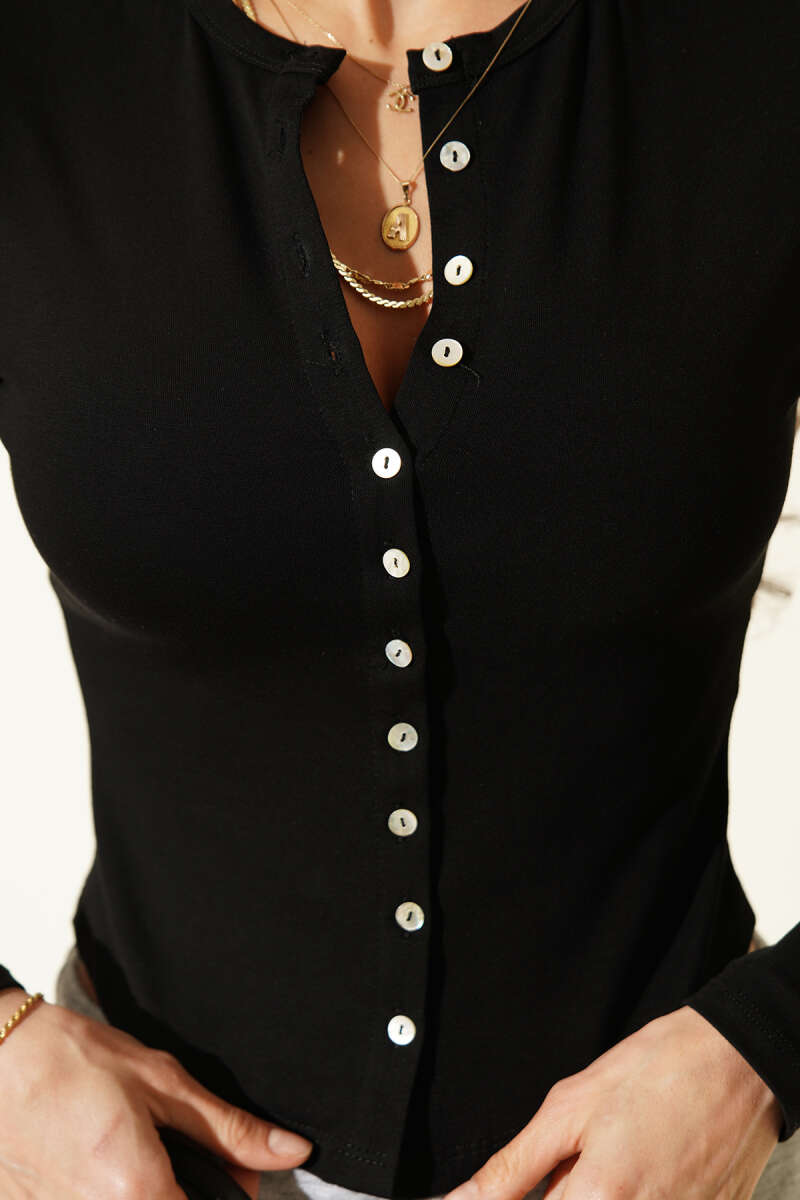 Önü Düğmeli Uzun Kol Bluz Siyah