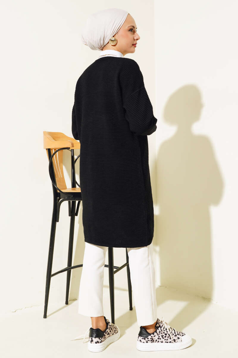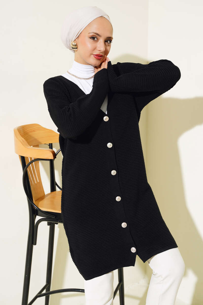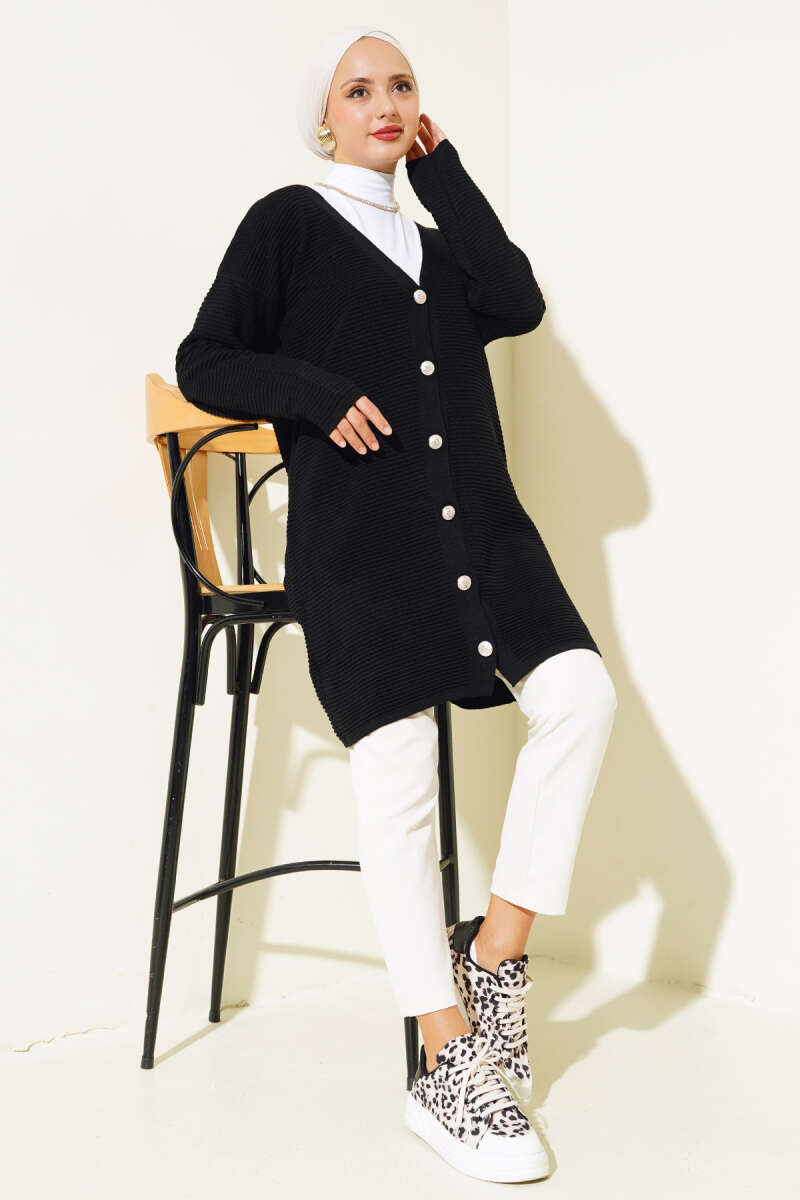 Çiçek Motifli Düğmeli Triko Hırka Siyah