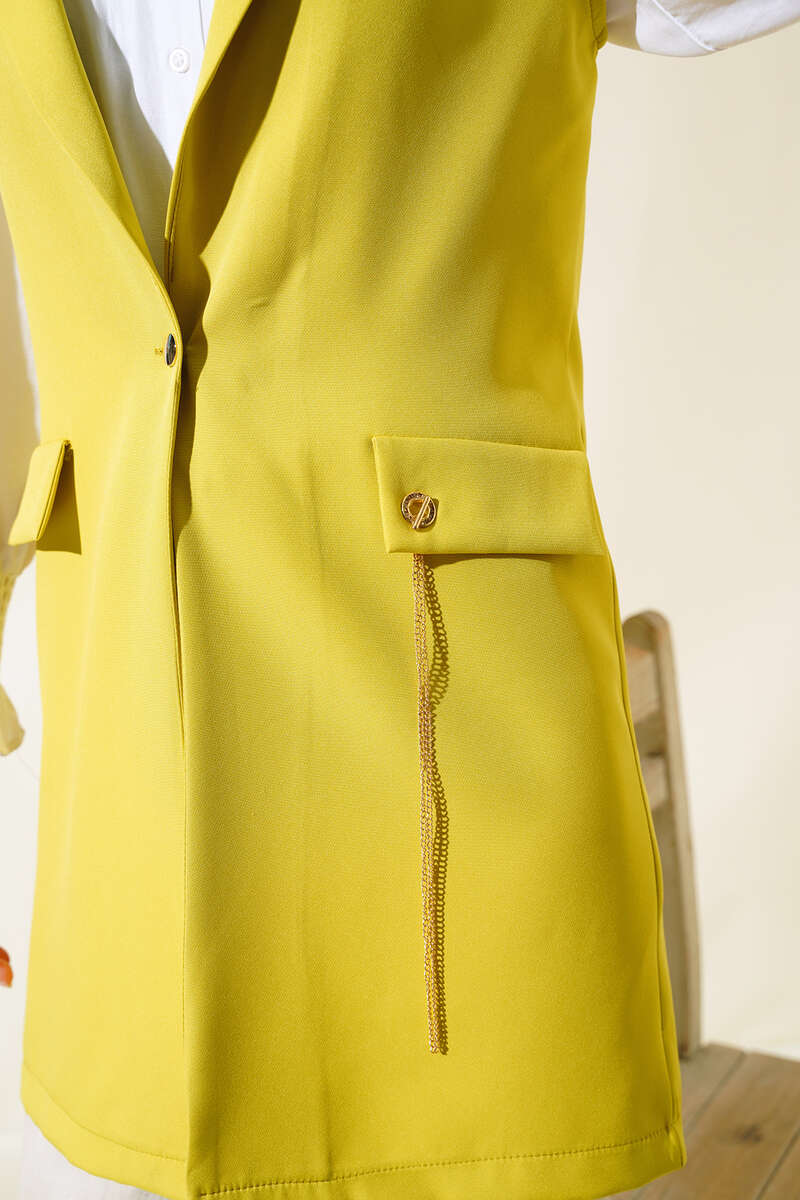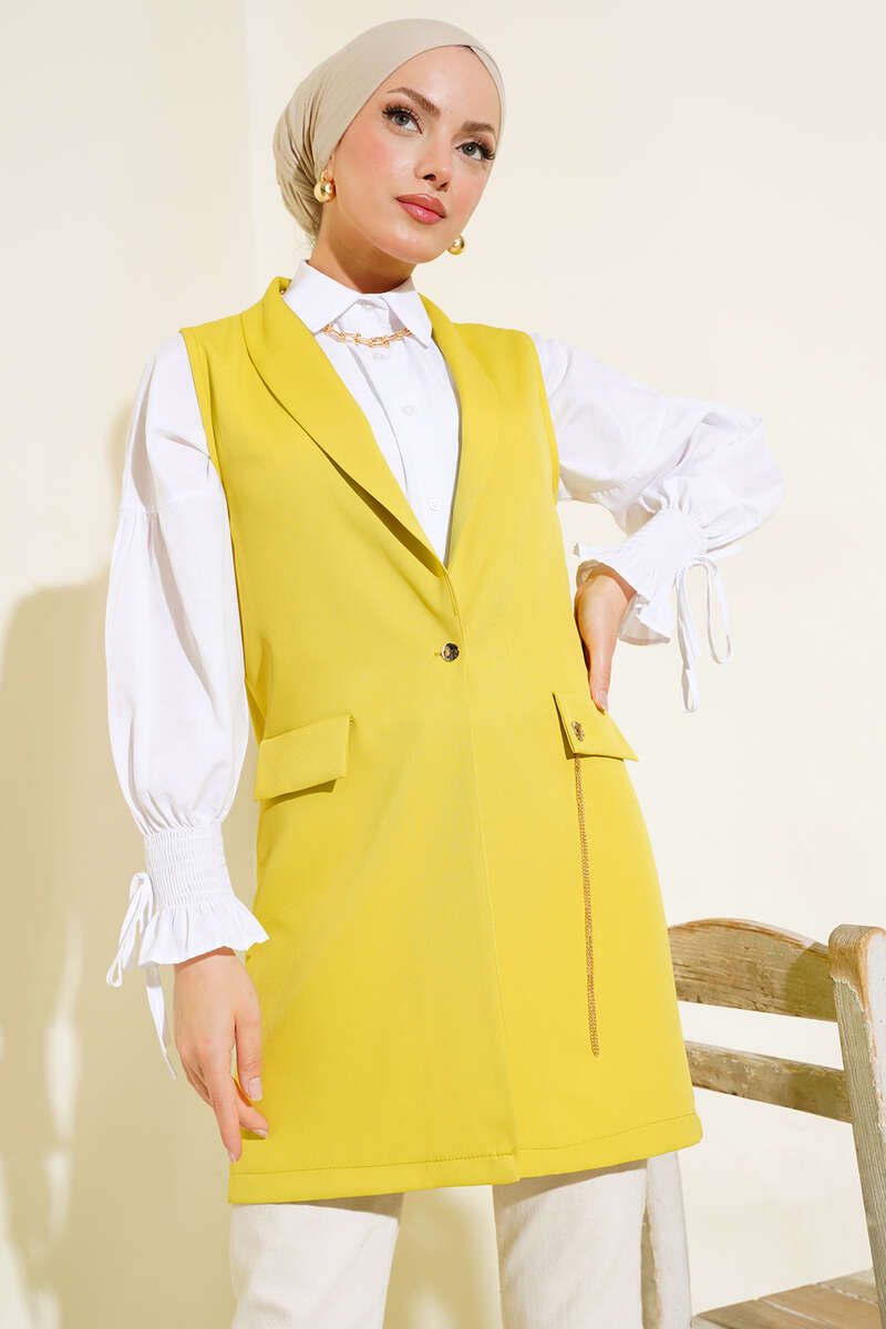 Sezonun favorileri arasında yerini alan yeleğimiz sizlerle beraber. Yeleğimiz kruvaze yakadır. Uzun modeldir. Ceketimizin önü düğmelidir. Önünde iki adet cep süs detayı vardır. Cebinde zincir detayı vardır. Astarsızdır. Sade ve şık yeleğimiz renk seçenekleriyle sizleri bekliyor.