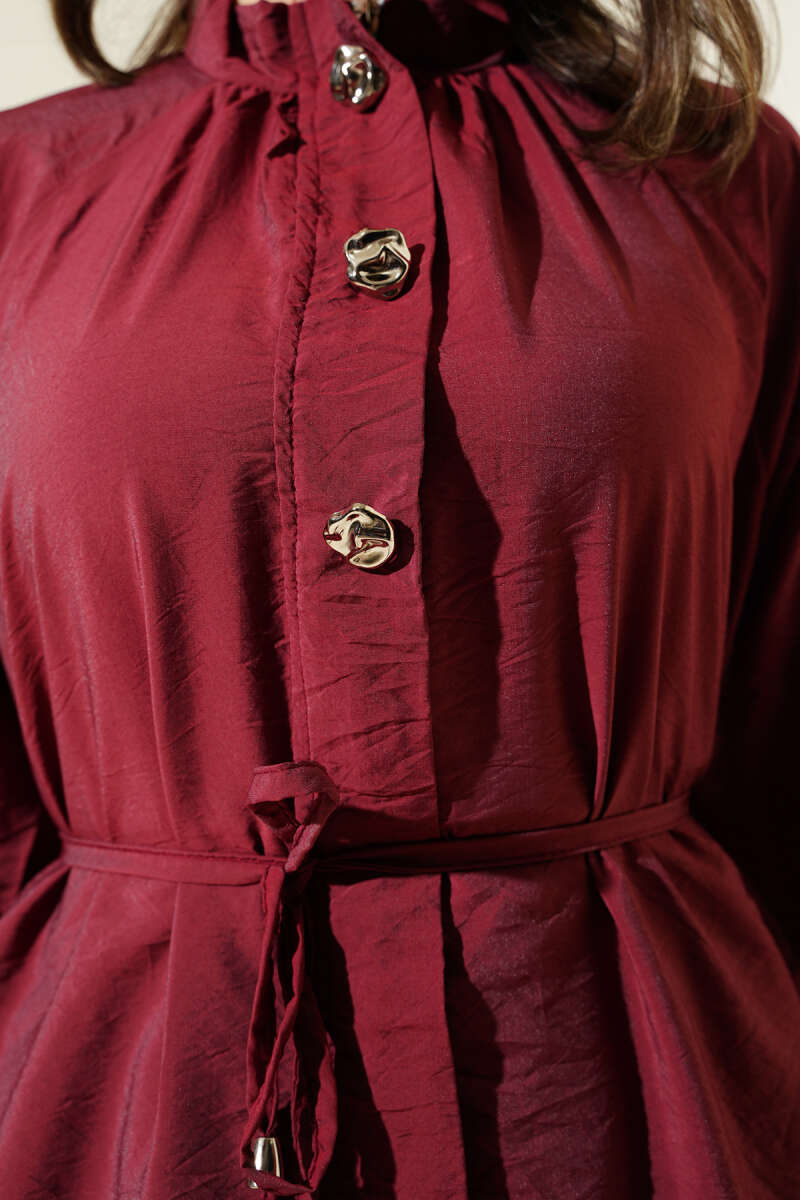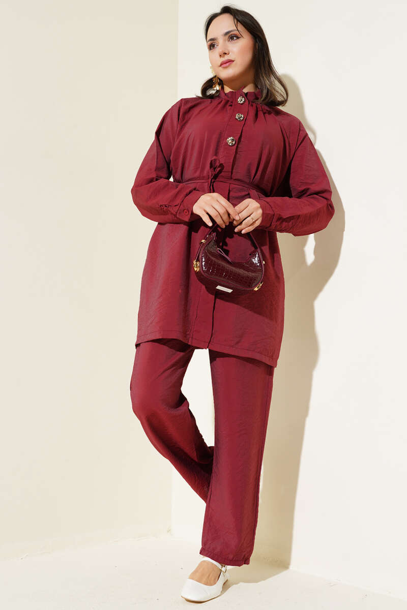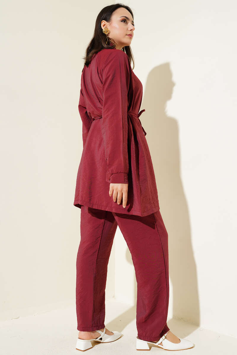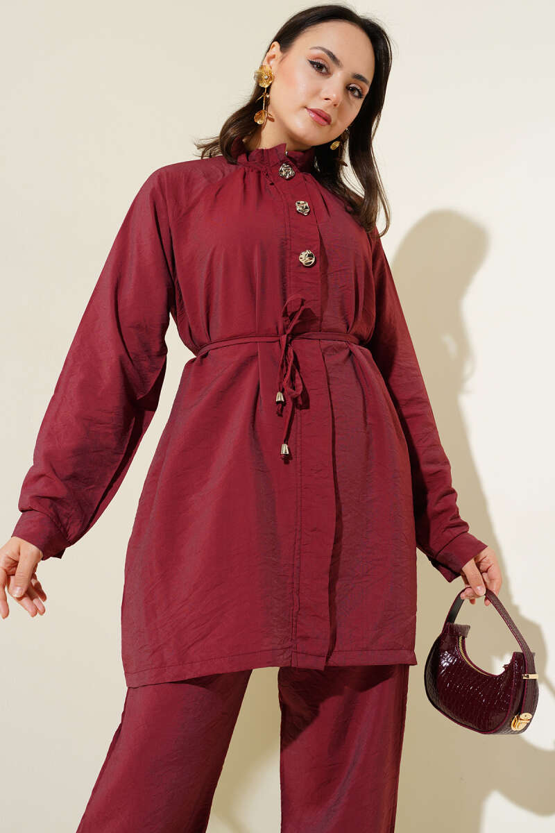 Metal Düğmeli Kemerli İkili Takım Bordo