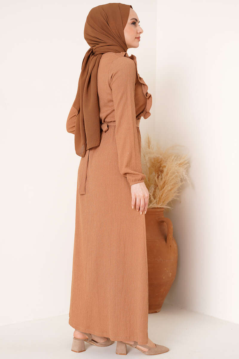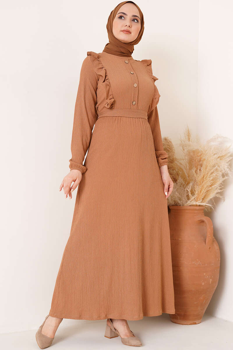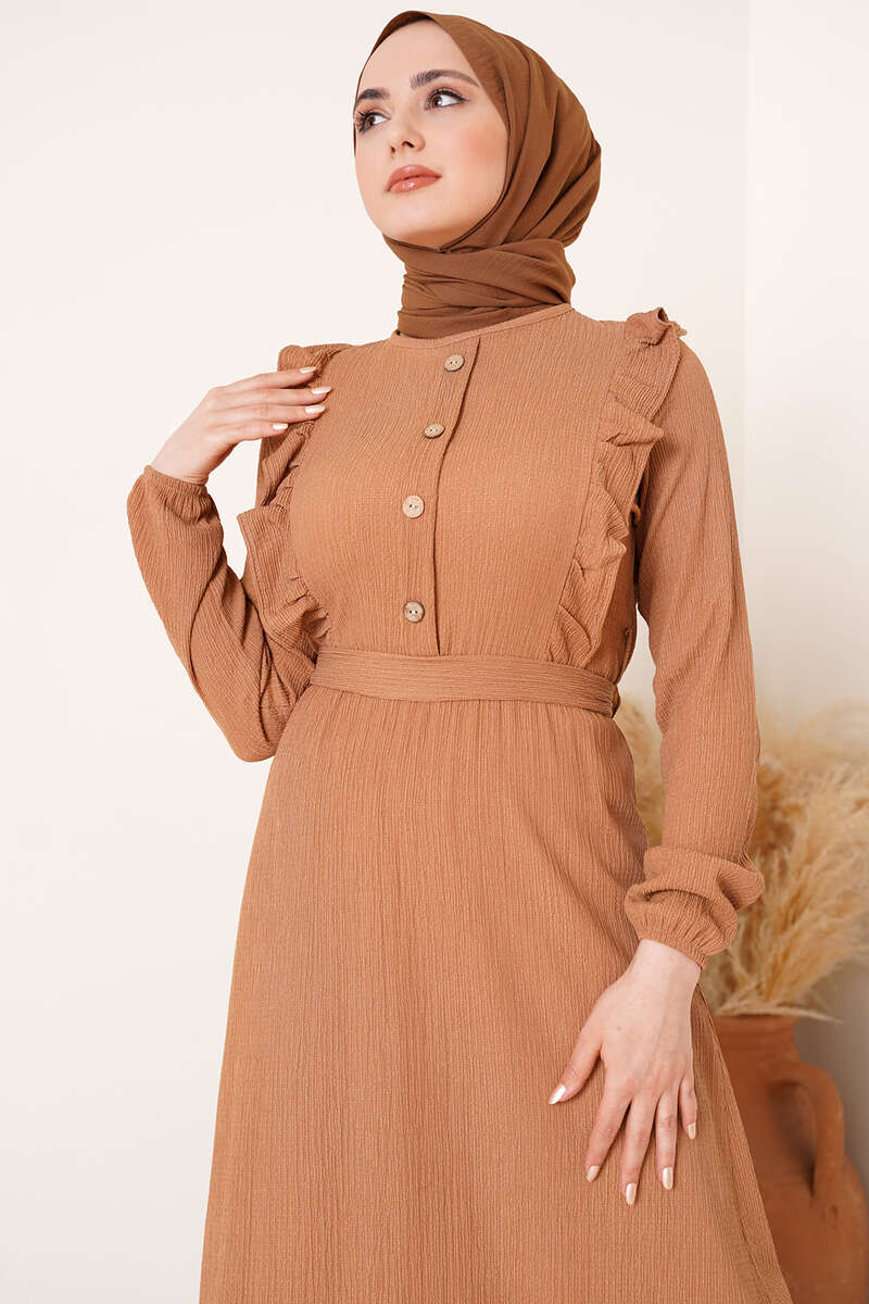 Önü Fırfır Detaylı Bürümcük Elbise Camel