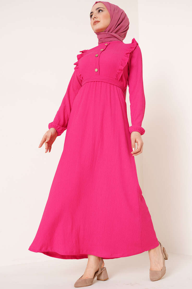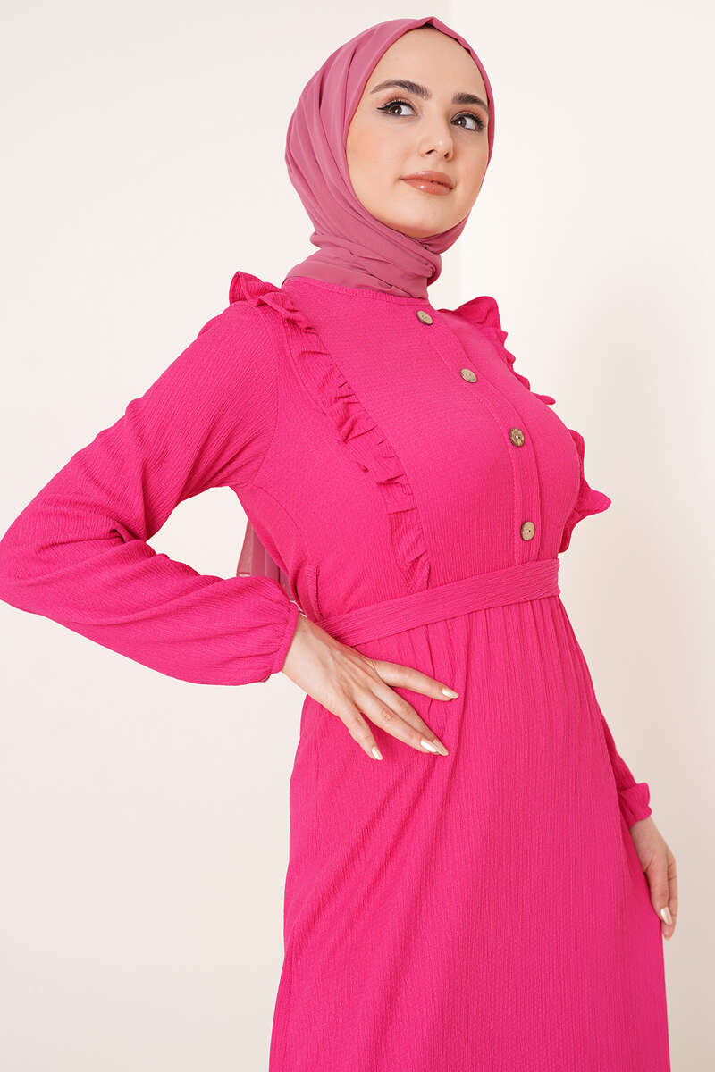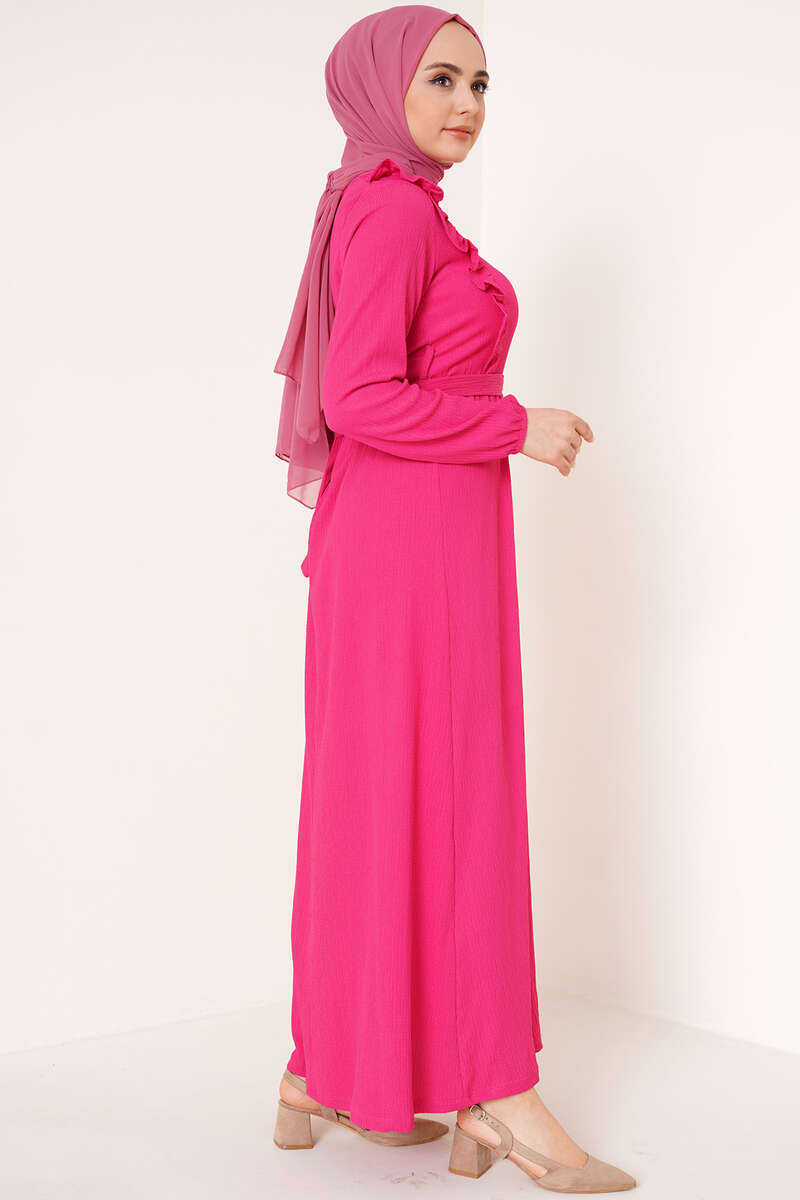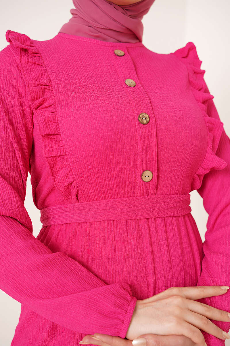 Önü Fırfır Detaylı Bürümcük Elbise Fuşya