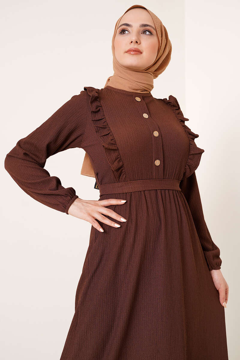 Önü Fırfır Detaylı Bürümcük Elbise Kahve