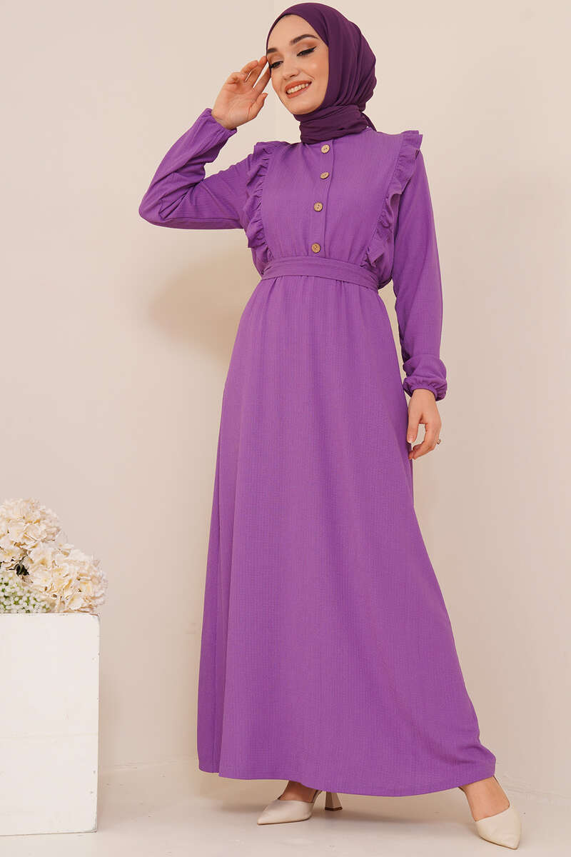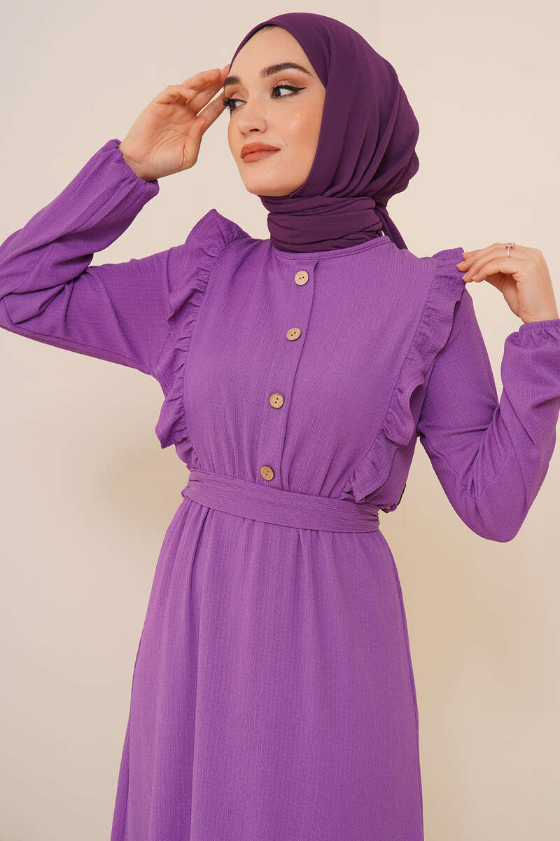 Yeni sezon bürümcük elbisemiz sade ve şık görünümüyle sizler için geldi. Elbisemizin önü fırfır detaylıdır. Yarıya kadar düğme süslemelidir. Beli lastiklidir. Kuşağı ve iki adet kemer köprüsü bulunmaktadır. Her ortamda rahatlıkla giyebilirsiniz. Farklı renk seçenekleri mevcuttur.