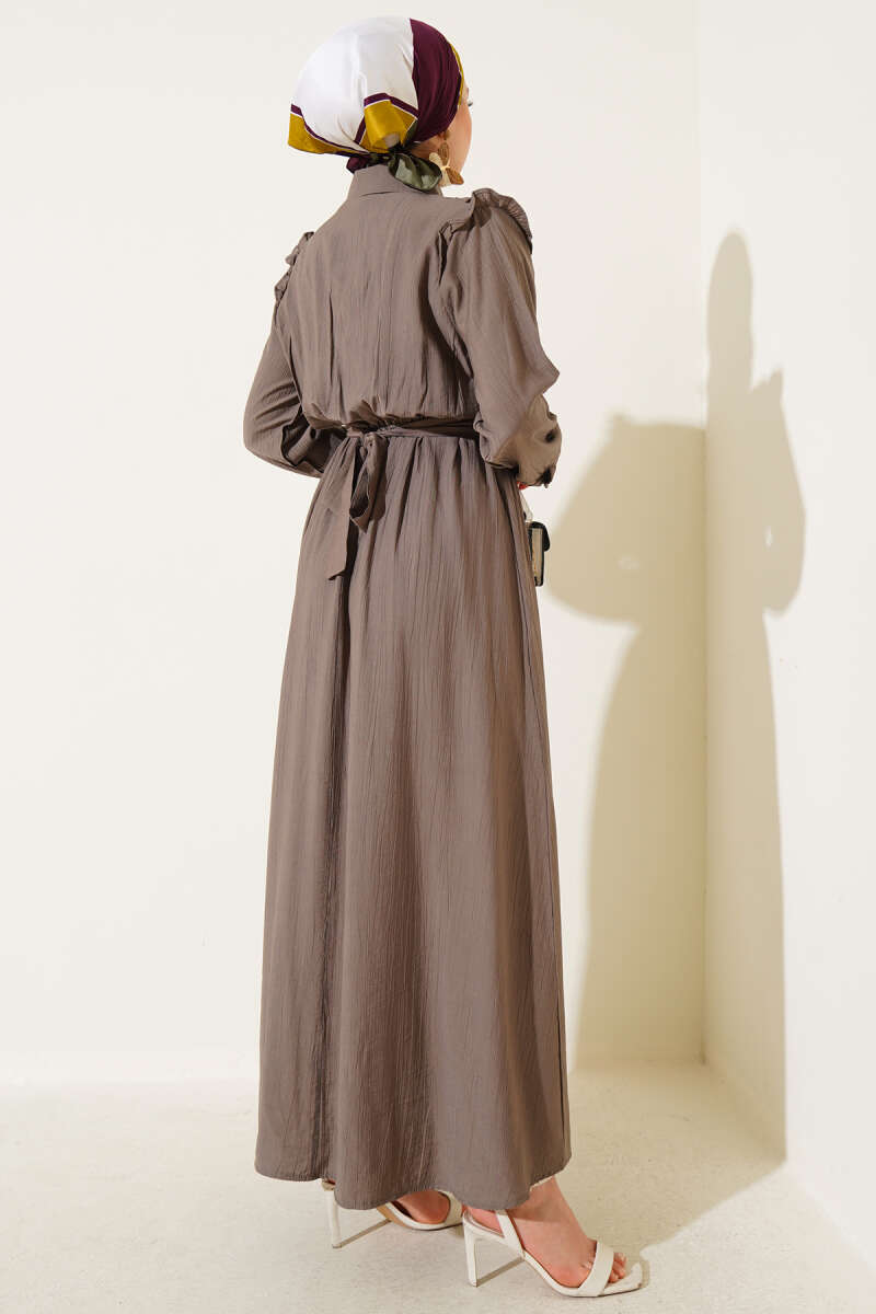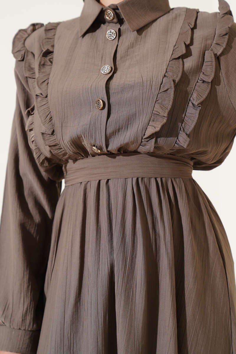Yarım Taş Düğmeli Bağlamalı Elbise Bej