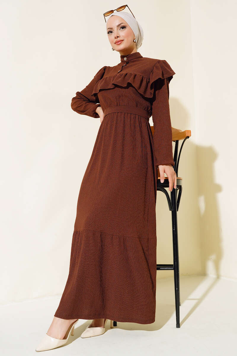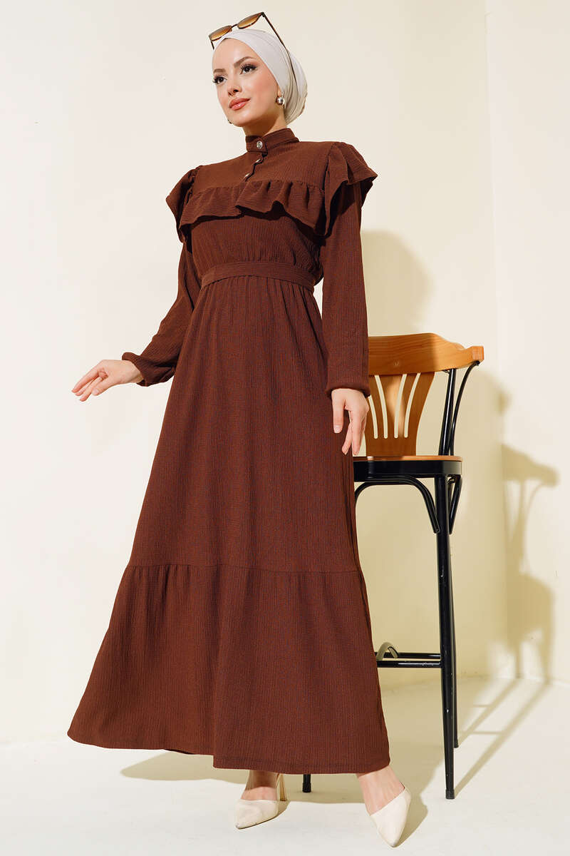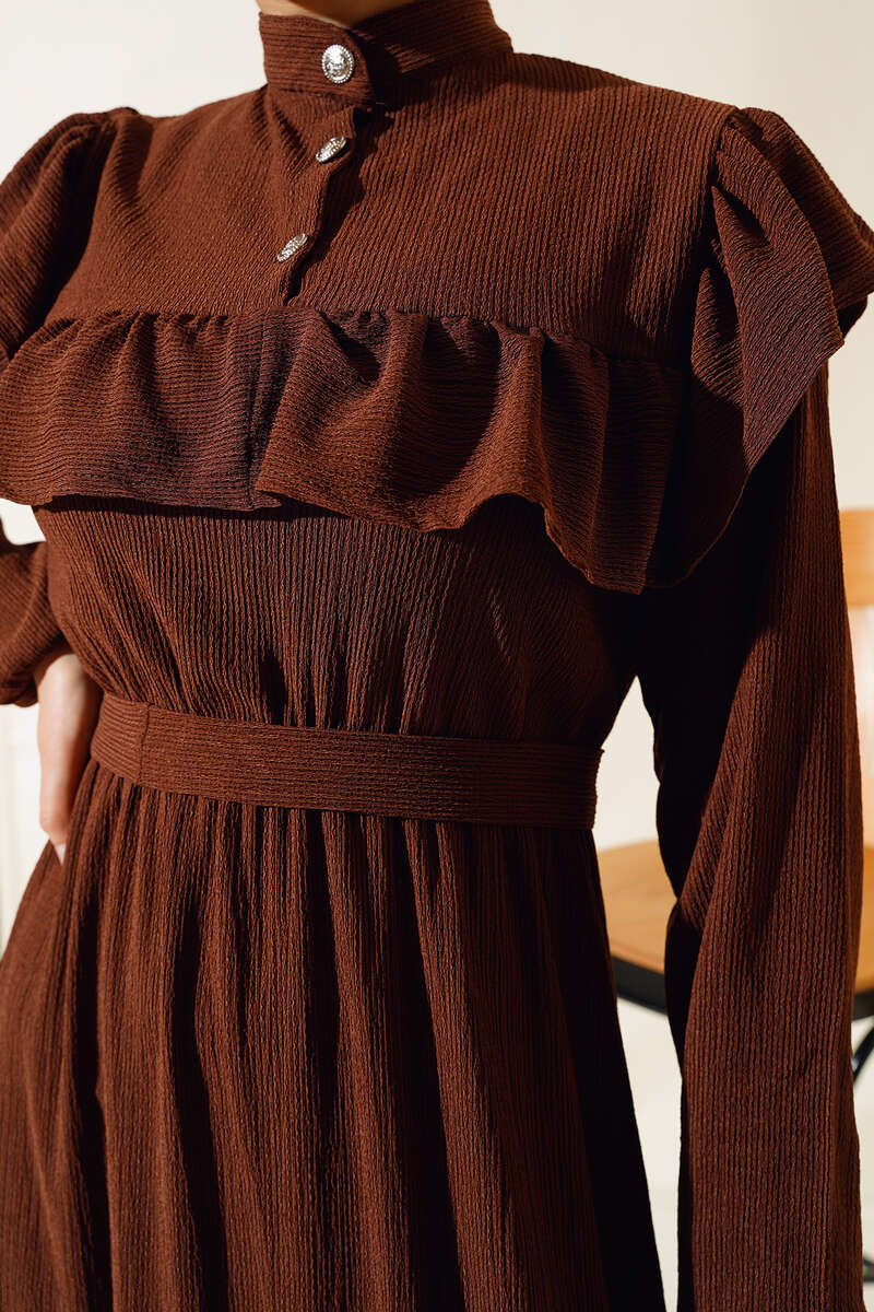 Önü Fırfırlı Bürümcük Elbise Kahve