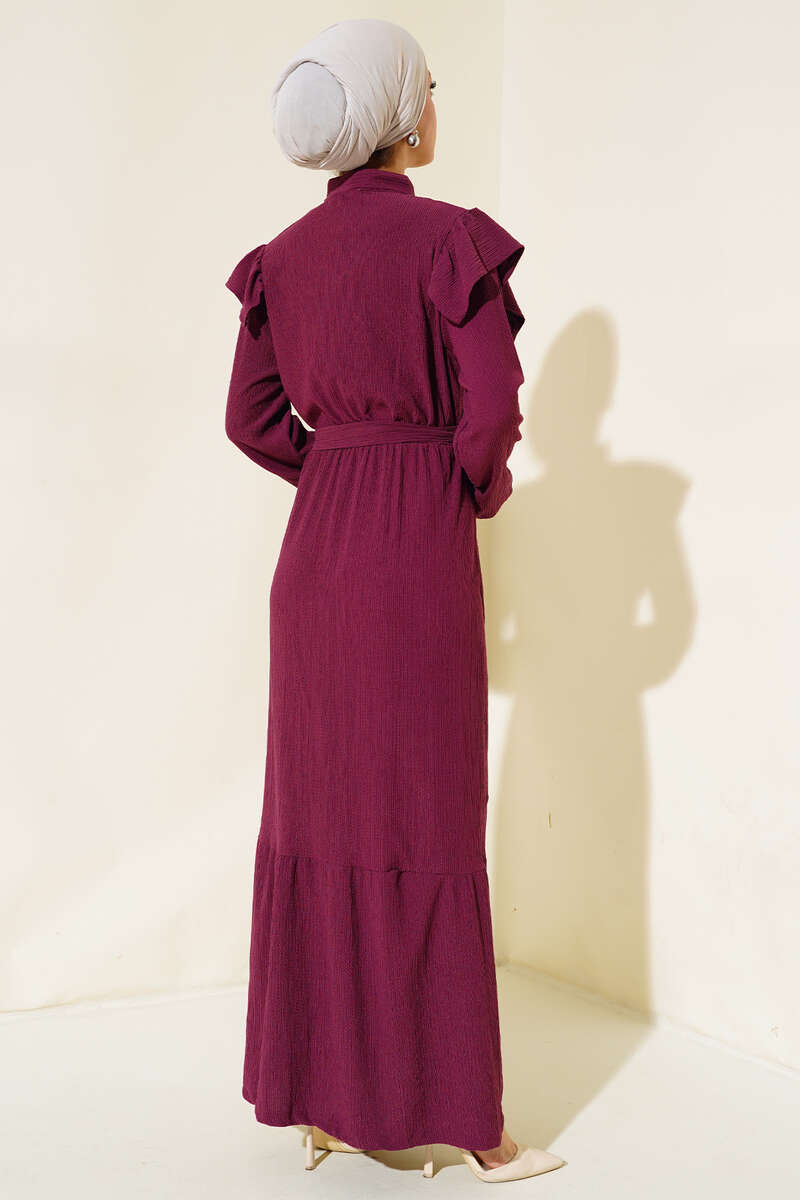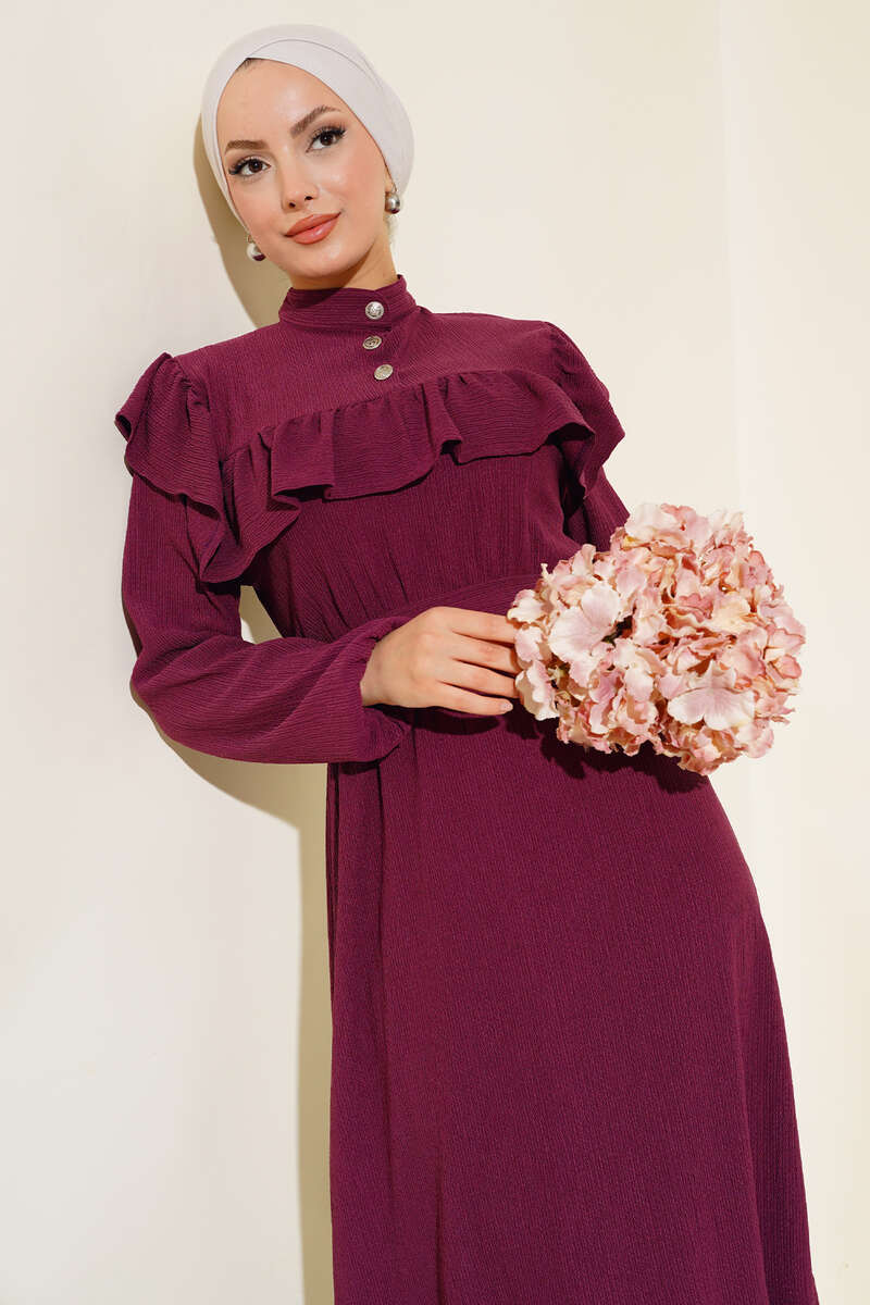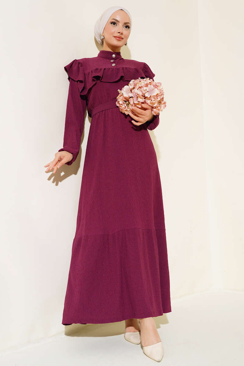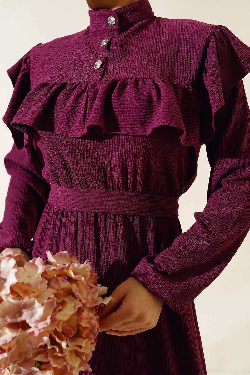Önü Fırfırlı Bürümcük Elbise Mürdüm
