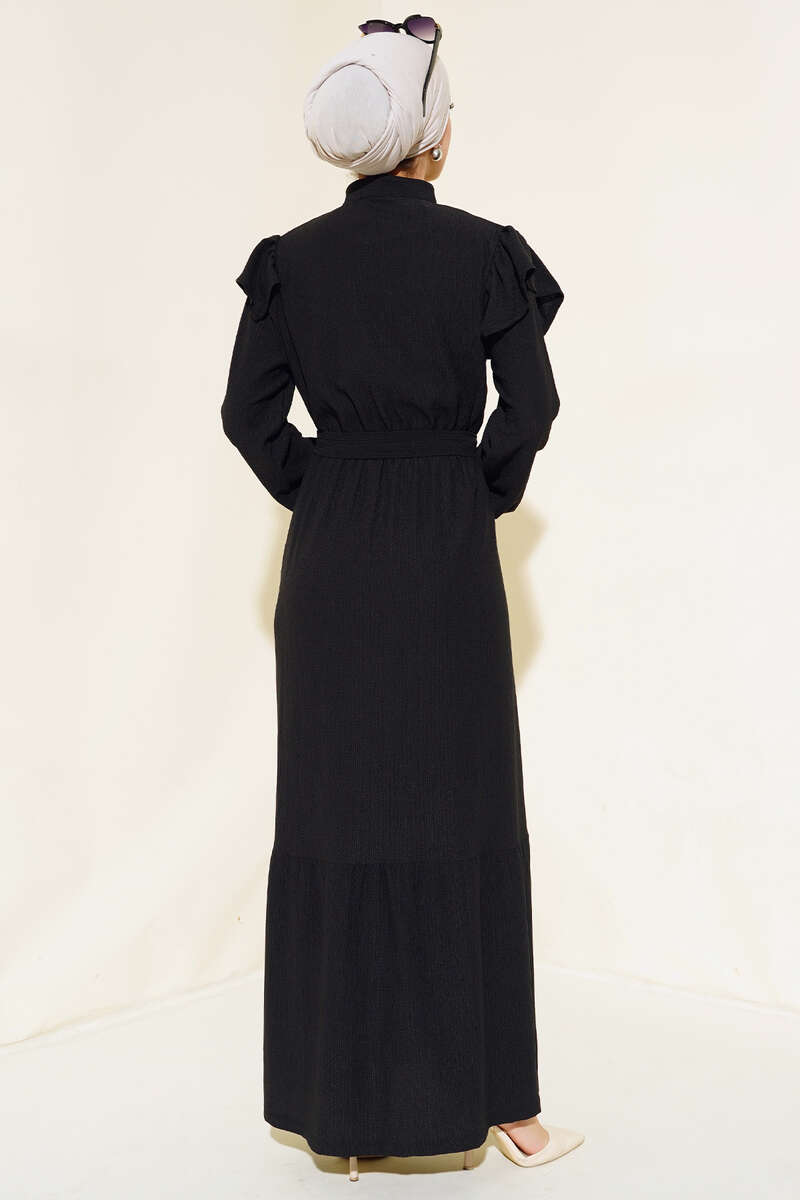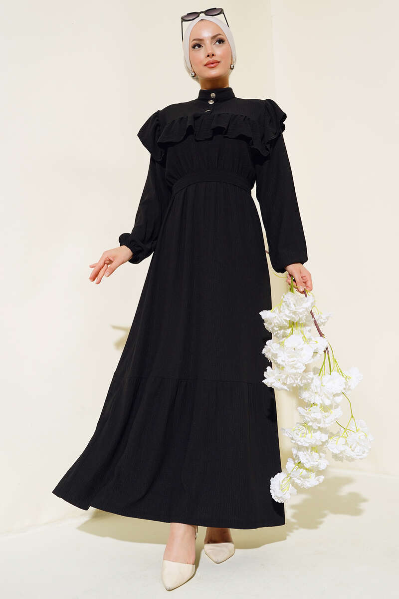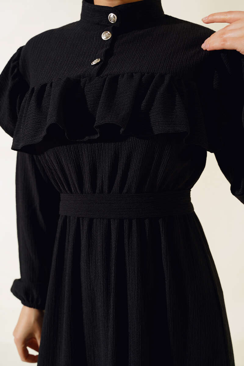 Önü Fırfırlı Bürümcük Elbise Siyah