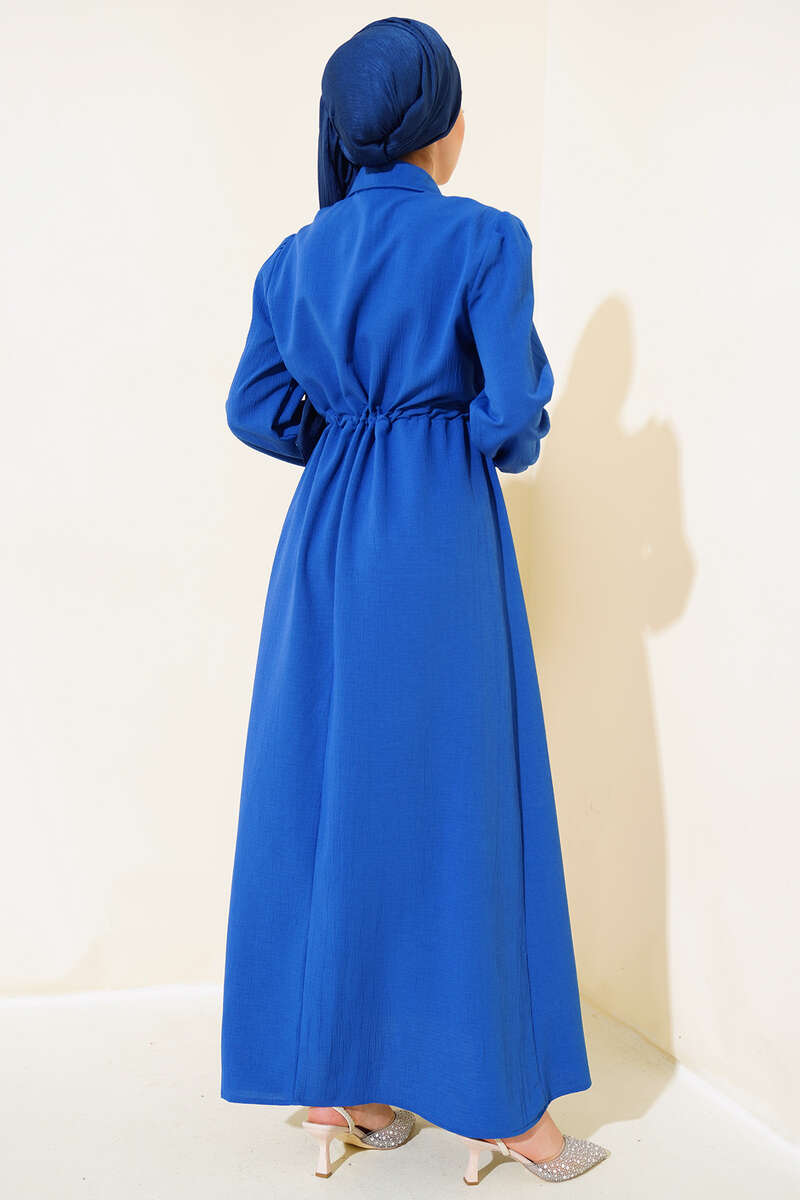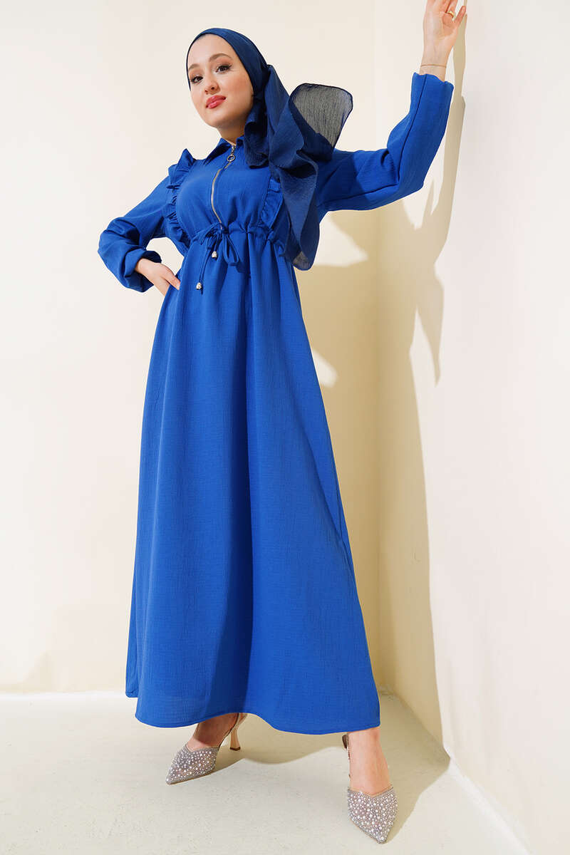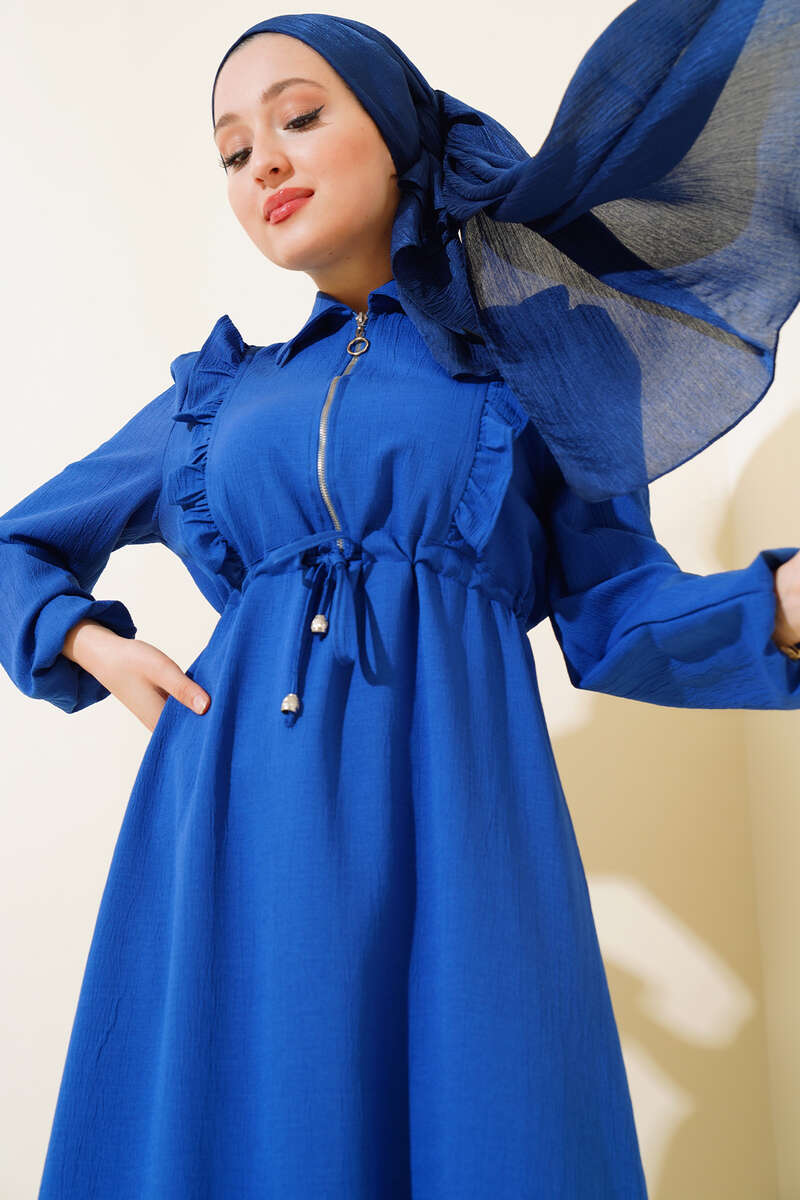 Yeni sezon elbise modelimiz sizlerle beraber. Elbisemizin önü fırfırlıdır. Gömlek yakadır. Kol bilekleri lastiklidir. Elbisemizin önü yarım fermuarlıdır. Beli tünelli olup, ip bağcıklıdır. Astarsızdır. Şık ve zarif elbisemiz size çok yakışacak.