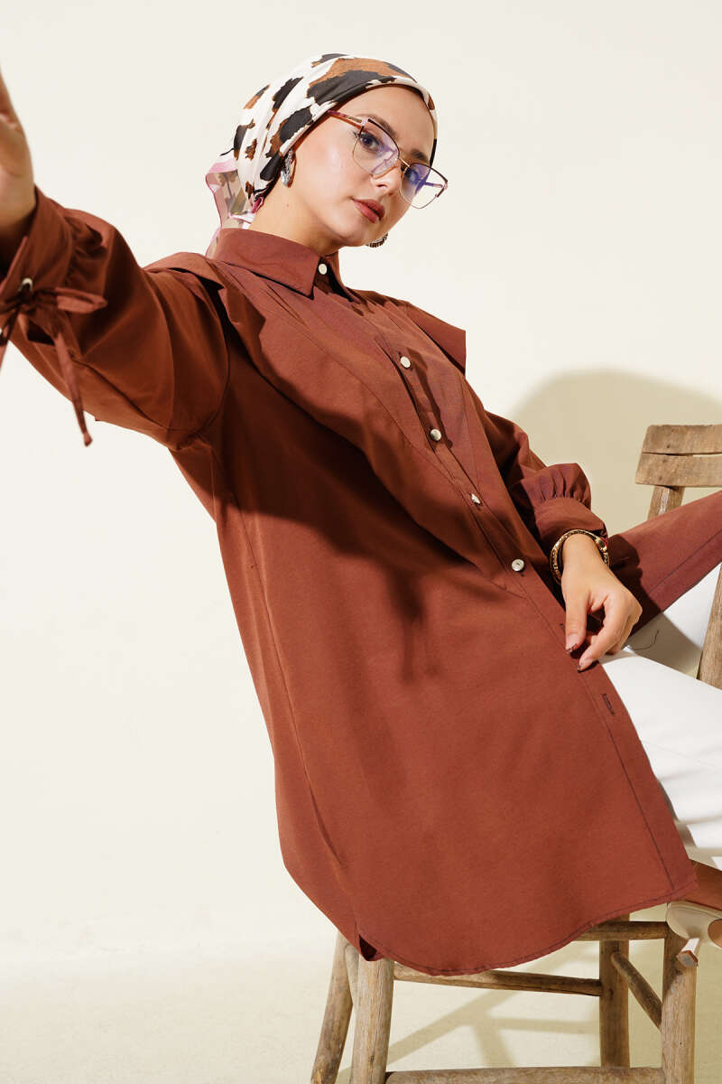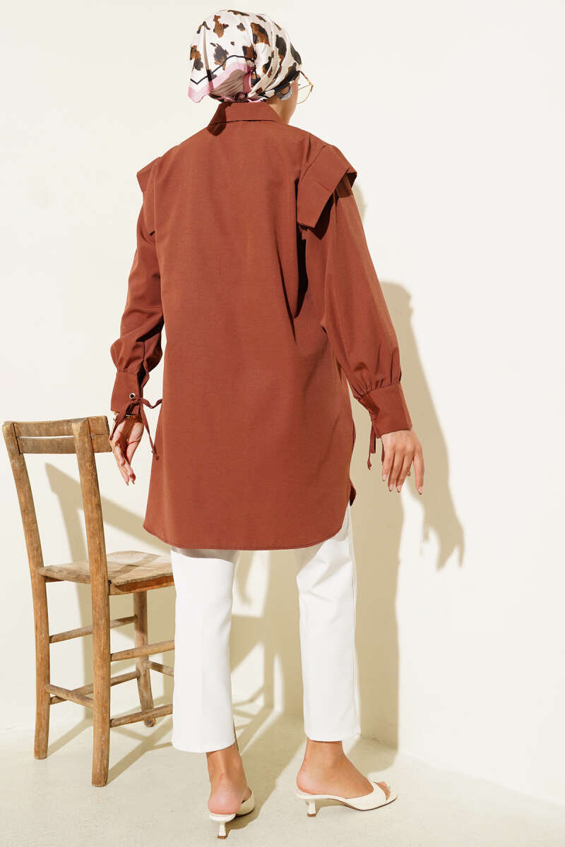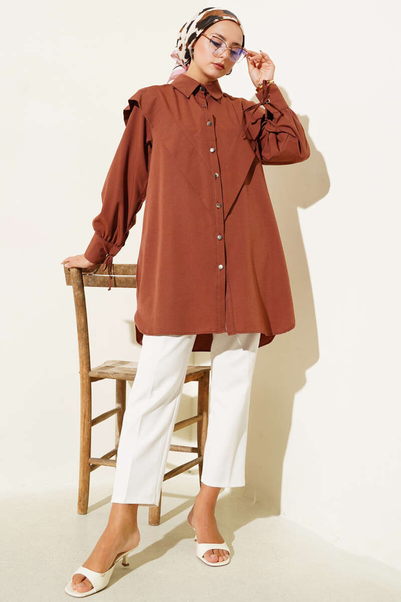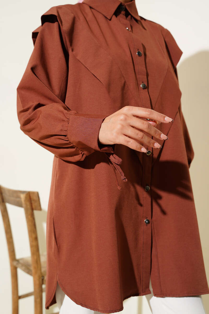 Taş Düğmeli Omuz Pileli Gömlek Bej