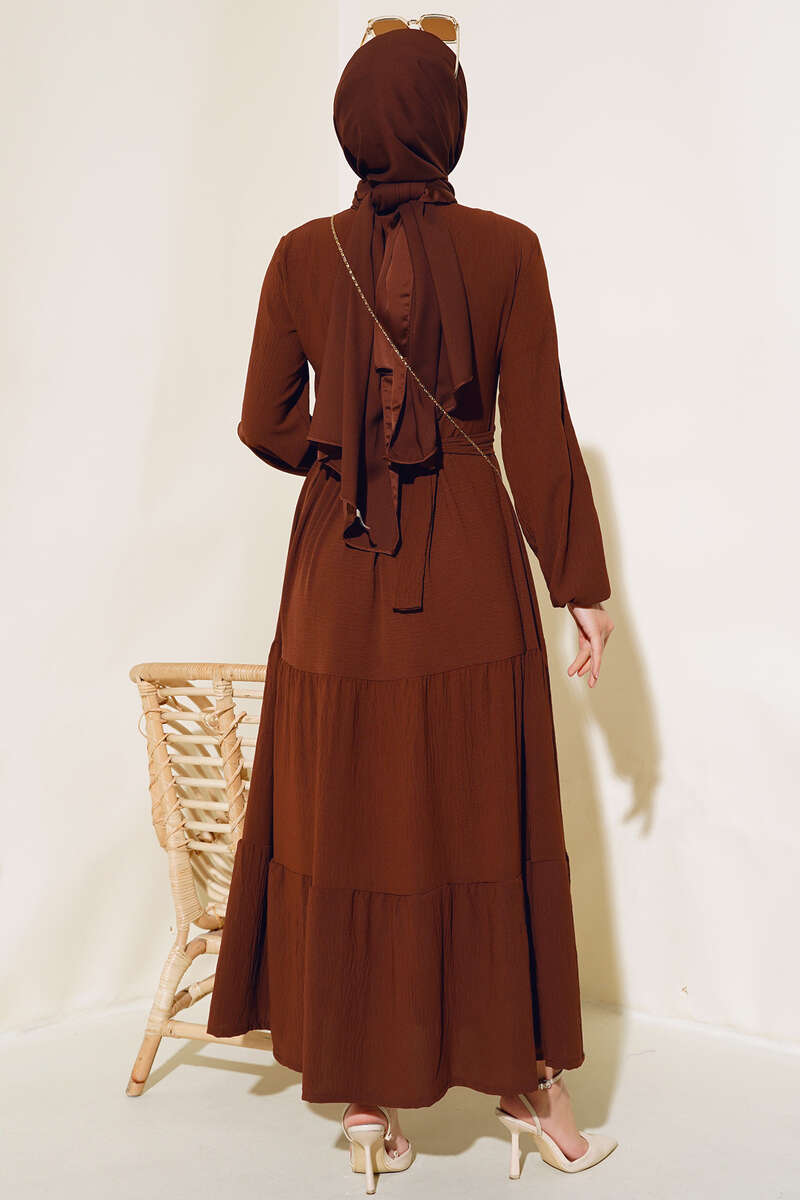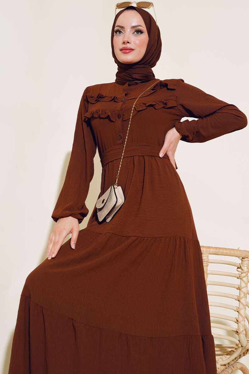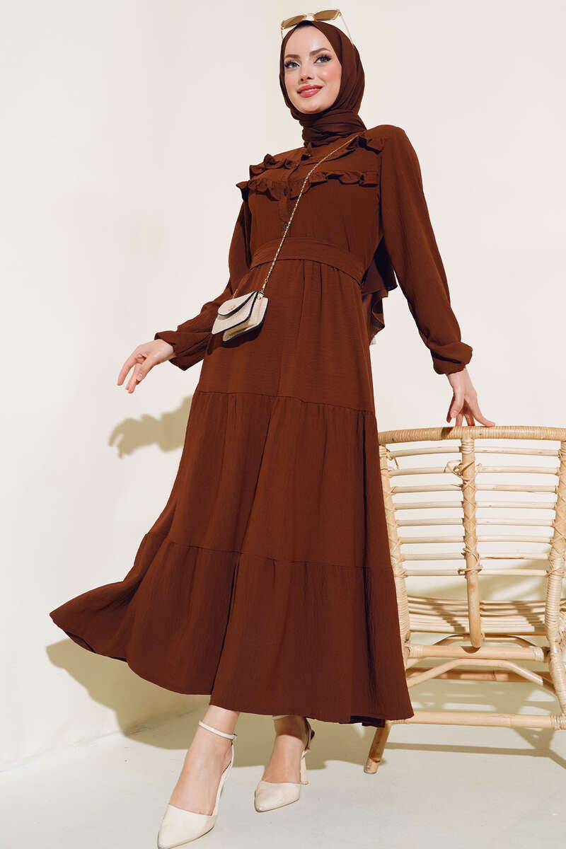 Önü Fırfırlı Kat Elbise Kahve