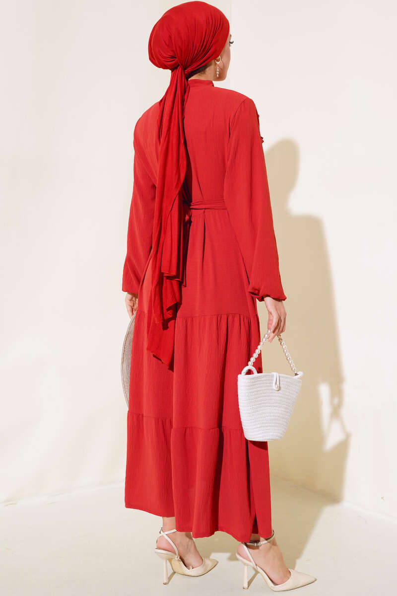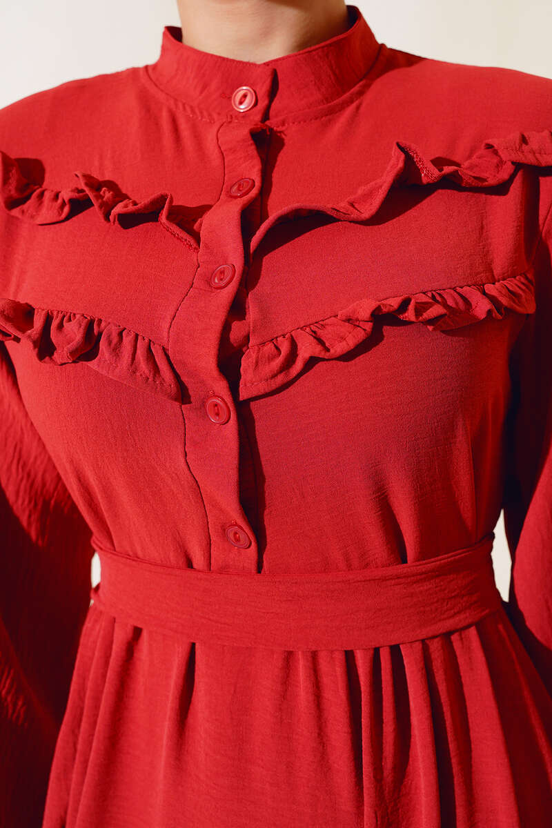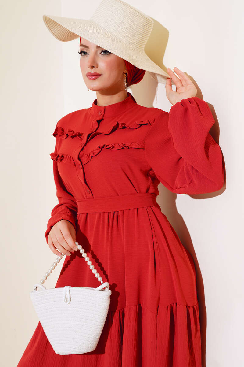 Yeni sezon elbisemiz şık tarzıyla sizlerle beraber. Elbisemizin önü fırfırlıdır. Yarım düğmelidir. Kol bilekleri lastiklidir. Elbisemiz kat modeldir. Kendi kumaşından kuşağı vardır. Astarsızdır. Renk seçenekleri olan elbise modelimiz dolabınızda yerini beklemektedir.