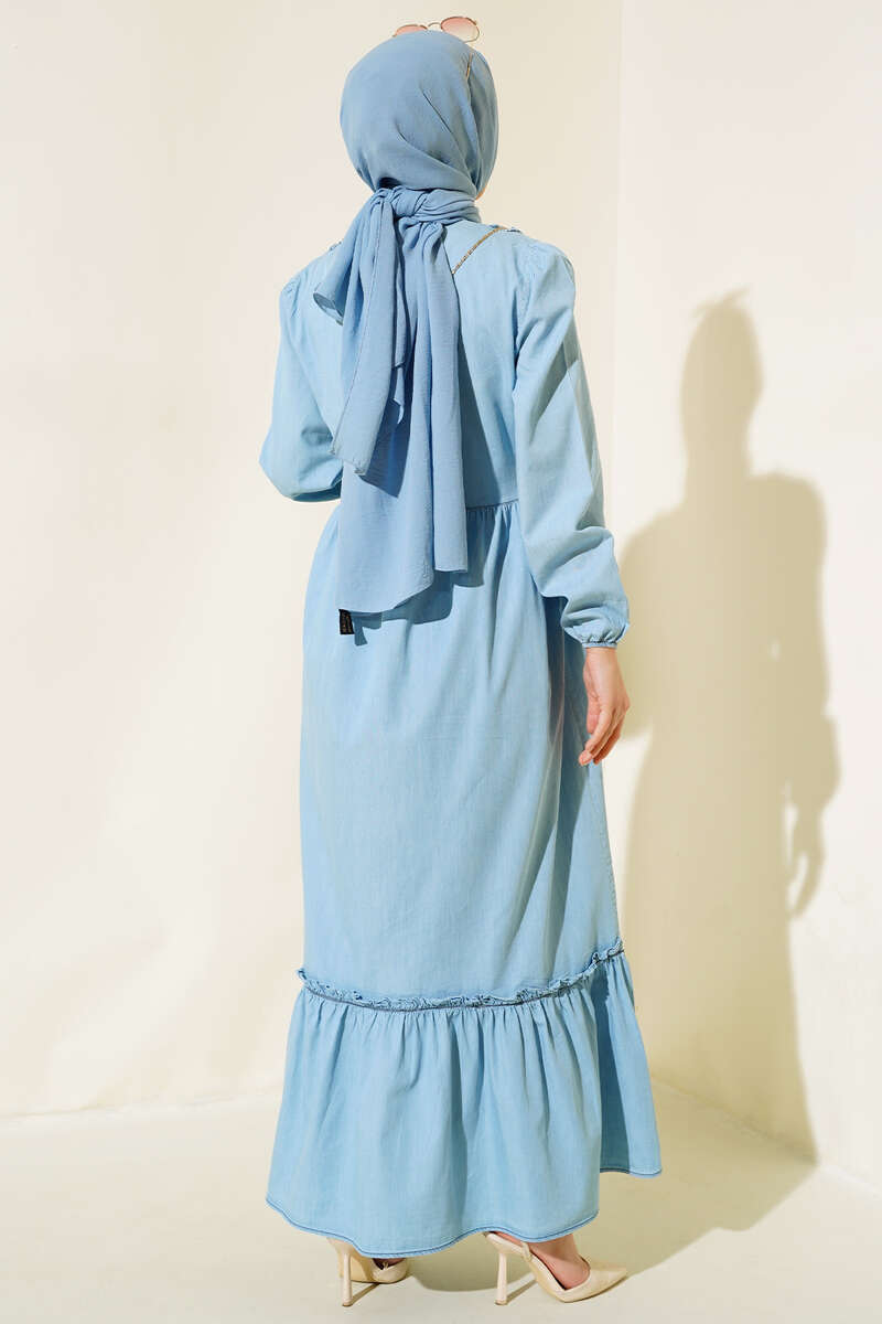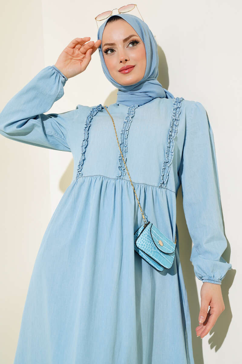Yeni sezon elbise modelimiz sizlerle beraber. Önü fırfırlı olup hareketlilik kazanan elbisemiz size çok yakışacak. Salaş elbisemizin etek ucu güpürlü kat modeldir. Kloş model olan kot elbisemiz dolaplarınızda yerlerini beklemektedir.