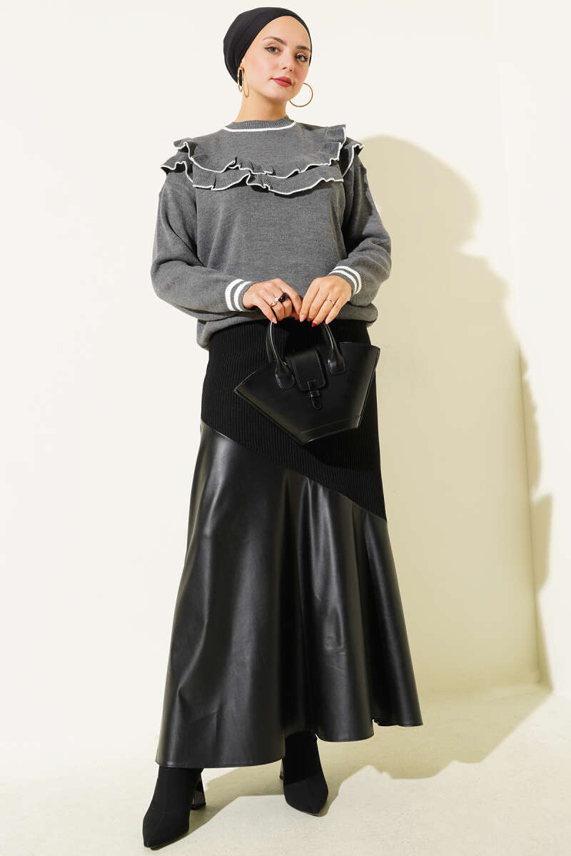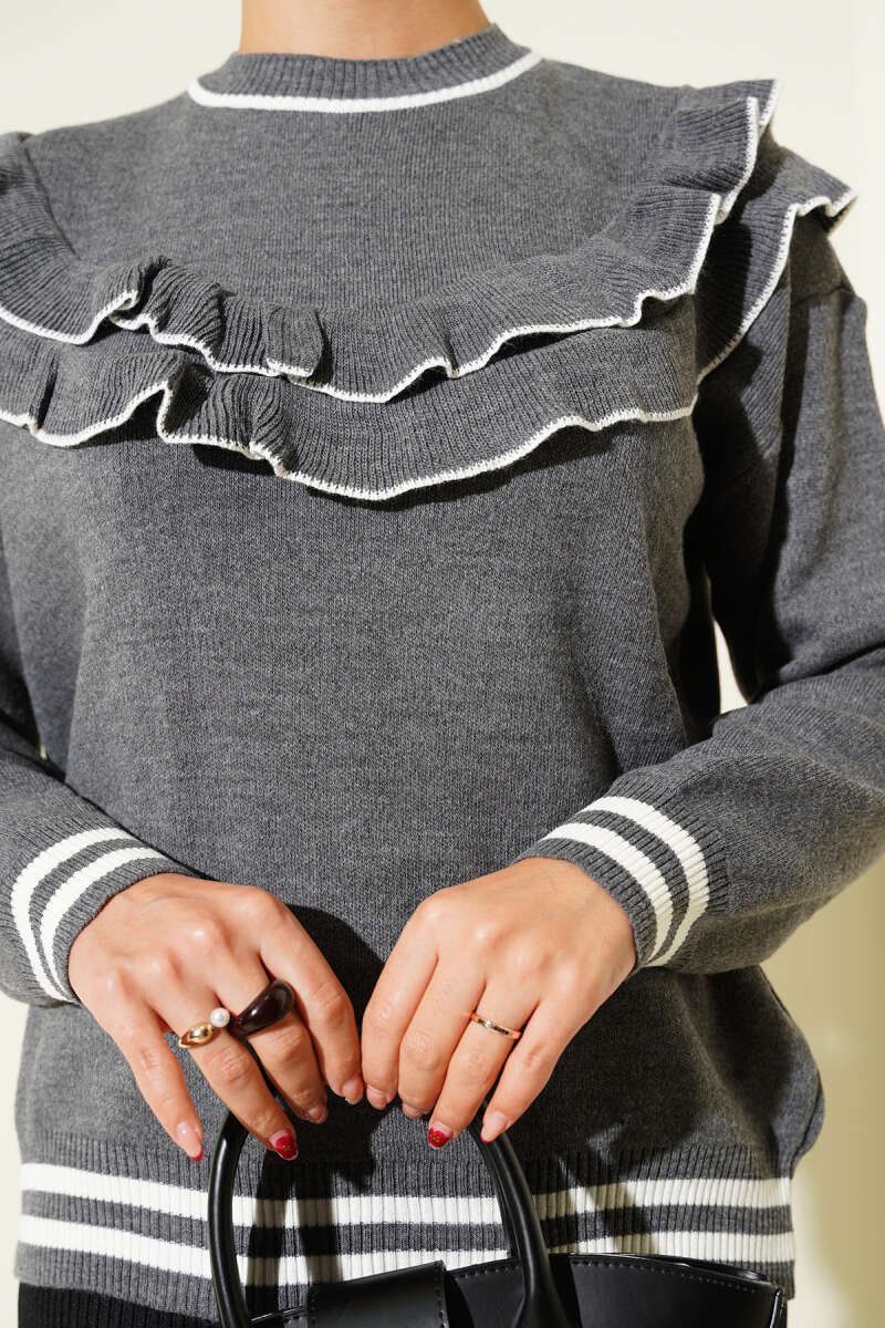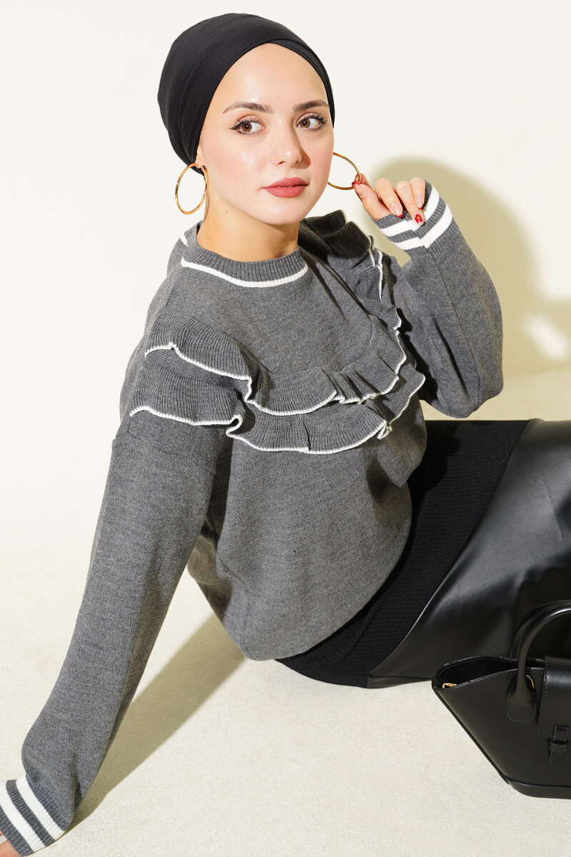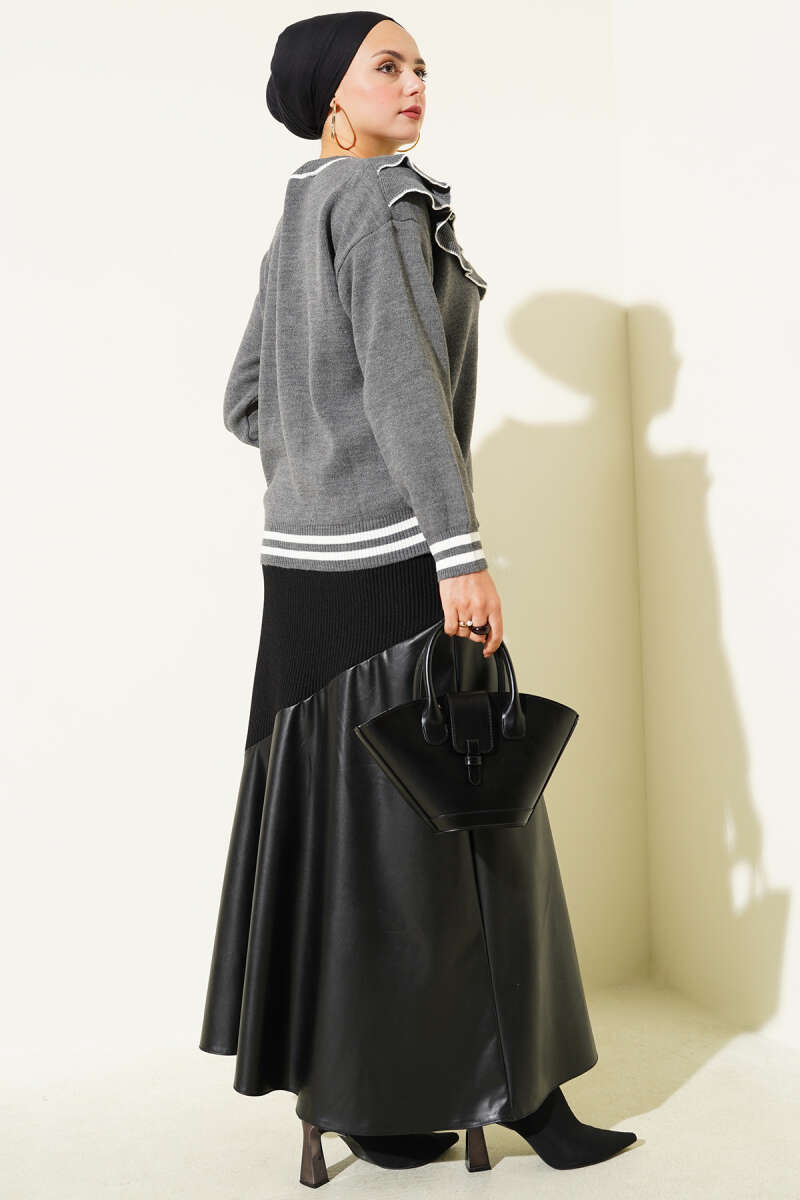 Bel Bağcıklı Bisiklet Yaka Triko Elbise Füme