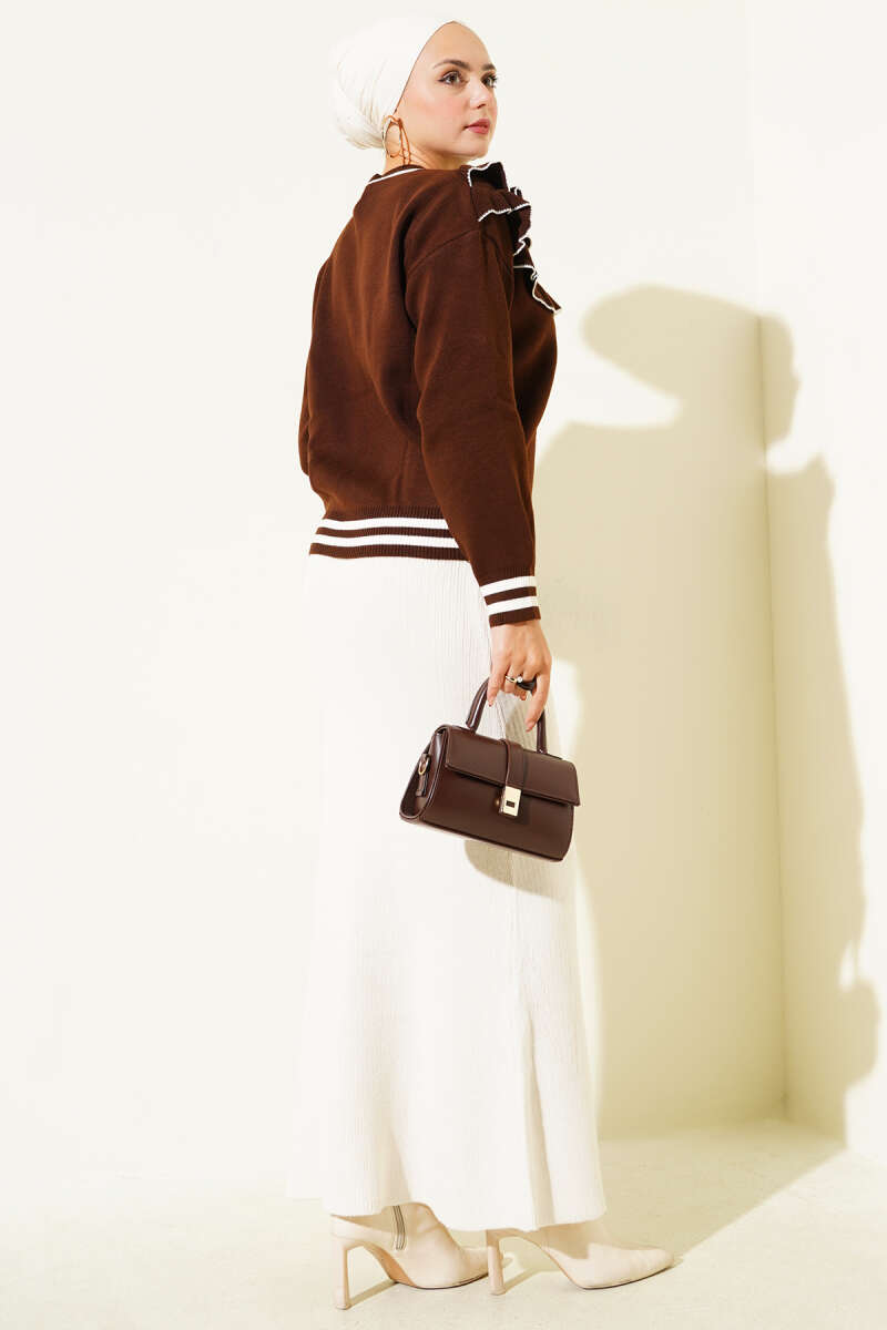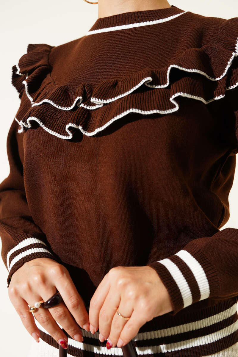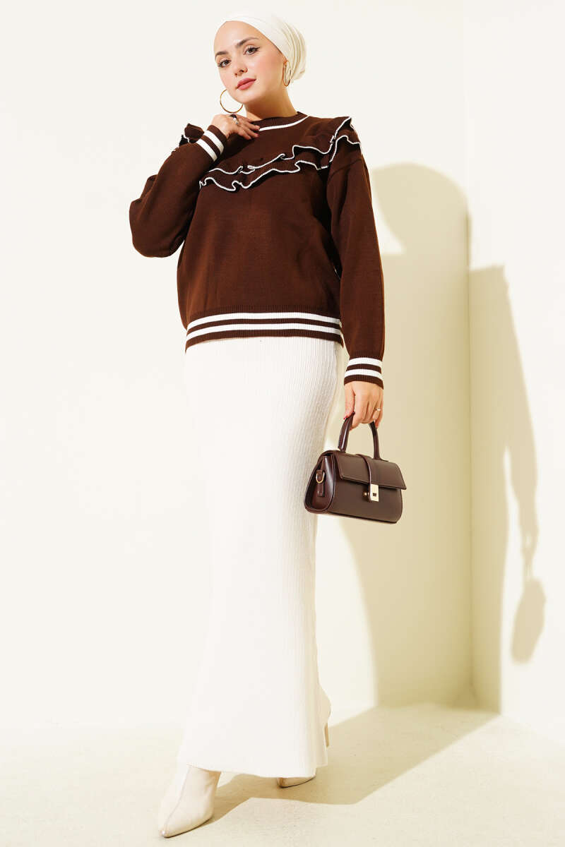 Önü Fırfırlı Triko Kazak Ekru