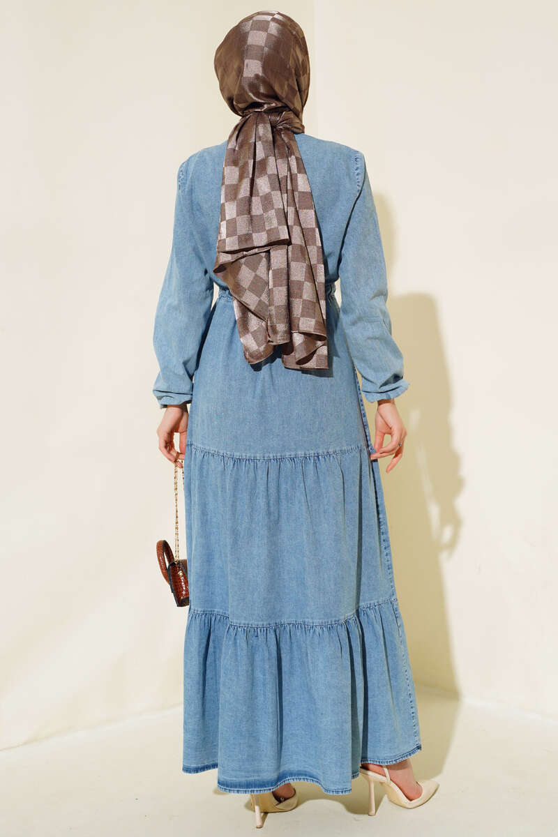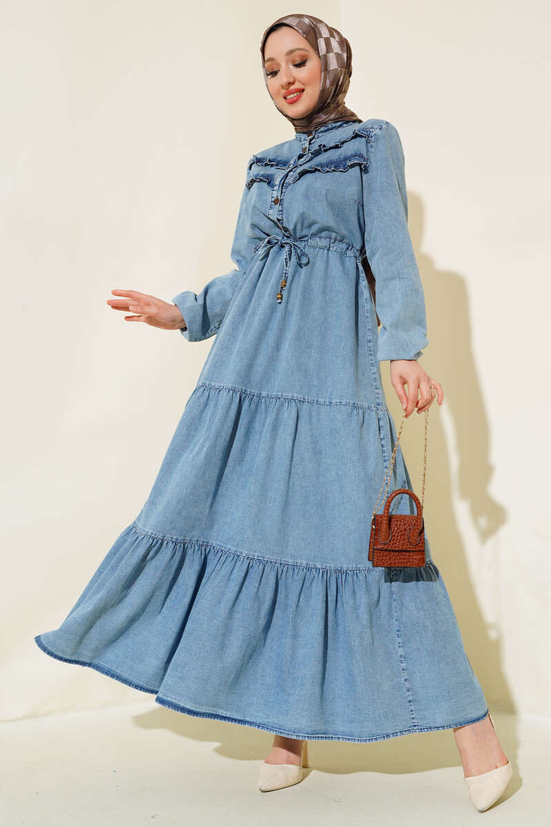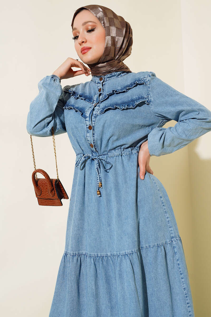 Yeni sezon kot elbise modelimiz sizler için geldi. Elbisemizin önü fırfır detaylıdır. Yarım düğmelidir. Dik yakadır. Elbisemizin beli tünelli olup, ip bağcıklıdır. Kol bilekleri lastiklidir. Kat modeldir. Astarsızdır. Hem şık hem sportif elbisemiz bahar ve yaz aylarının kurtarıcısı olacaktır.