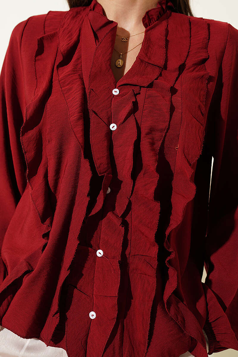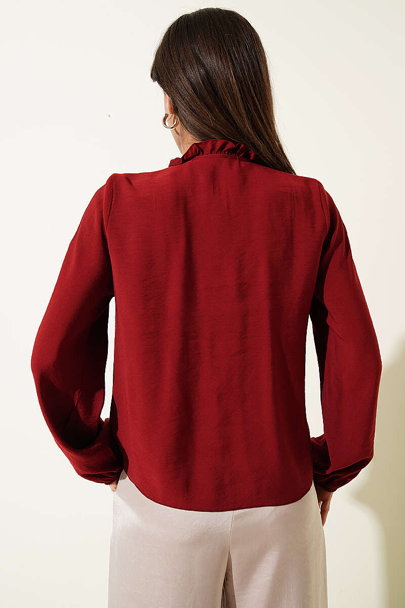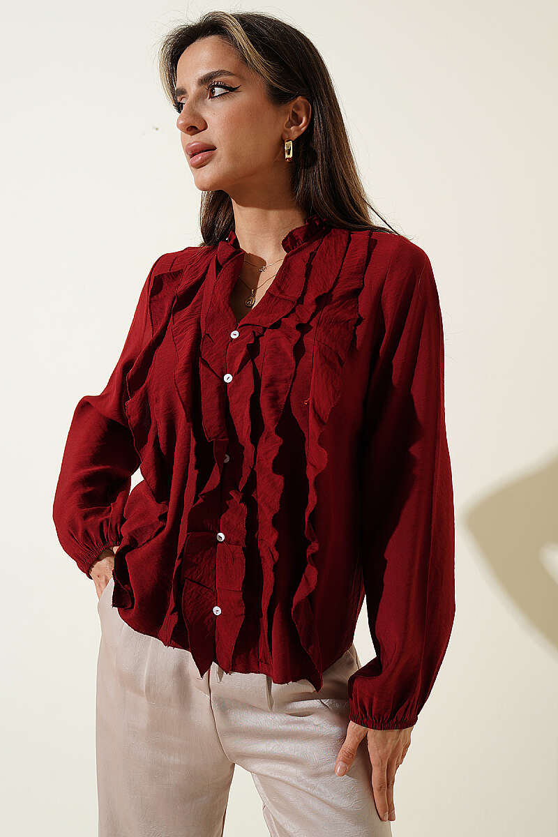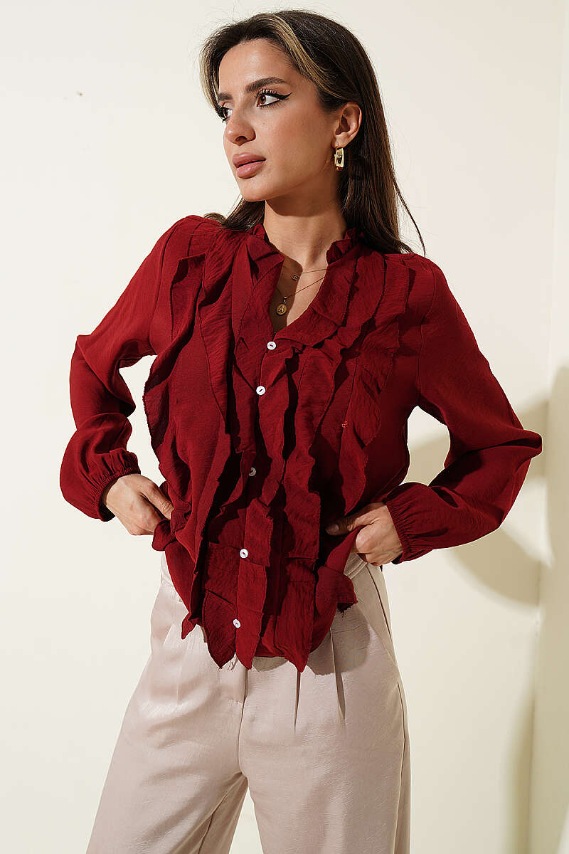 Önü Fırfırlı Uzun Kol Bluz Bordo