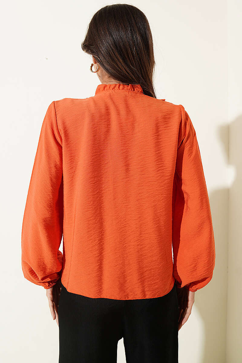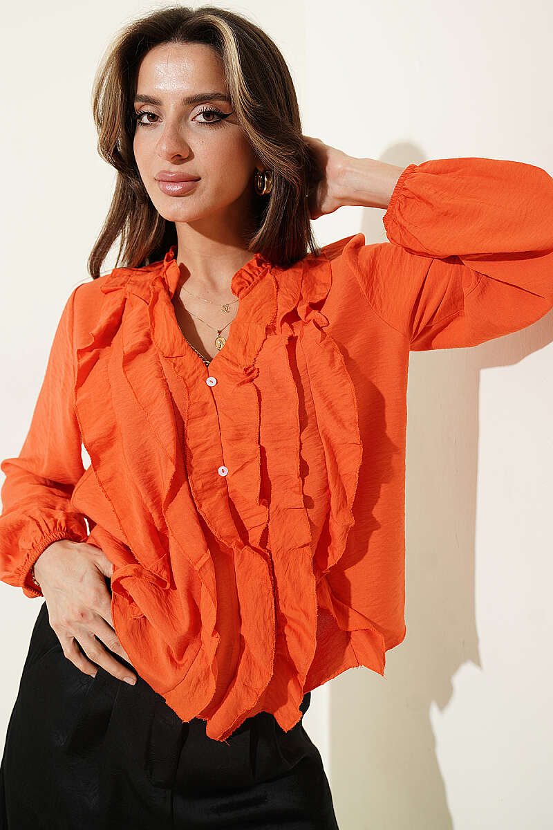 Önü Fırfırlı Uzun Kol Bluz Oranj