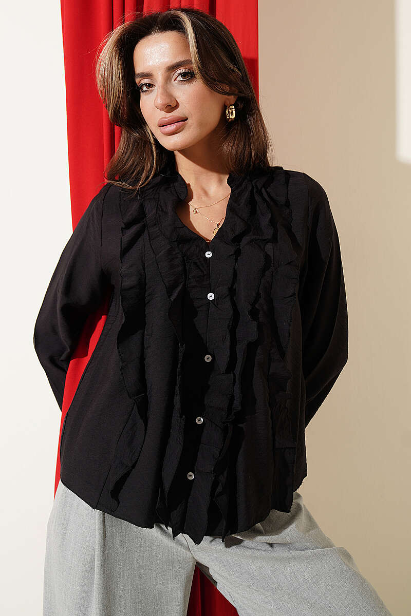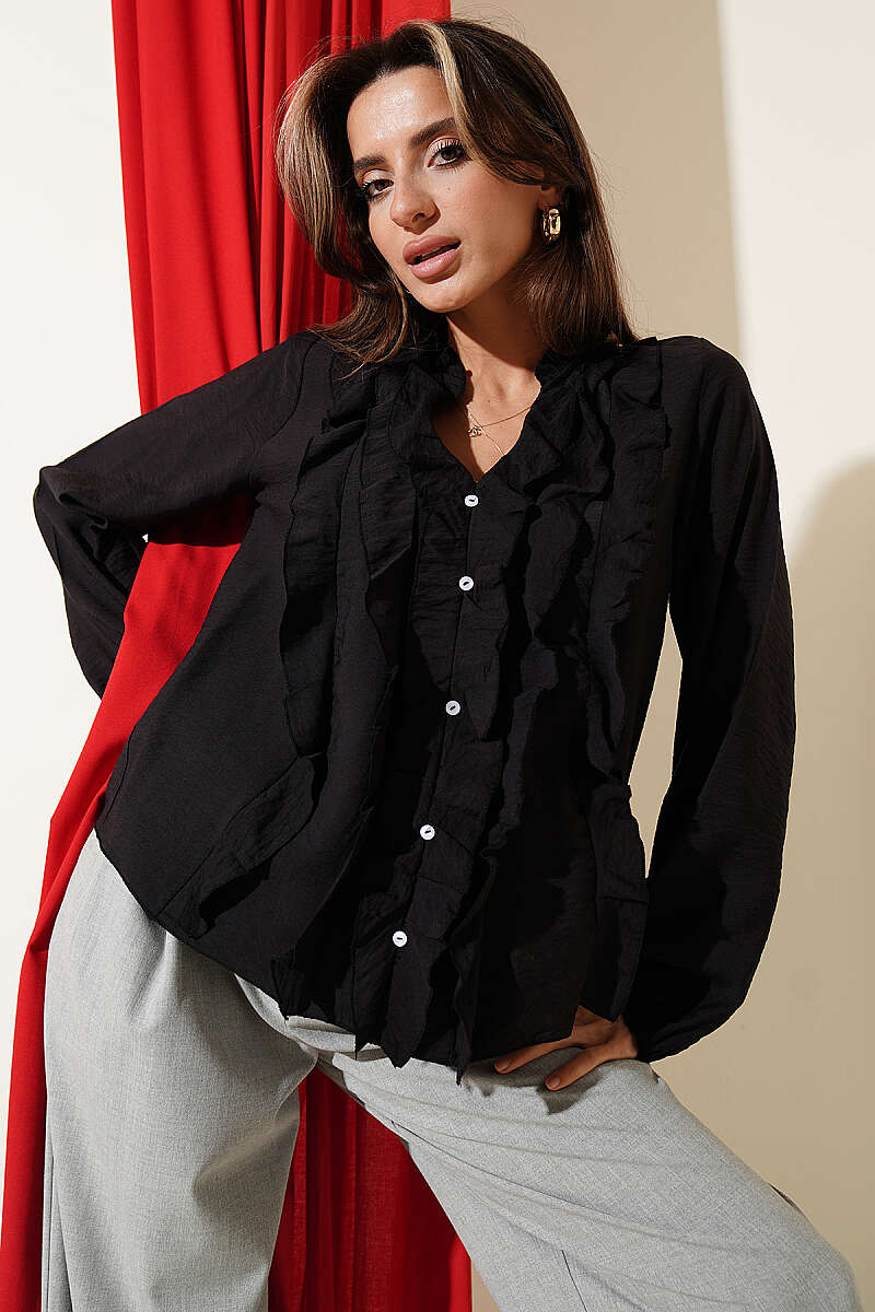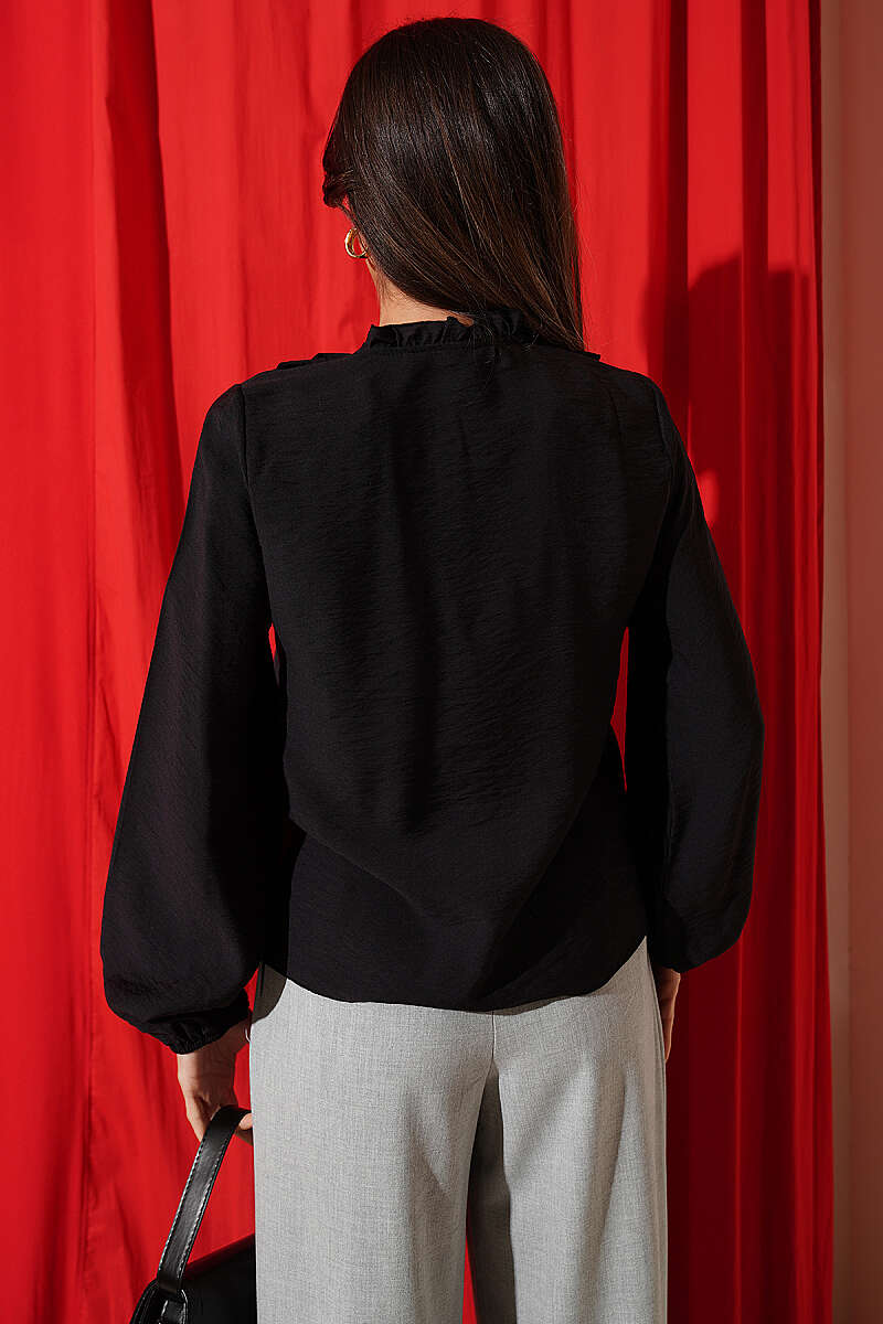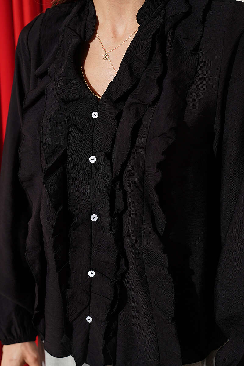 Önü Fırfırlı Uzun Kol Bluz Siyah