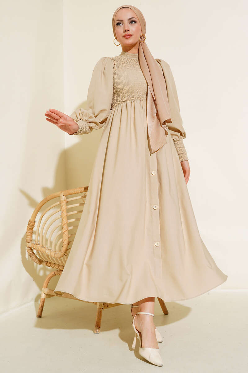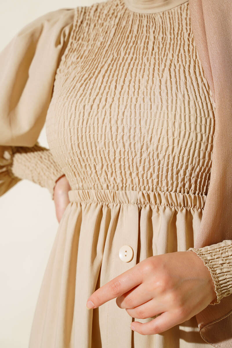 Yeni sezon elbisemiz şık tasarımıyla sizlerle birlikte. Elbisemizin önü ve kol bilekleri gipelidir. Beli lastiklidir. Dik yakadır. Enseden düğmelidir. Elbisemizin eteğinde düğme detayı vardır. Astarsızdır. Şık ve sportif elbisemiz renk seçenekleriyle dolabınızda sizi bekliyor.