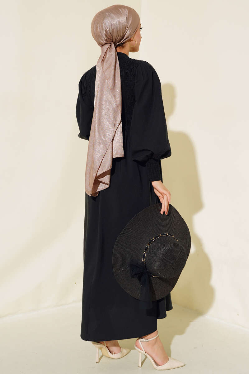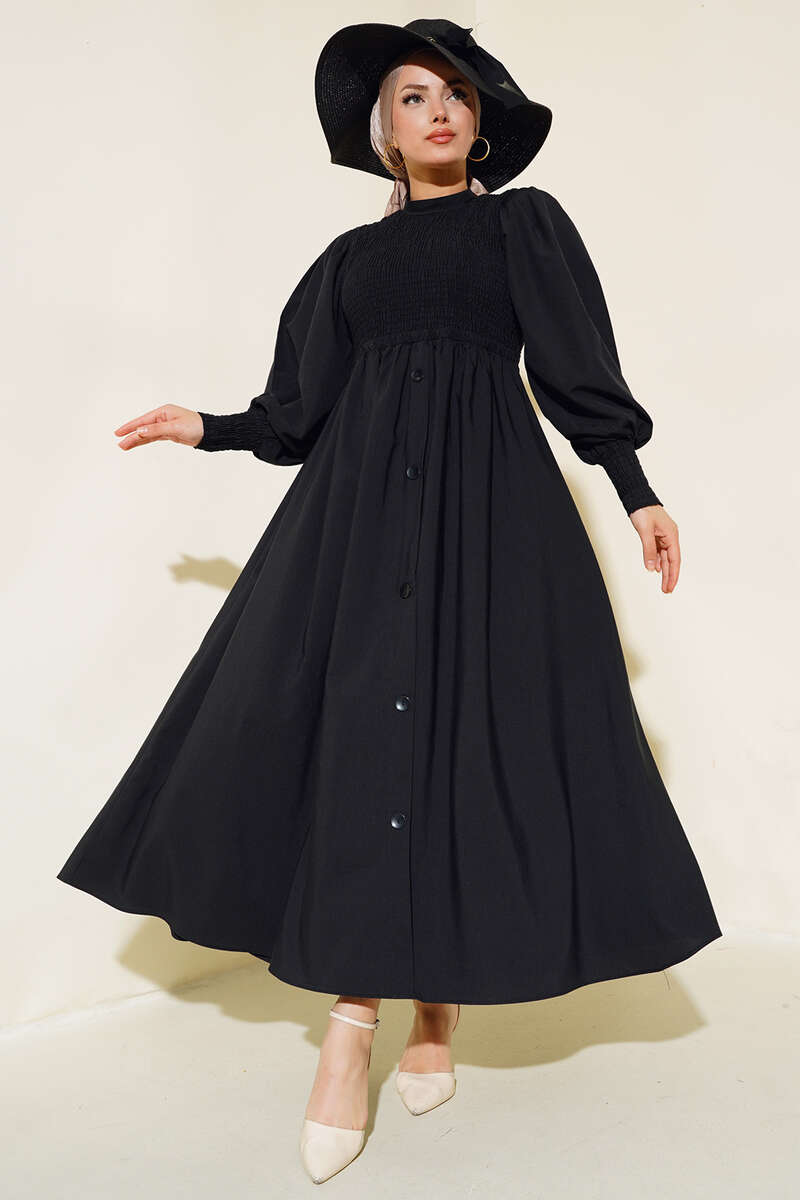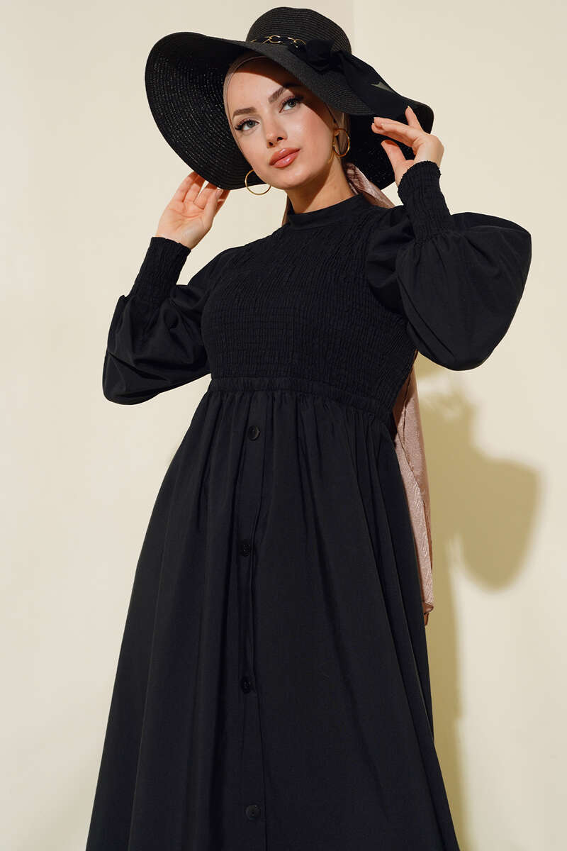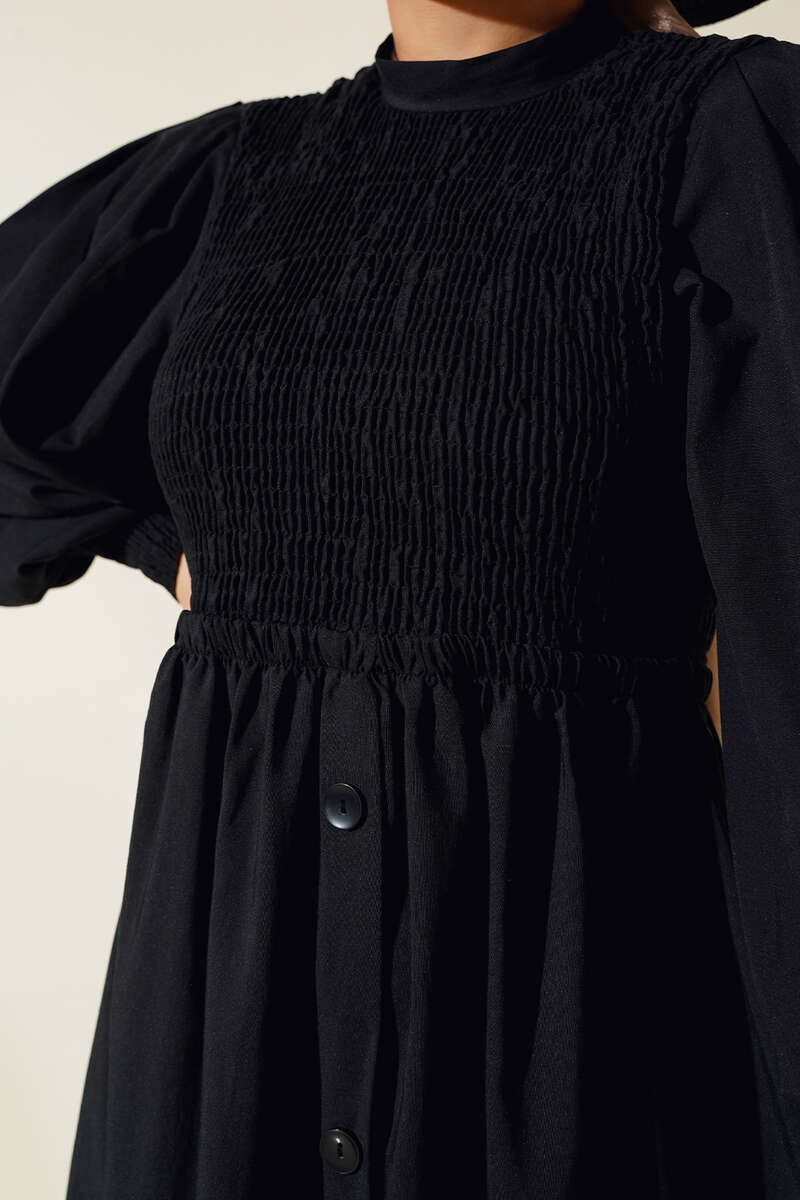 Yeni sezon elbisemiz şık tasarımıyla sizlerle birlikte. Elbisemizin önü ve kol bilekleri gipelidir. Beli lastiklidir. Dik yakadır. Enseden düğmelidir. Elbisemizin eteğinde düğme detayı vardır. Astarsızdır. Şık ve sportif elbisemiz renk seçenekleriyle dolabınızda sizi bekliyor.