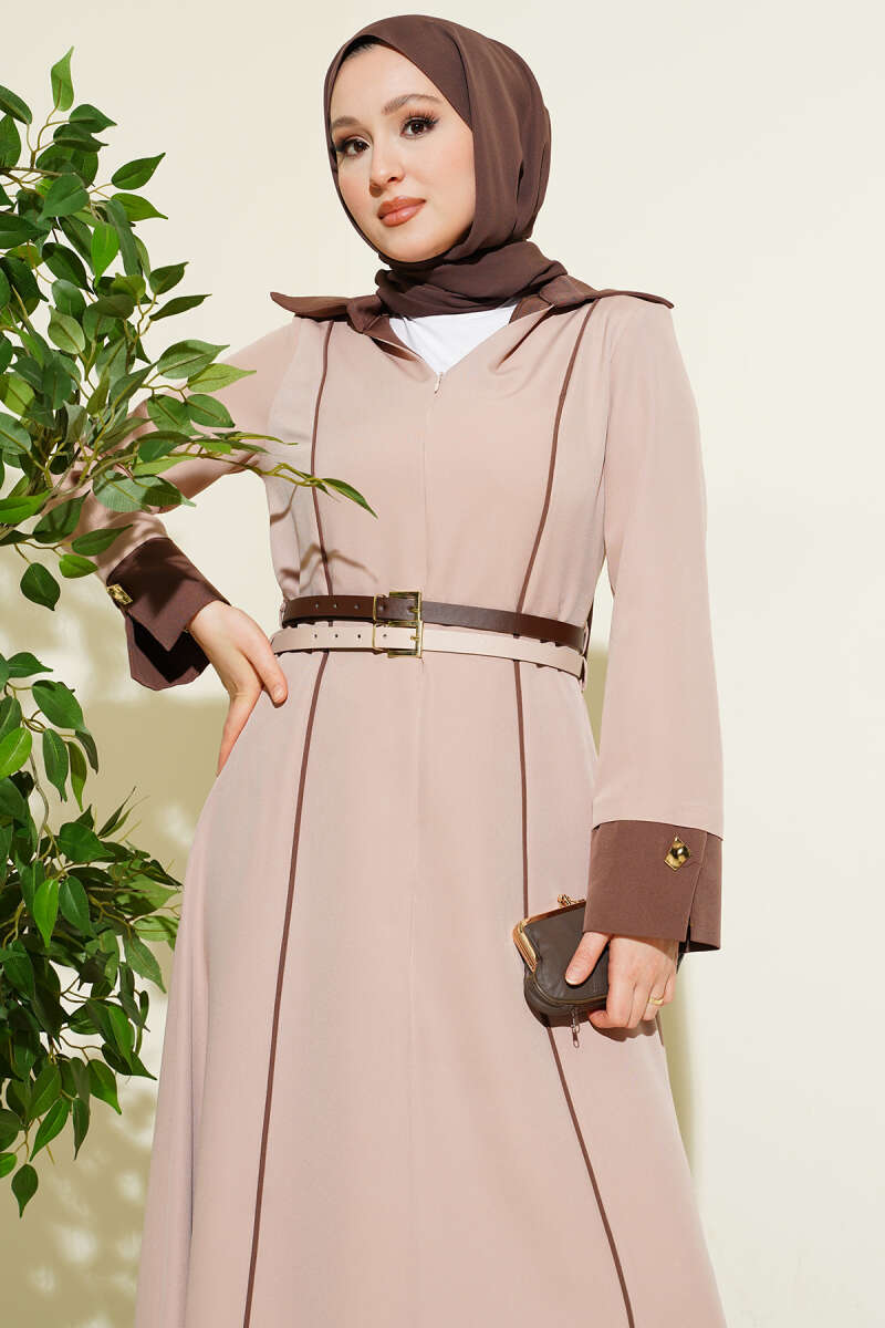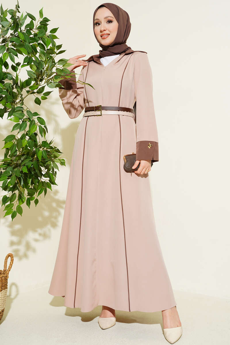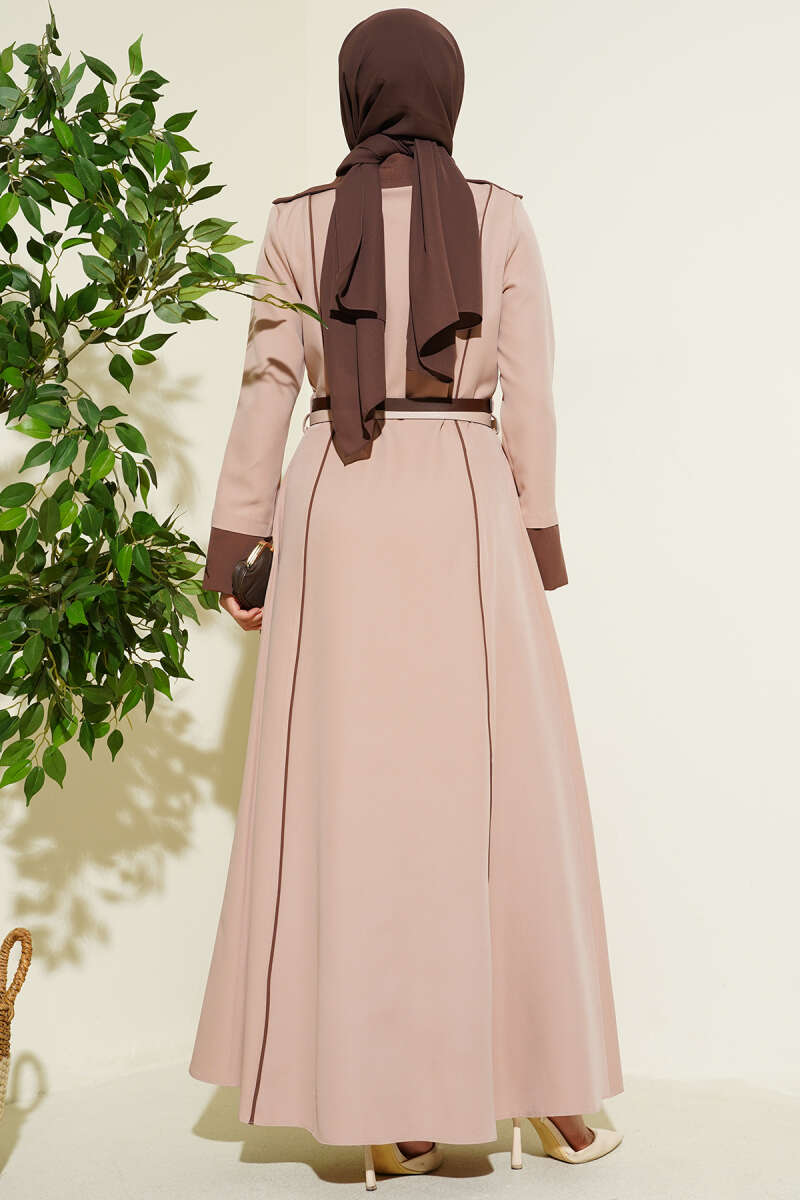 Önü Gizli Fermuarlı Çift Kemerli Elbise Pudra