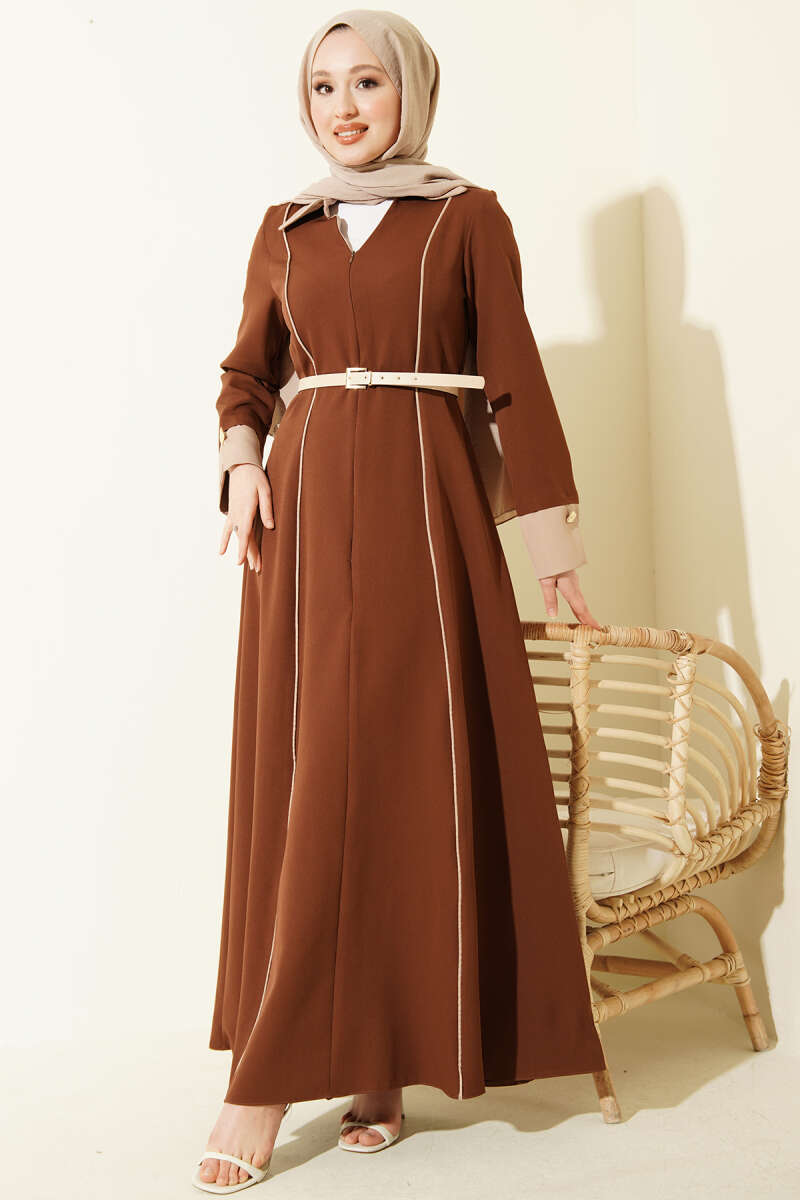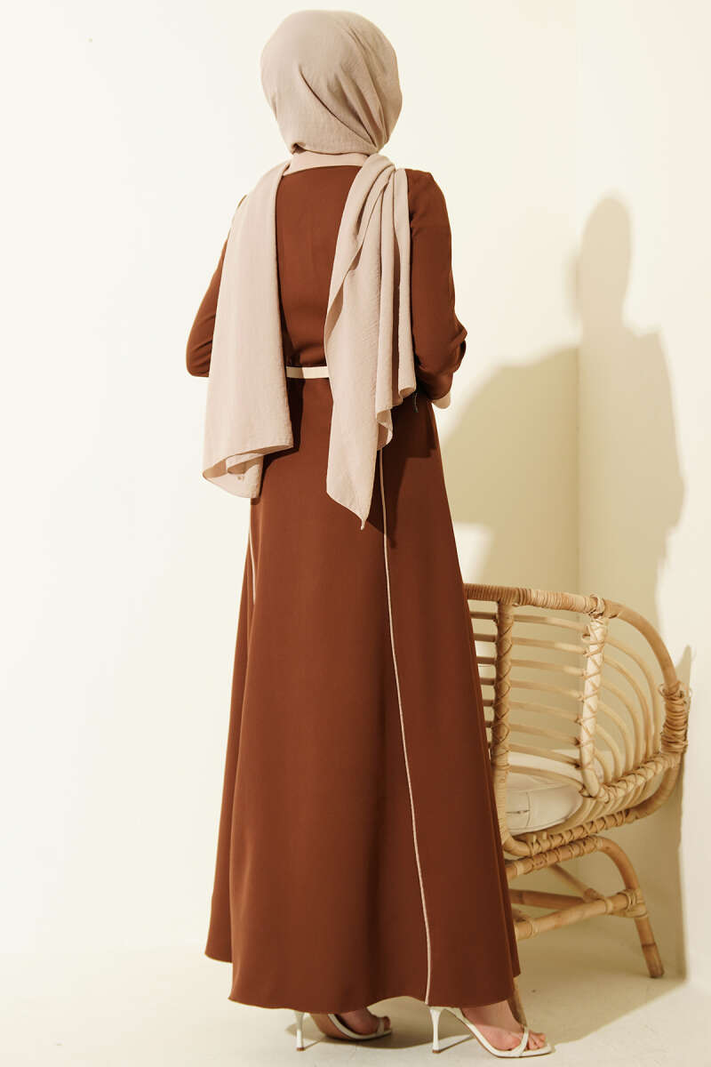Önü Gizli Fermuarlı Tek Kemerli Elbise Kahve