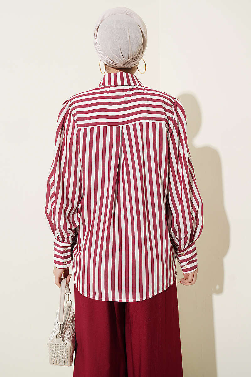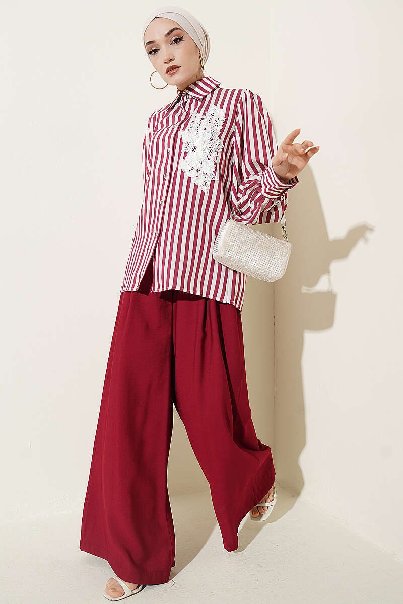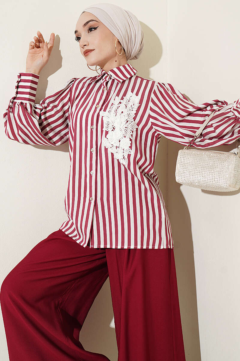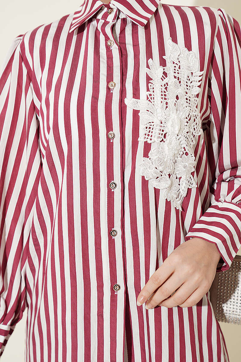 Önü Güpürlü Çizgili Gömlek Bordo
