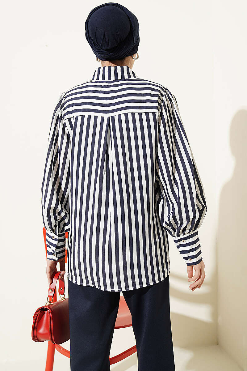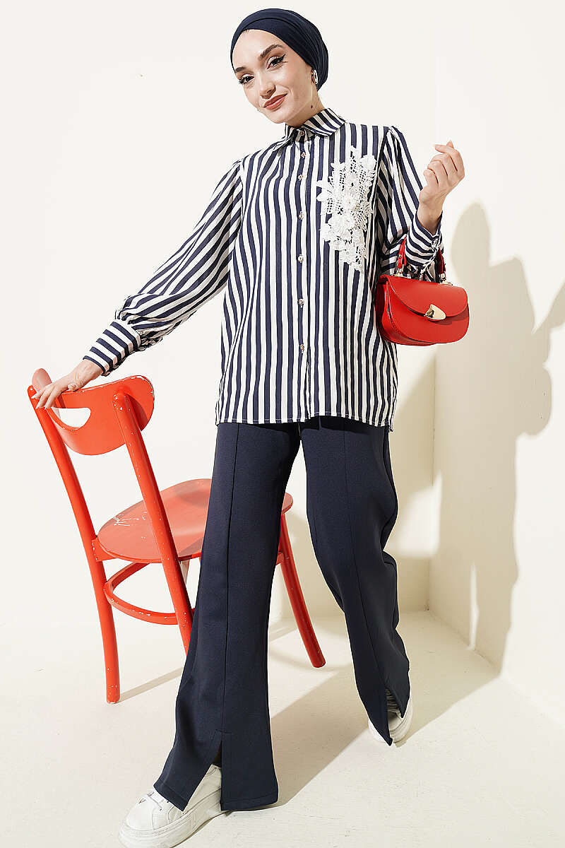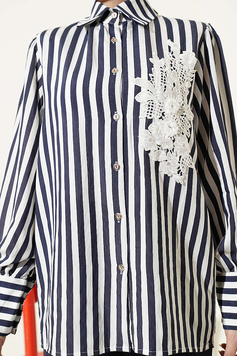 Önü Güpürlü Çizgili Gömlek Lacivert
