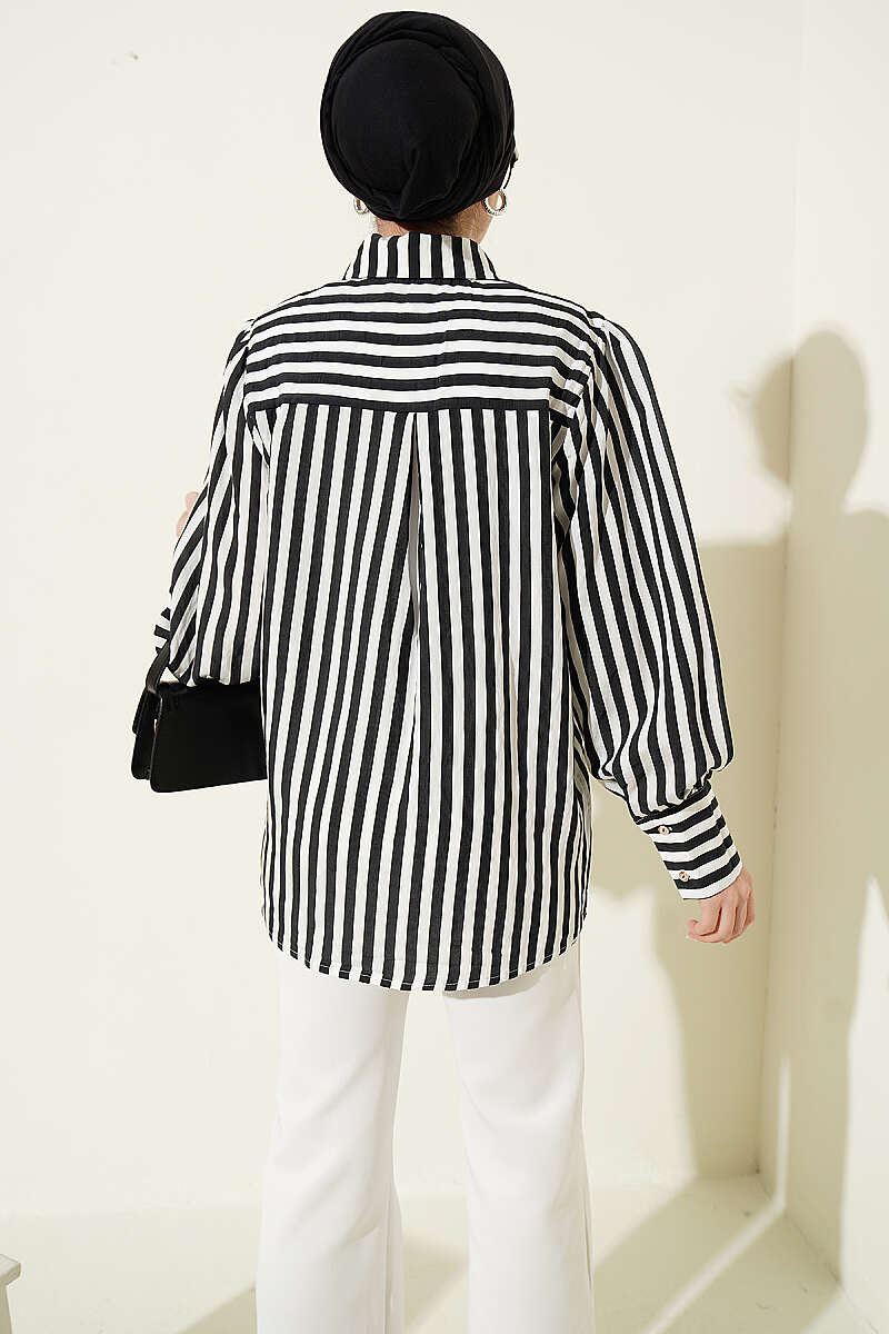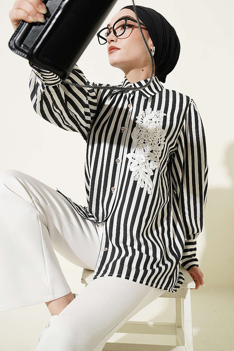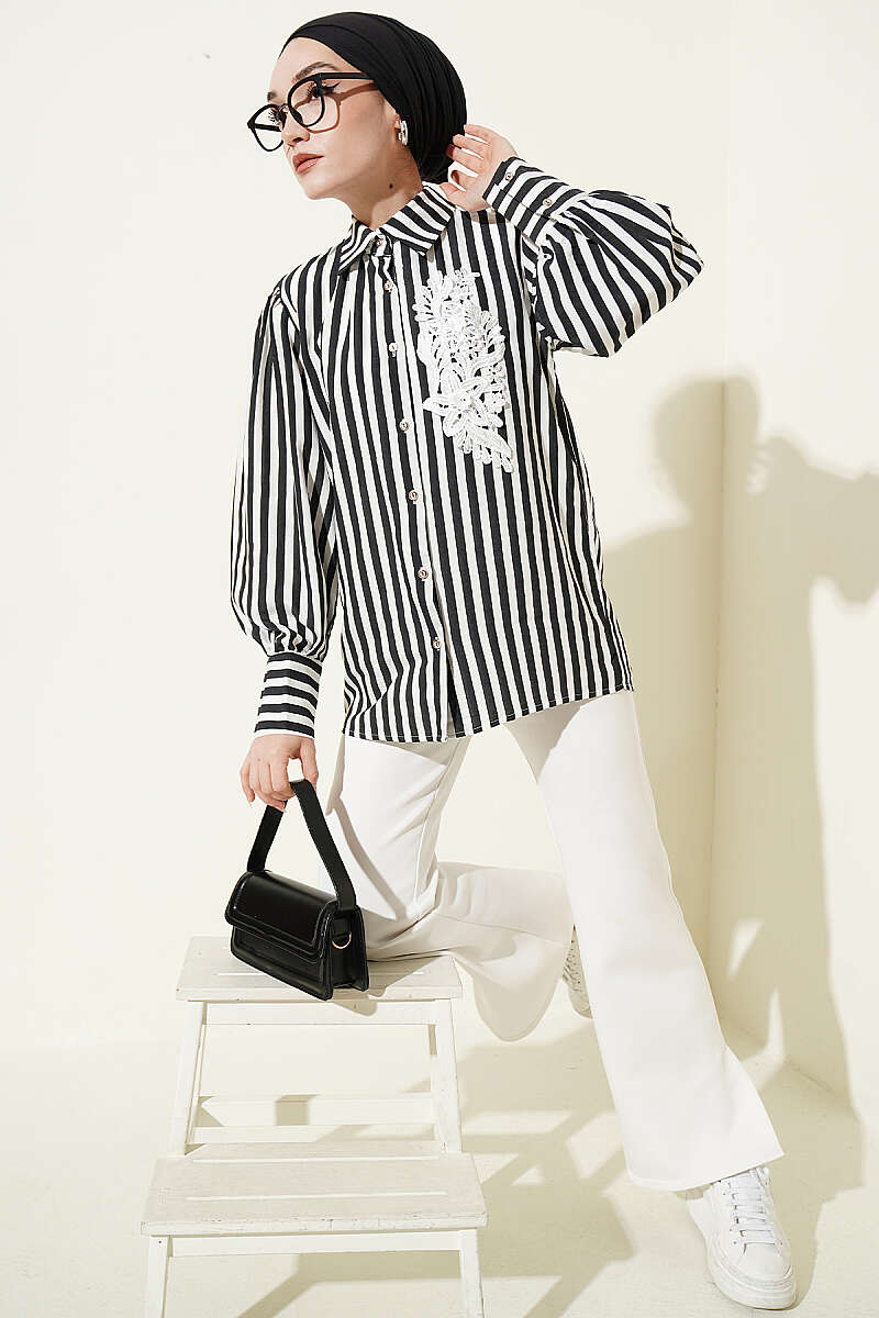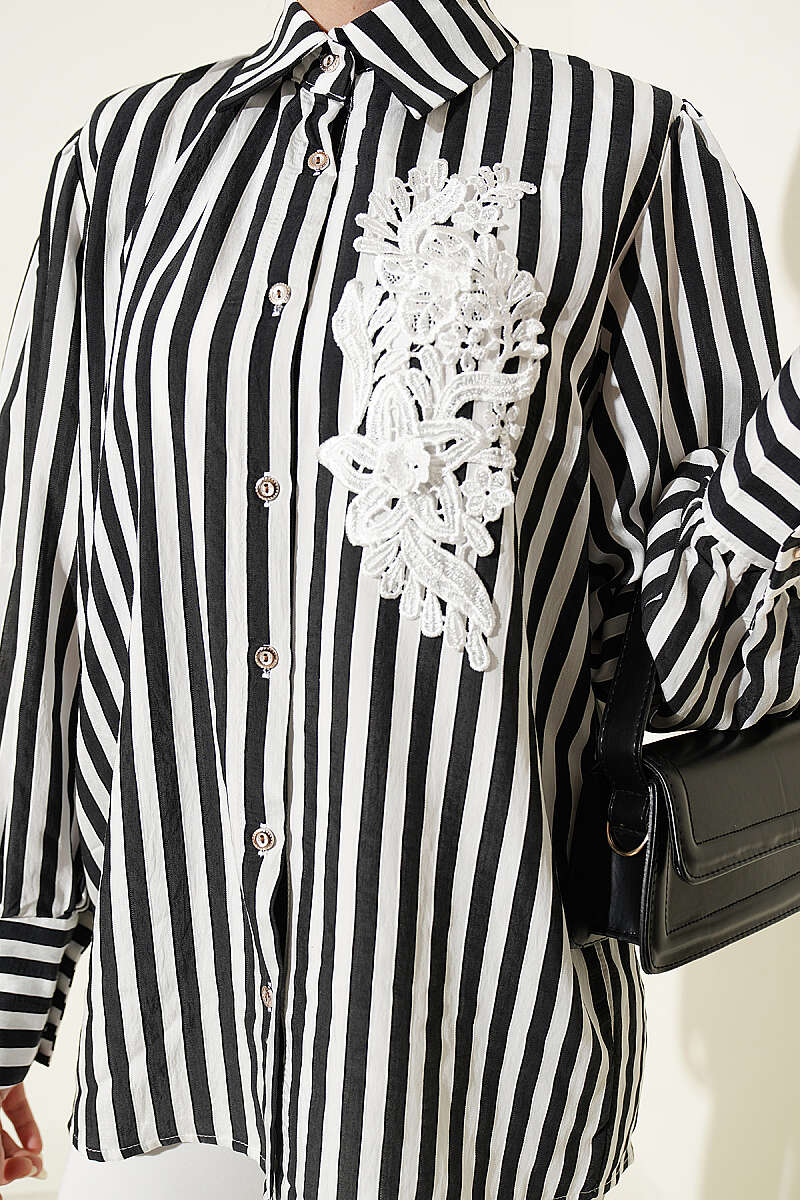 Önü Güpürlü Çizgili Gömlek Siyah