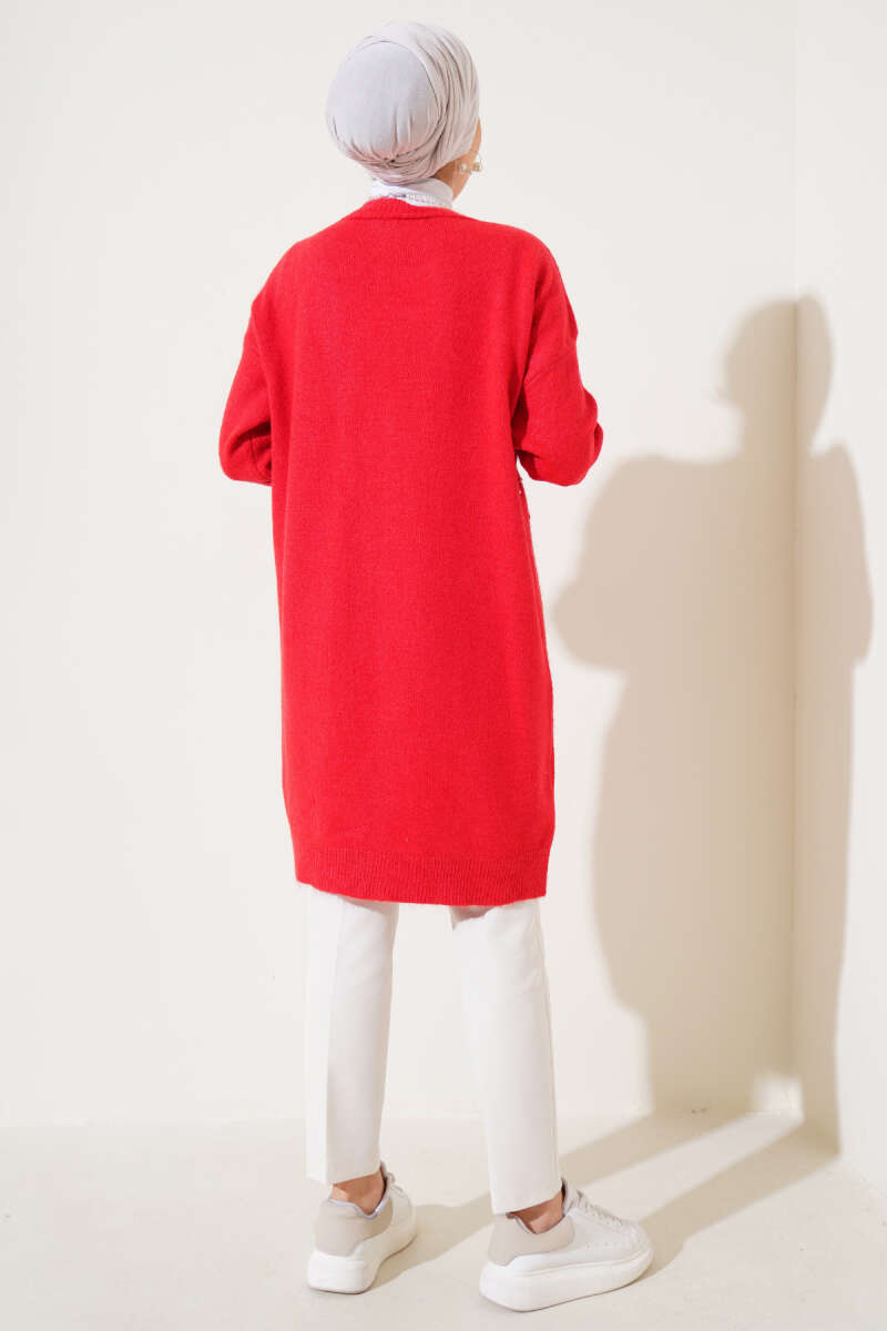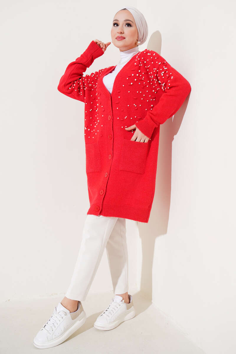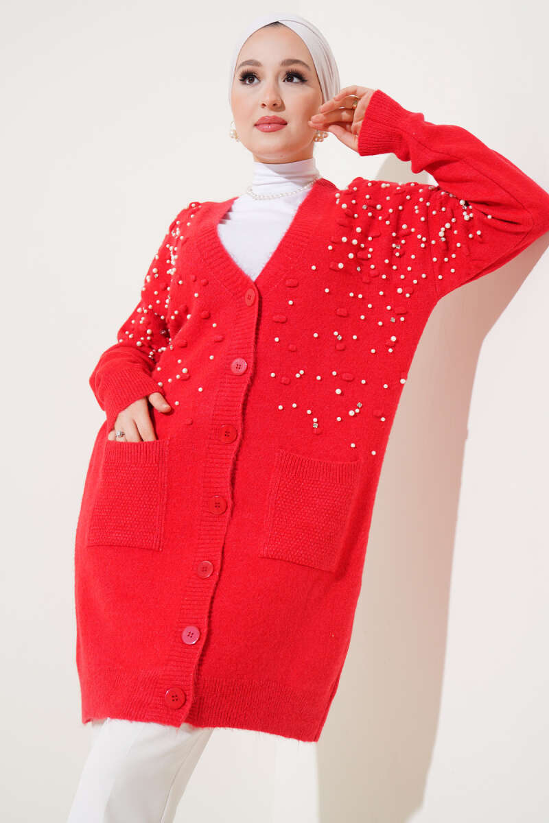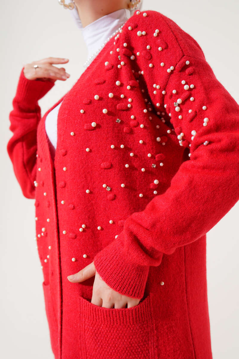 Önü İnci Süslemeli Düğmeli Triko Hırka Kırmızı