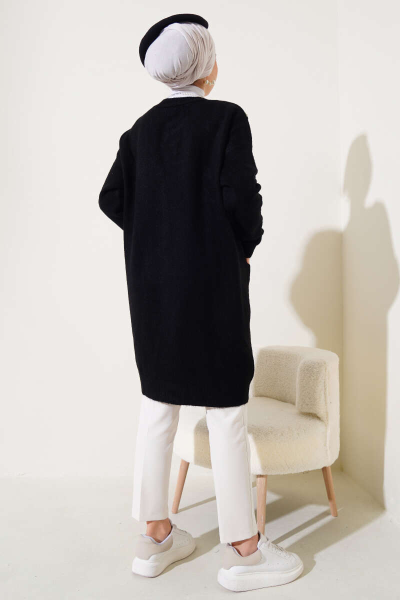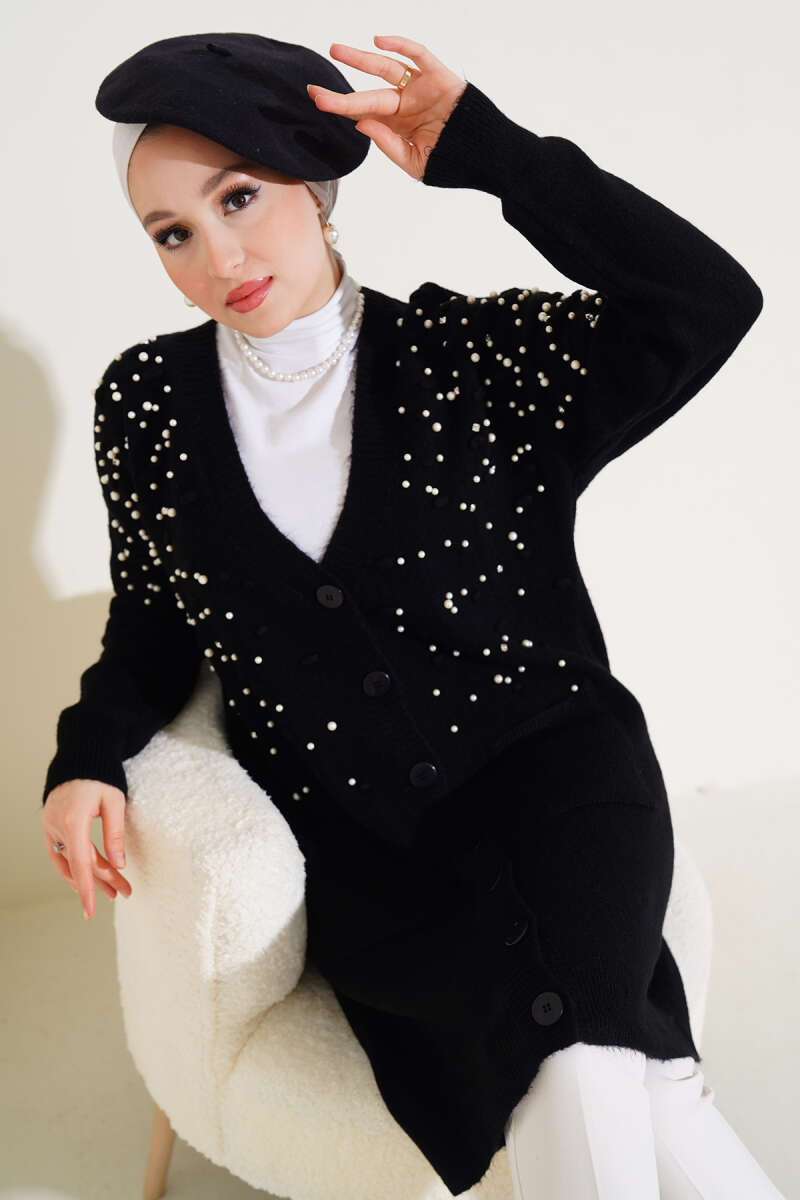 Önü İnci Süslemeli Düğmeli Triko Hırka Siyah