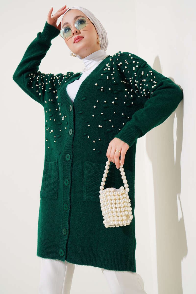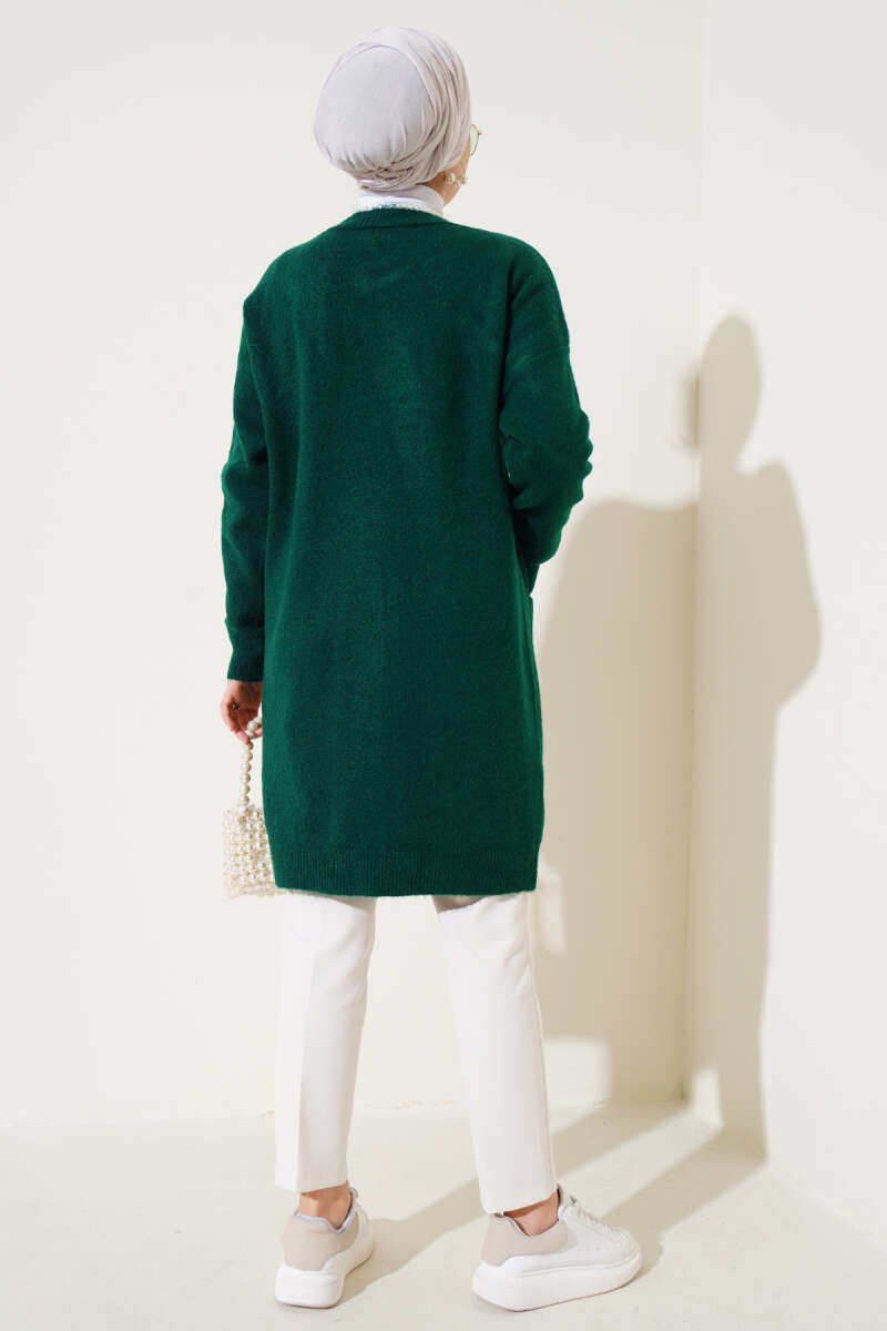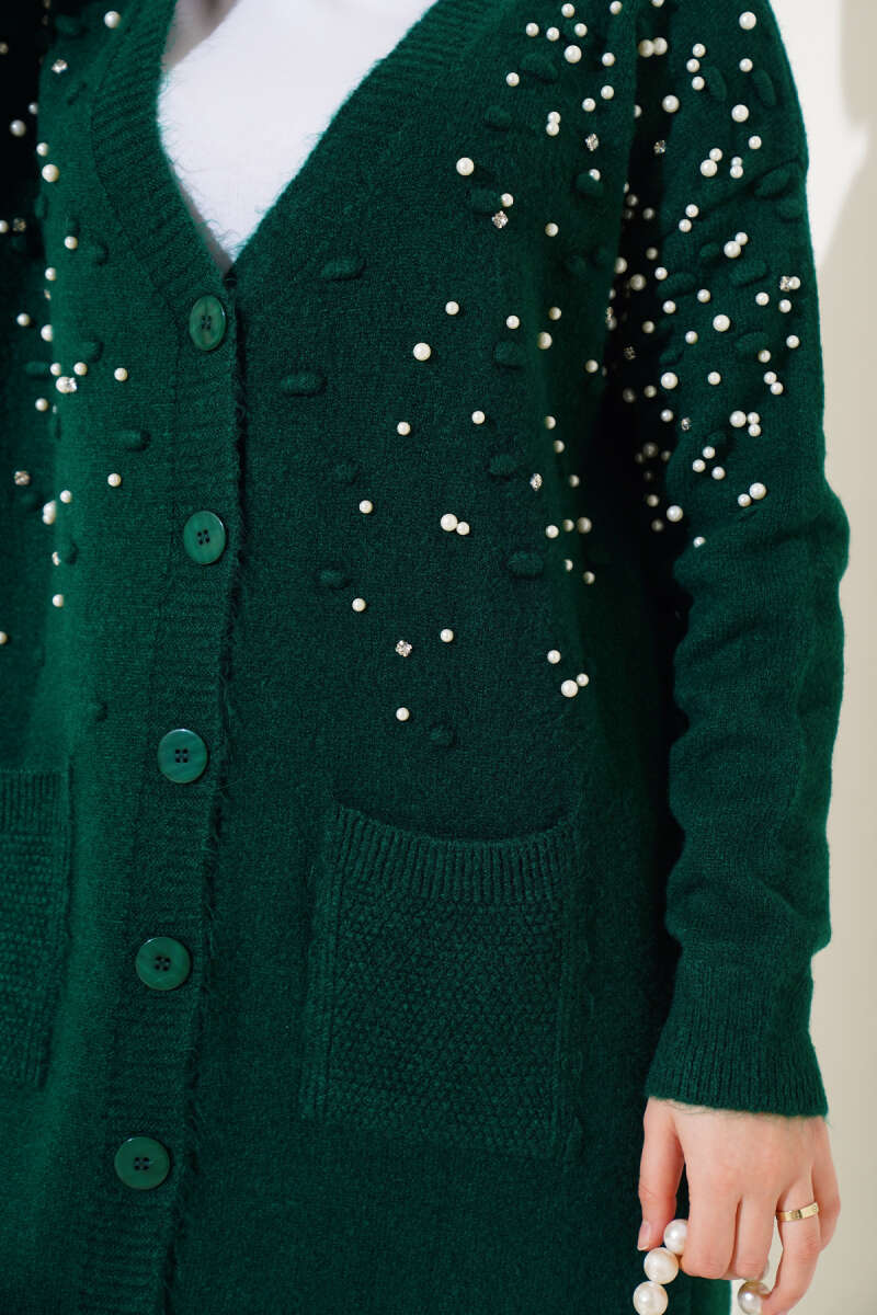 Çiçek Nakışlı Düğmeli Merserize Hırka Zümrüt
