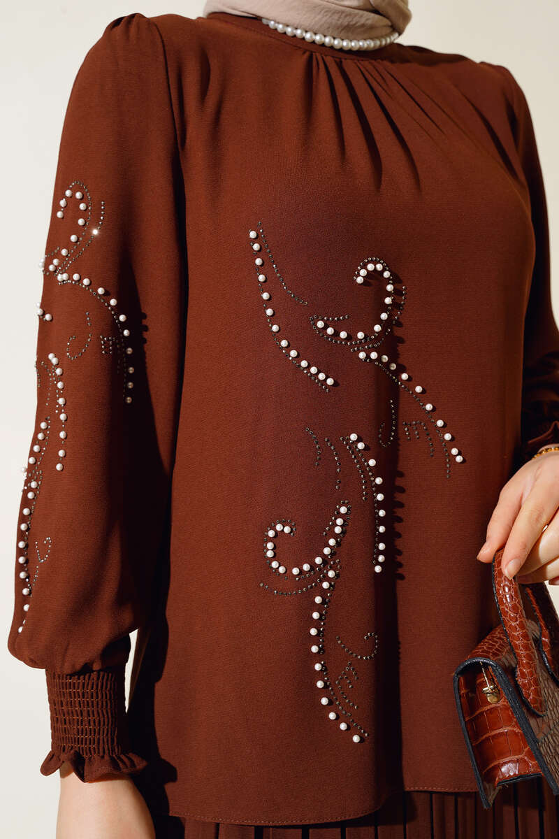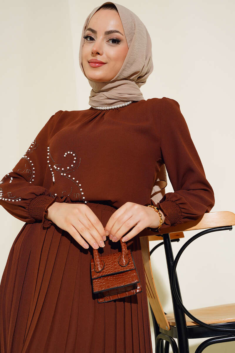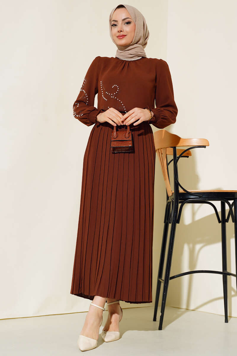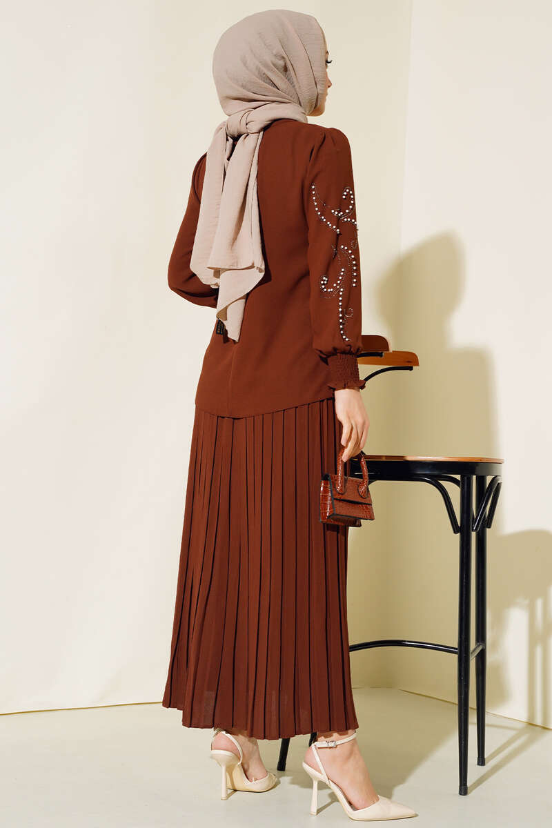 Yeni sezon ikili takım modeli sizlerle beraber. Tuniğimizin önü inci ve taşlı olup şıklık kazanmıştır. Kolları esneyen lastiklidir. Dik yaka olup yakası hafif pilelidir. Eteğimizin beli lastiklidir. Piliselidir. Astarsız modeldir. Renk seçenekleri mevcut olan ikili takım modelimiz dolaplarınızda yerlerini beklemektedir.