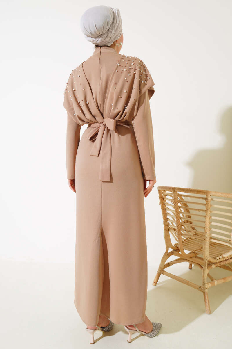 Kolları Fiyonk Detaylı Selanik Elbise Kahve