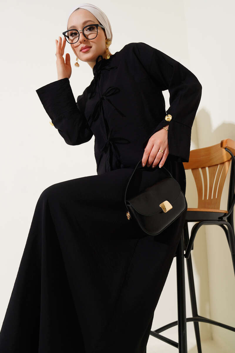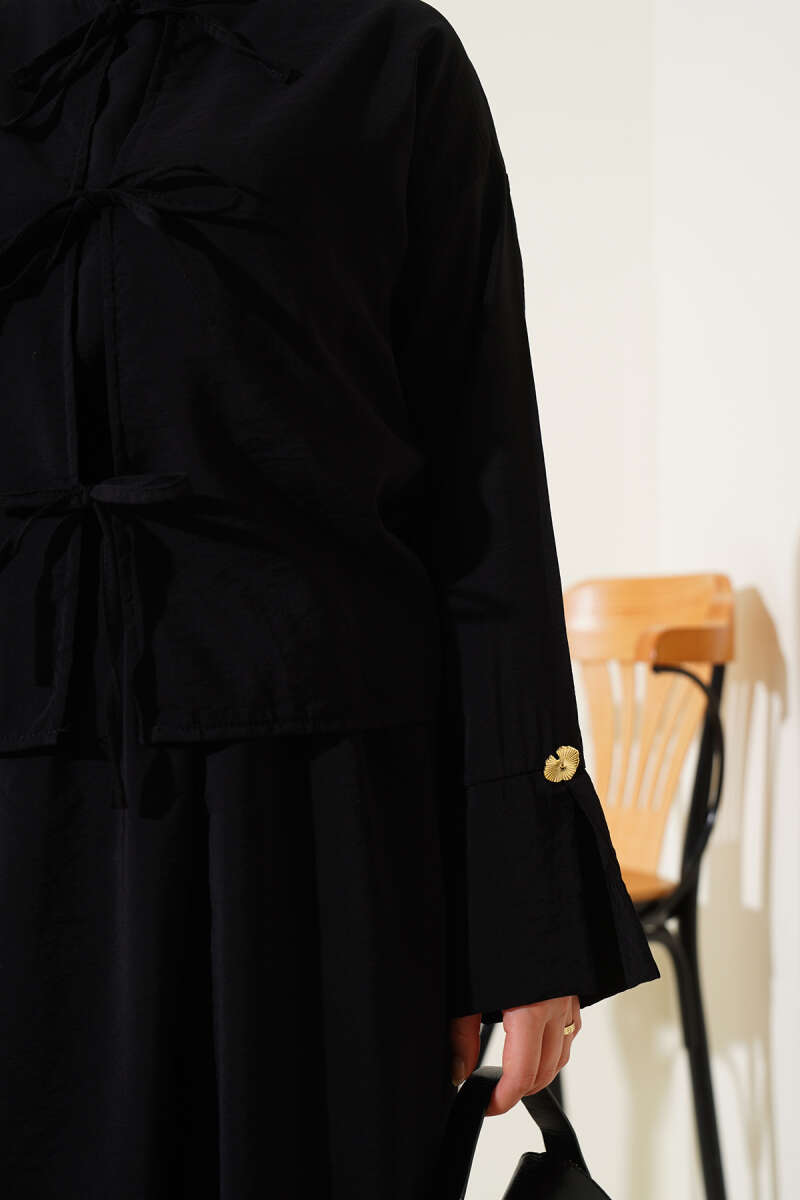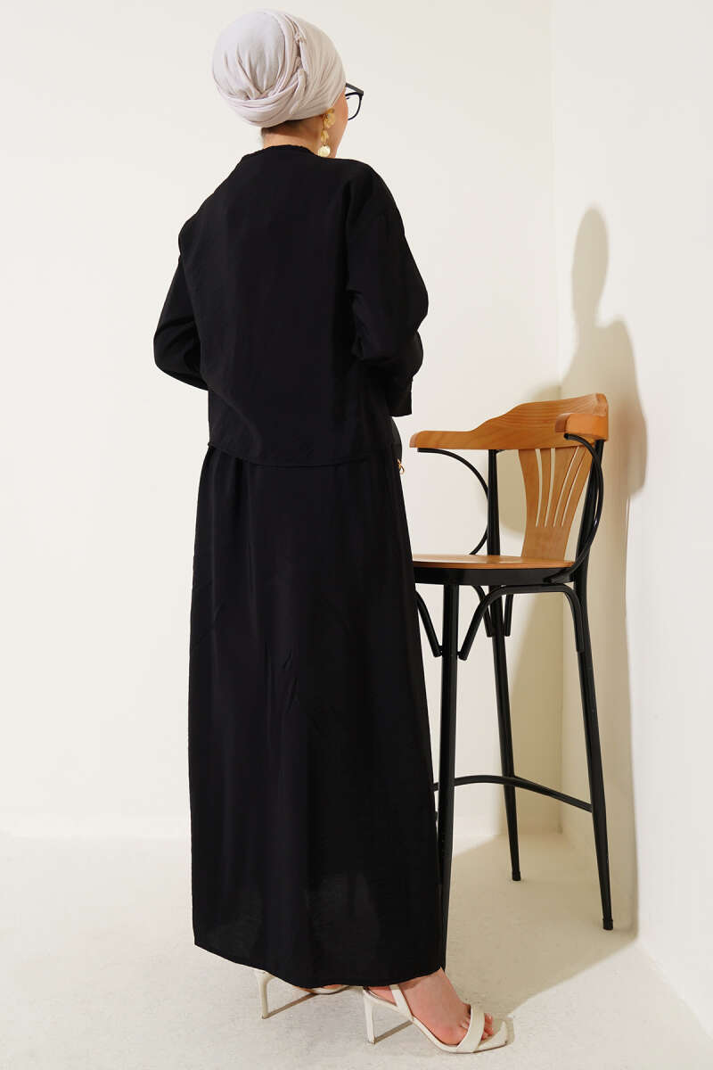İnci Çiçekli Bel Tünelli Etekli Takım Siyah