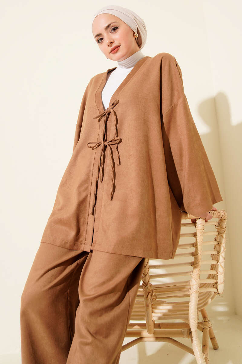 İnci Çiçekli Bel Tünelli Etekli Takım Kahve