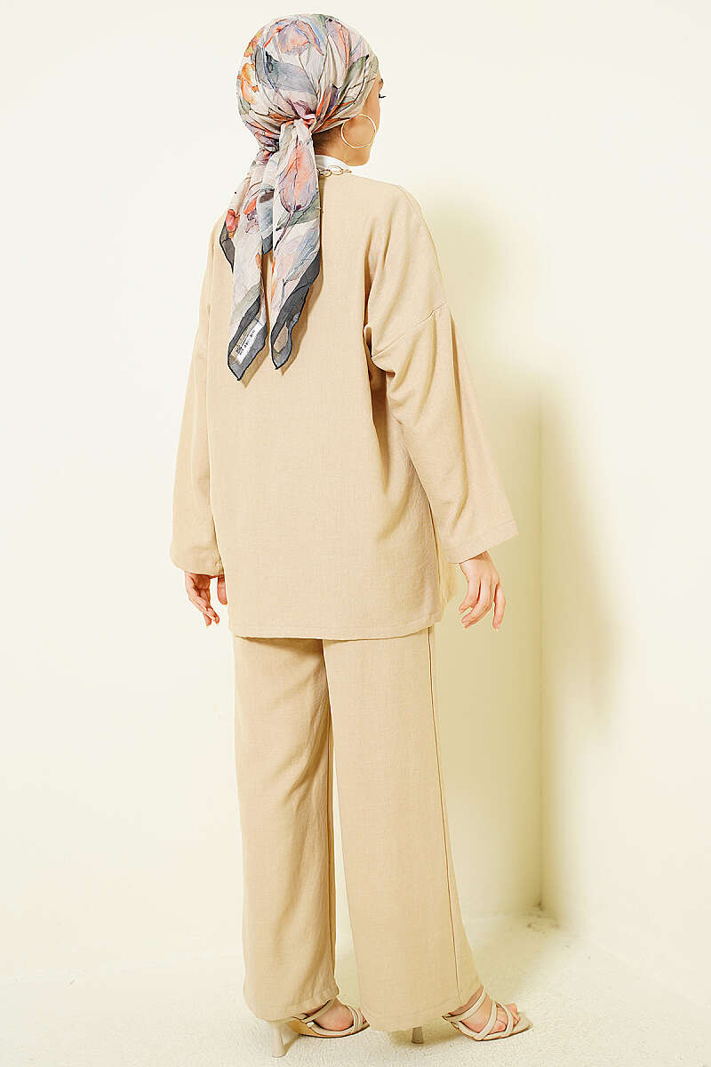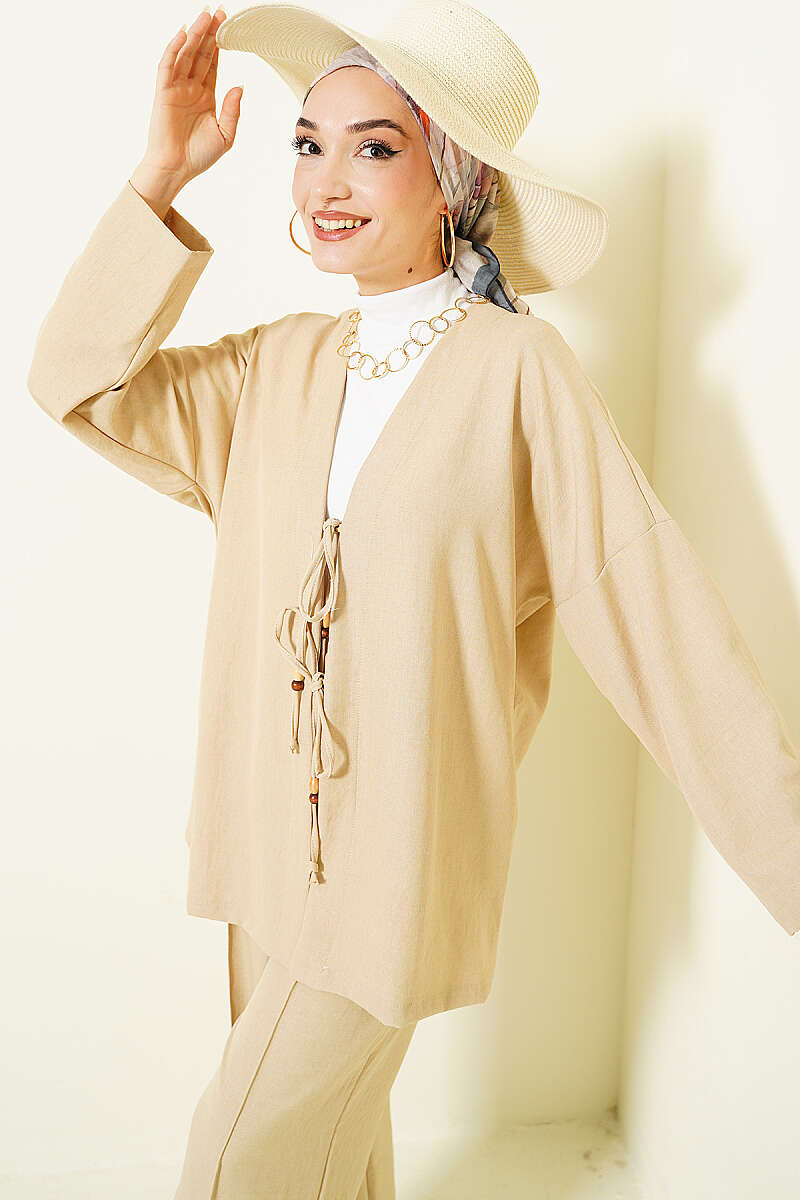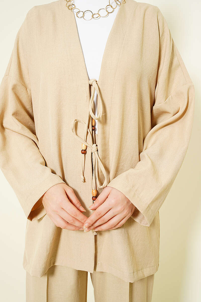 Önü İp Bağlamalı Kimono İkili Takım Bej