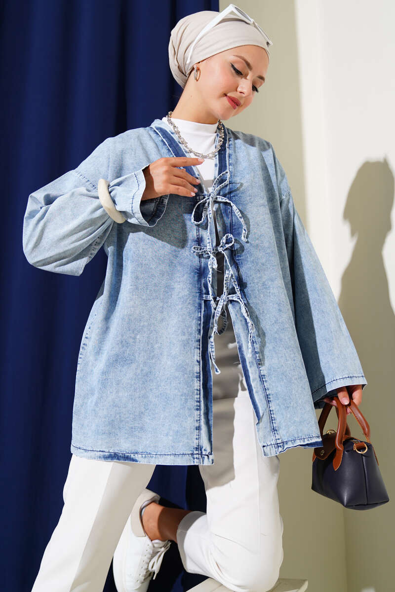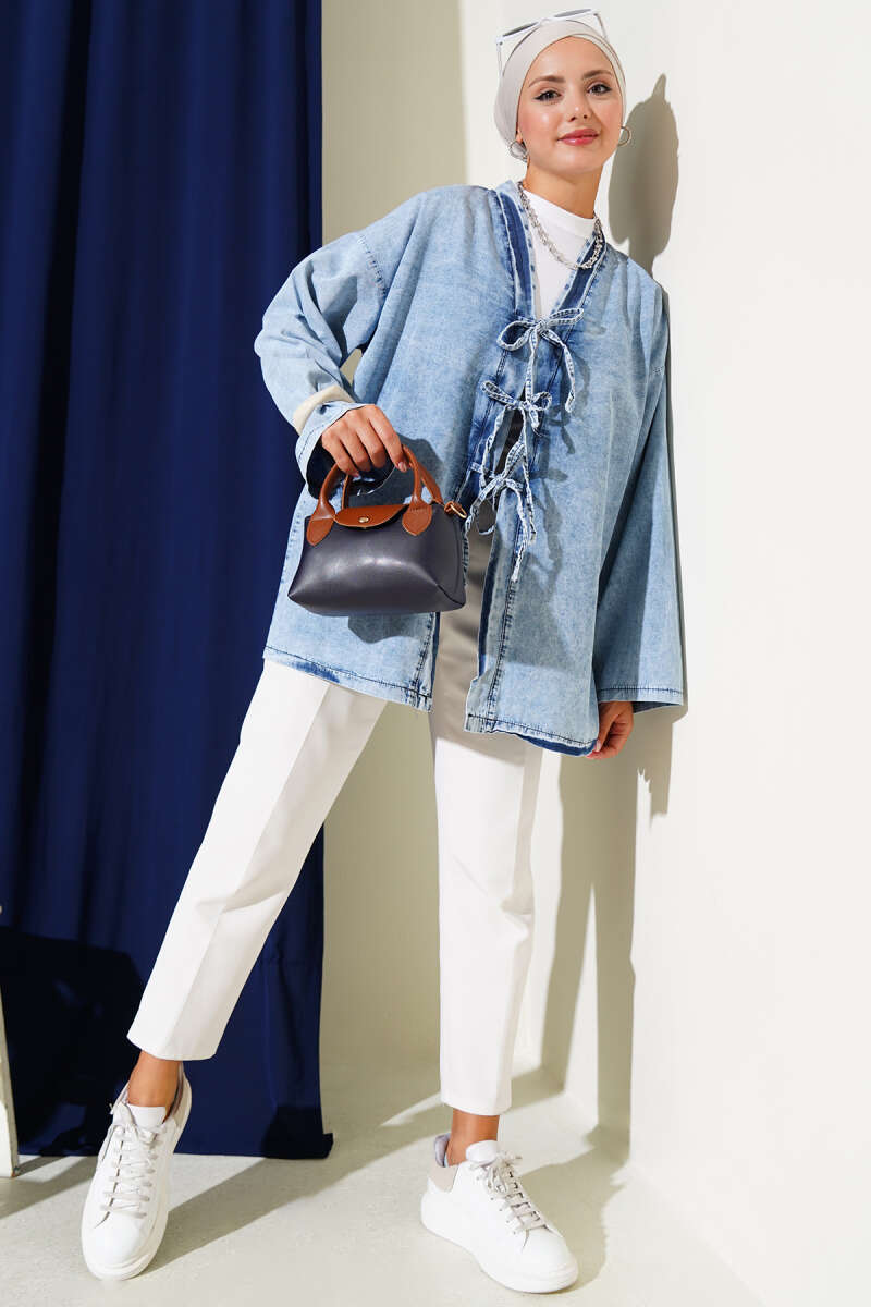Önü İp Bağlamalı Kot Kimono Orta Mavi