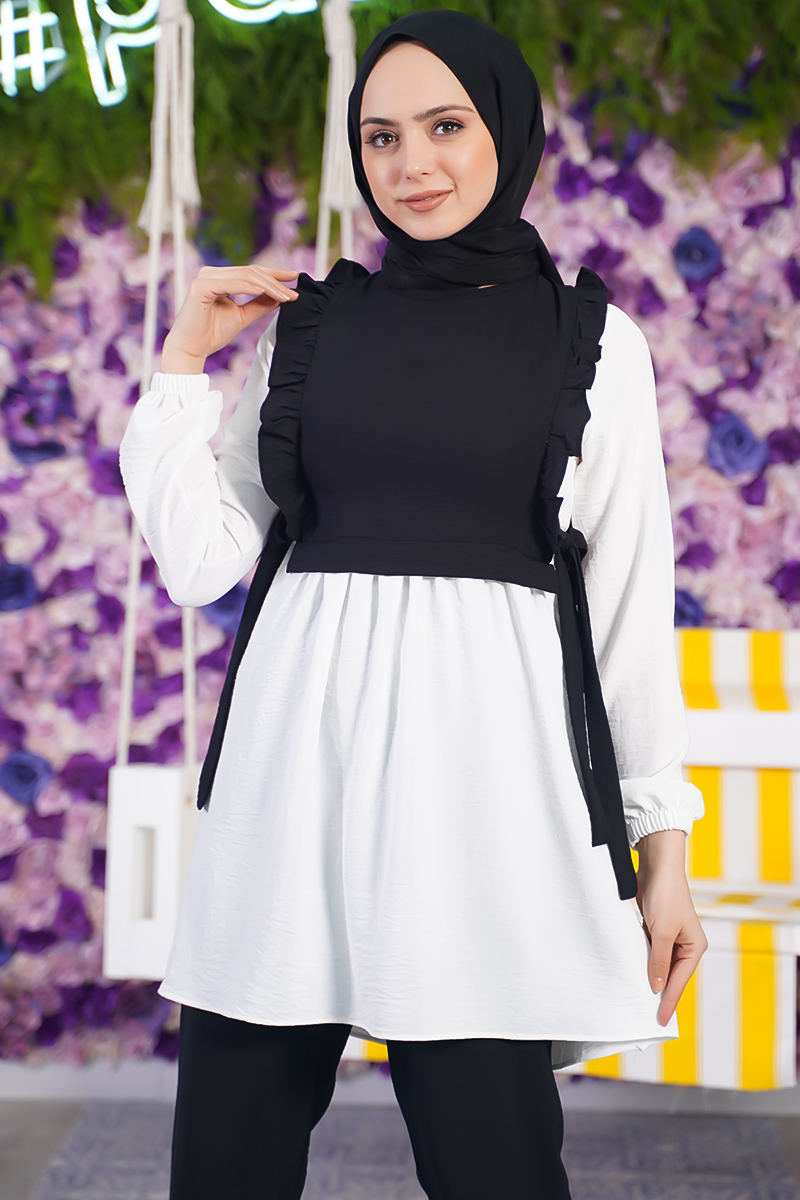 Yeni sezon ikili takımımız omuzdan bele inen fırfıryla dikkat çekmektedir. Yanları kuşaklı olan takımımızın kol uçları lastiklidir. Ense kısmında düğme bulunmaktadır. Pantolunumuz normal paçadır ve beli lastiklidir.
