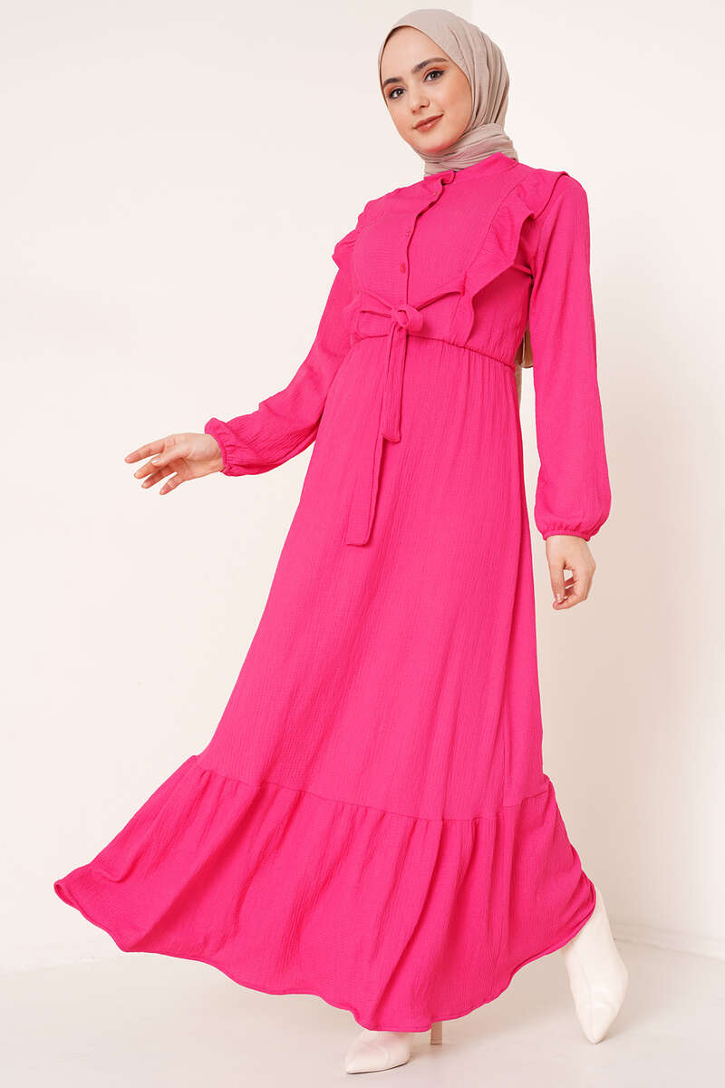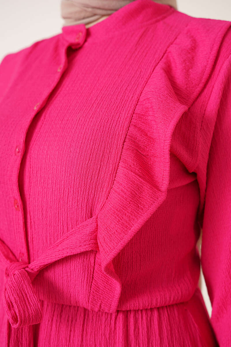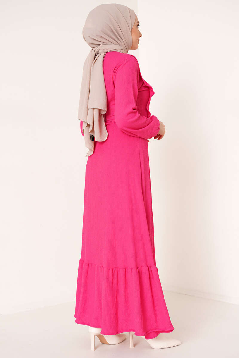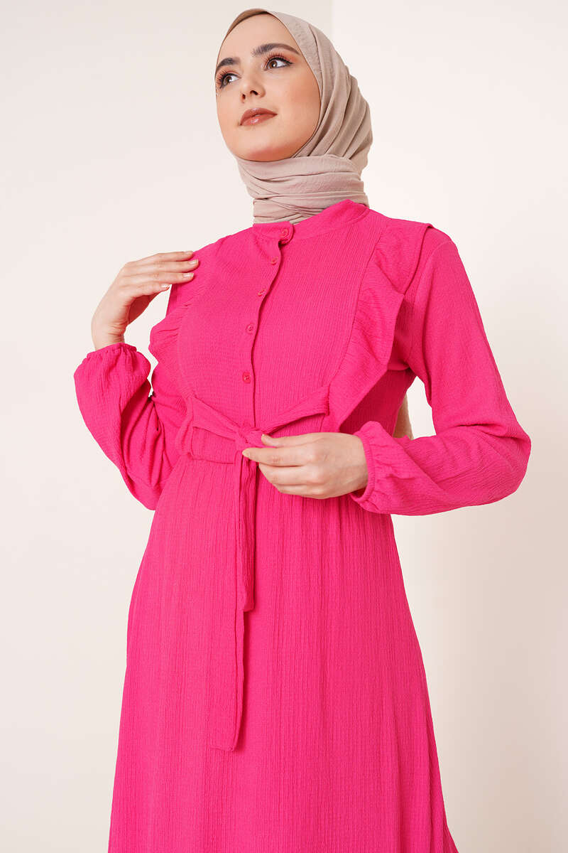 Önü Kendinden Kuşaklı Elbise Fuşya