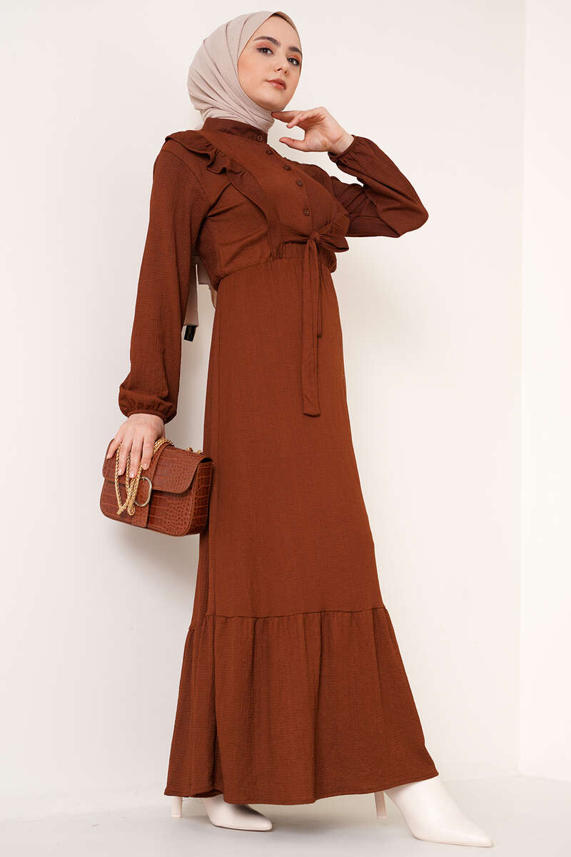 Yeni sezon elbise önü kendinden kuşaklıdır. Göğsünde fırfır detayı bulunan elbisemizin beli ve bilek kısımları lastiklidir. Hakim yaka olan elbisemiz düğmelidir. Tek parçada şık olmanın anahtarı elbisemizin renk çeşitleri vardır.